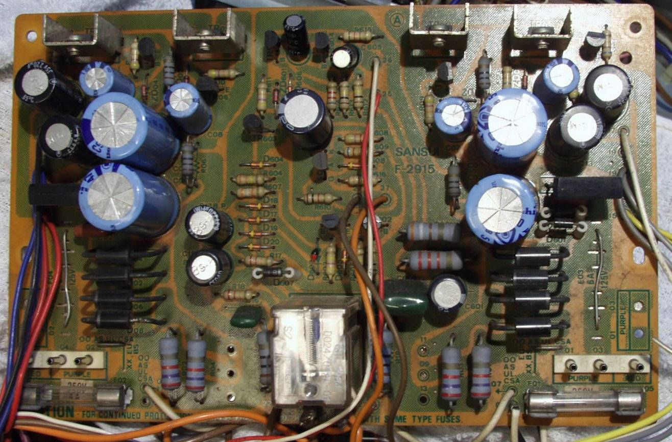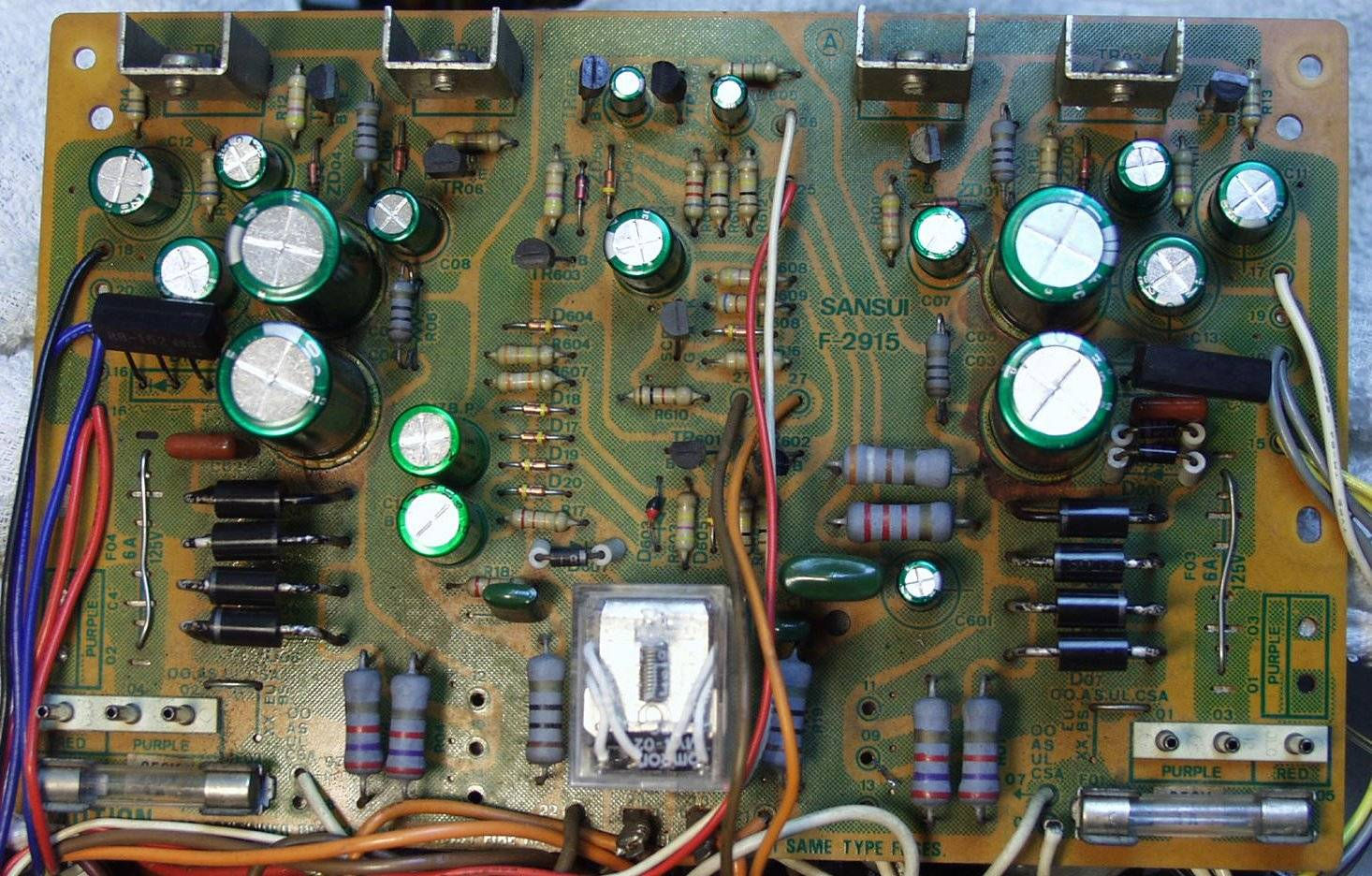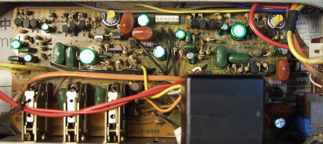 | C−3B. 修理後 電源整流+プロテクト基盤 電解コンデンサー18個 SP接続リレ−交換 |