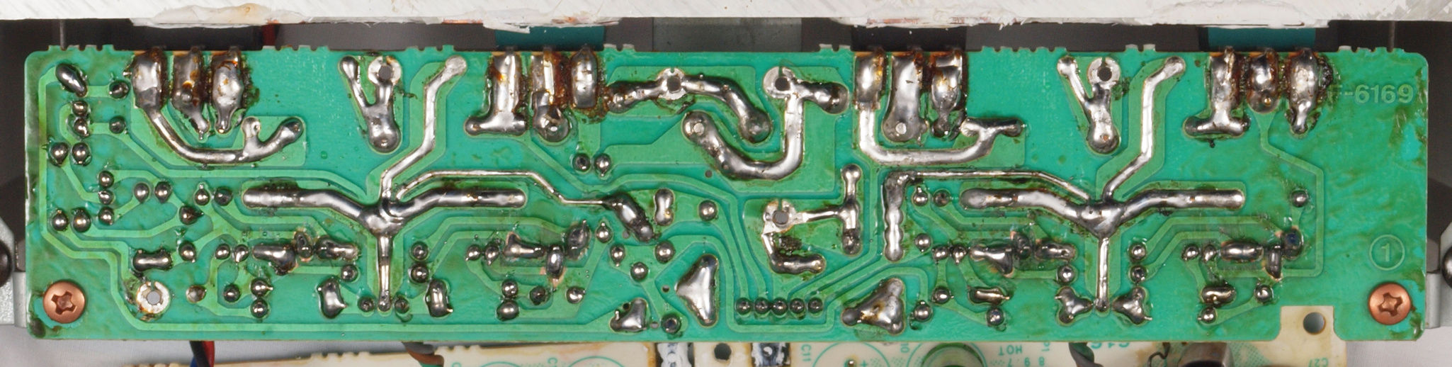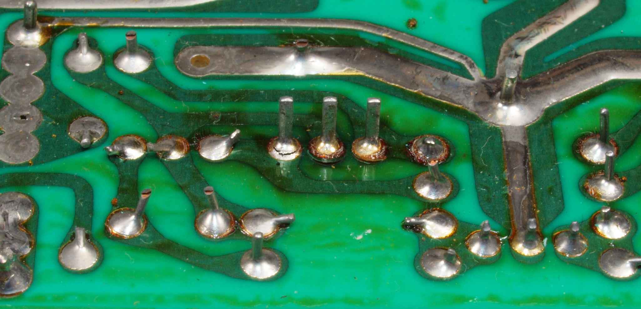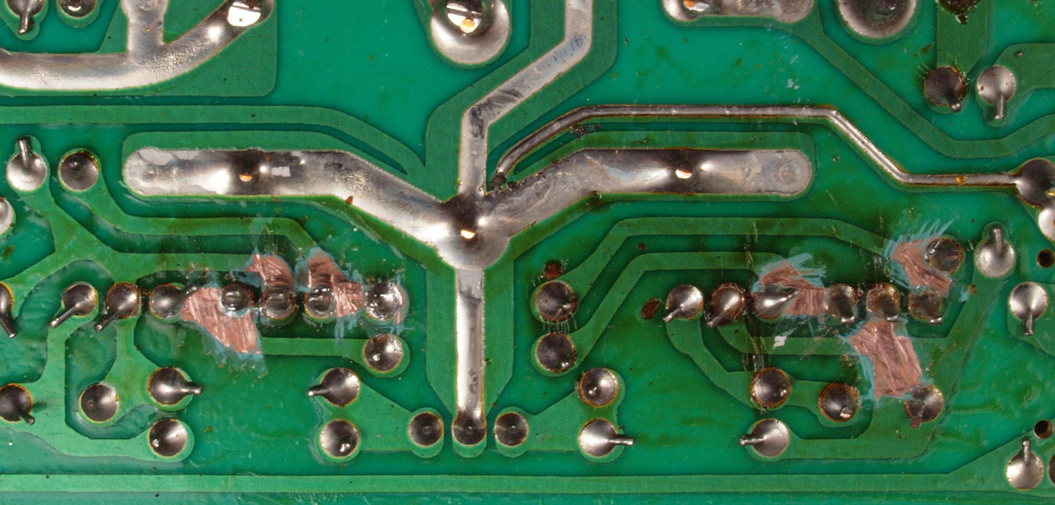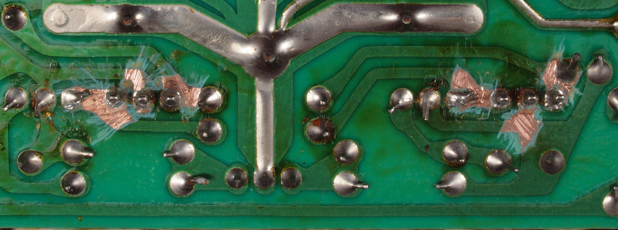 | C634. 修理後 L側ドライブ基板裏。 ドライブTR(トランジスター)の足の銅箔を広げる。 | ||||||||||||||||||||||||||||||||||||||||||||||||||||