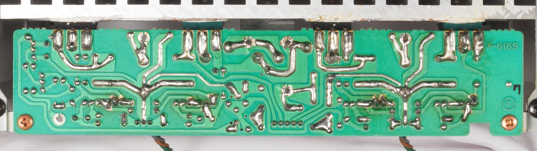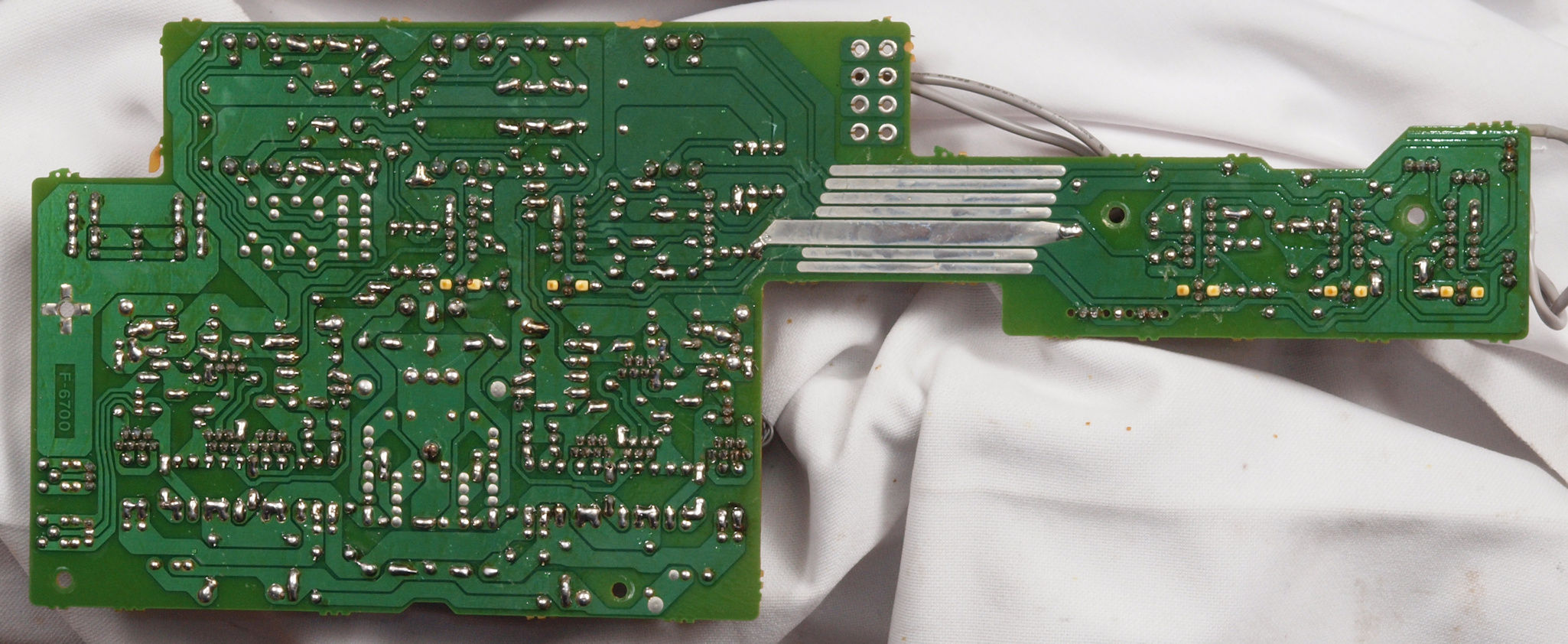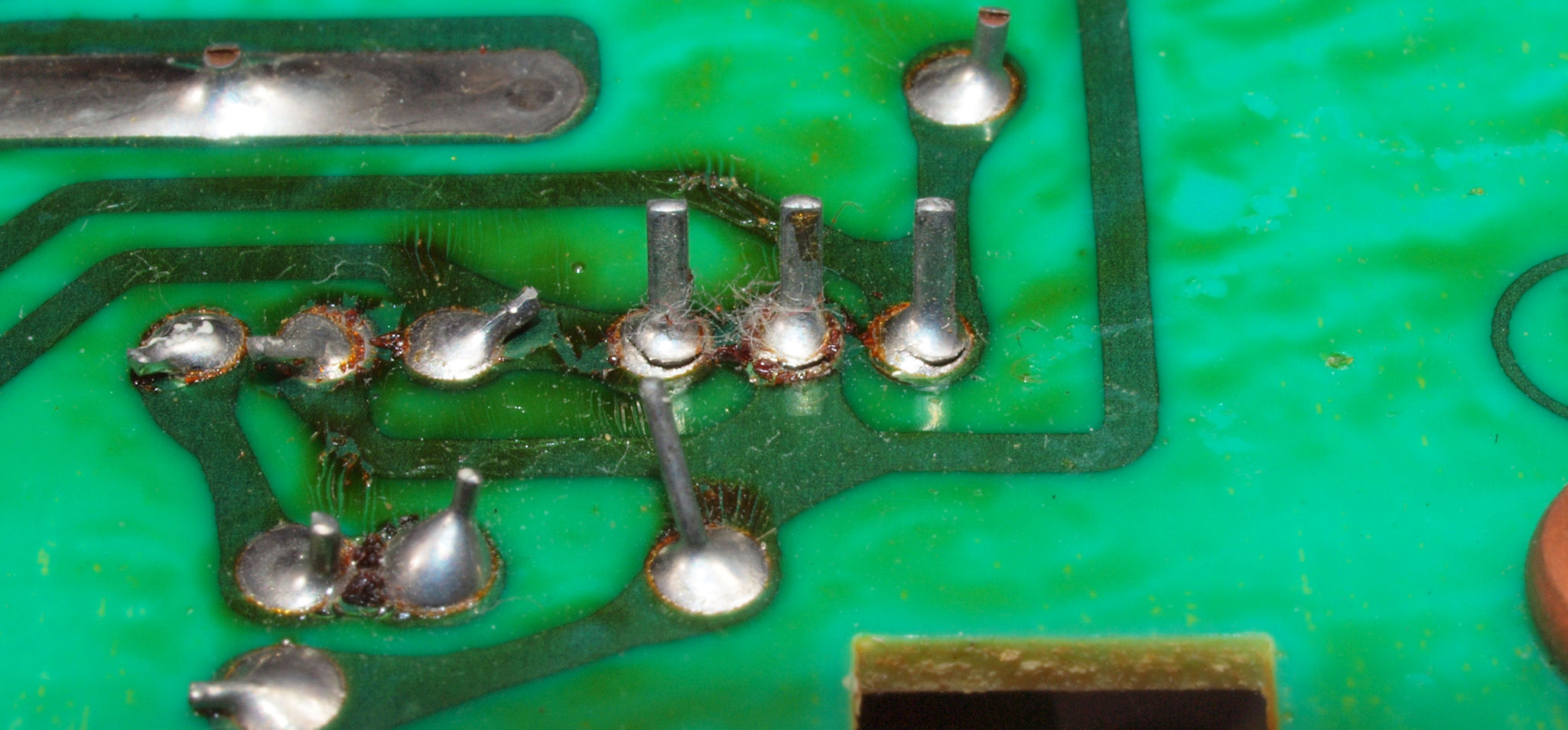 | C634. 修理後 L側ドライブ基板裏。 ドライブTR(トランジスター)の足の銅箔を広げる。 | ||||||||||||||||||||||||||||||||||||||||||||||||||||