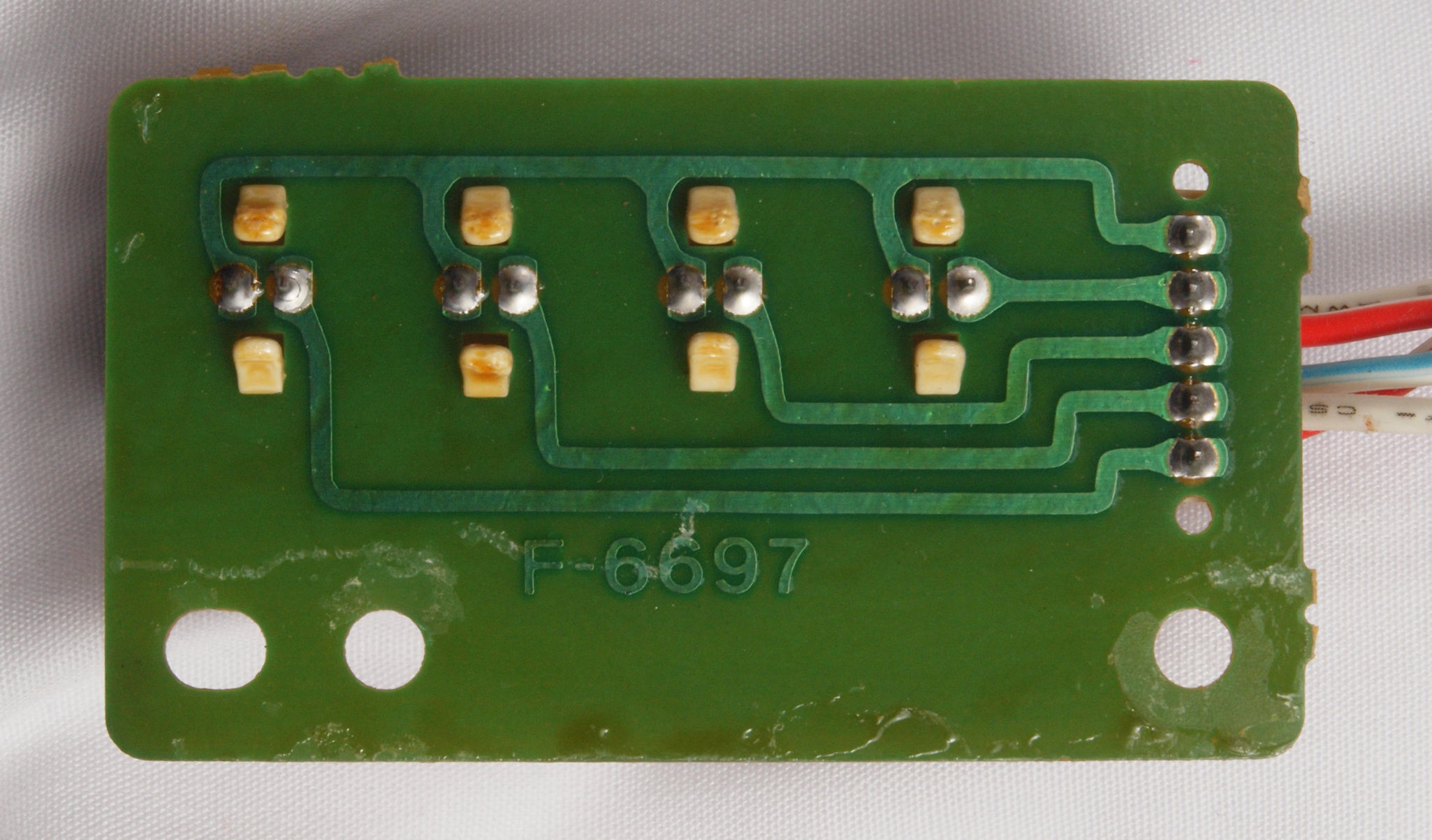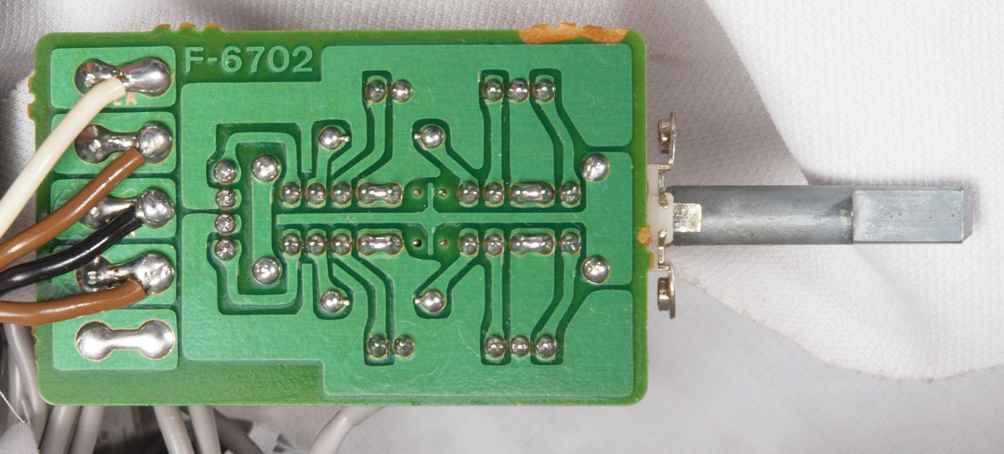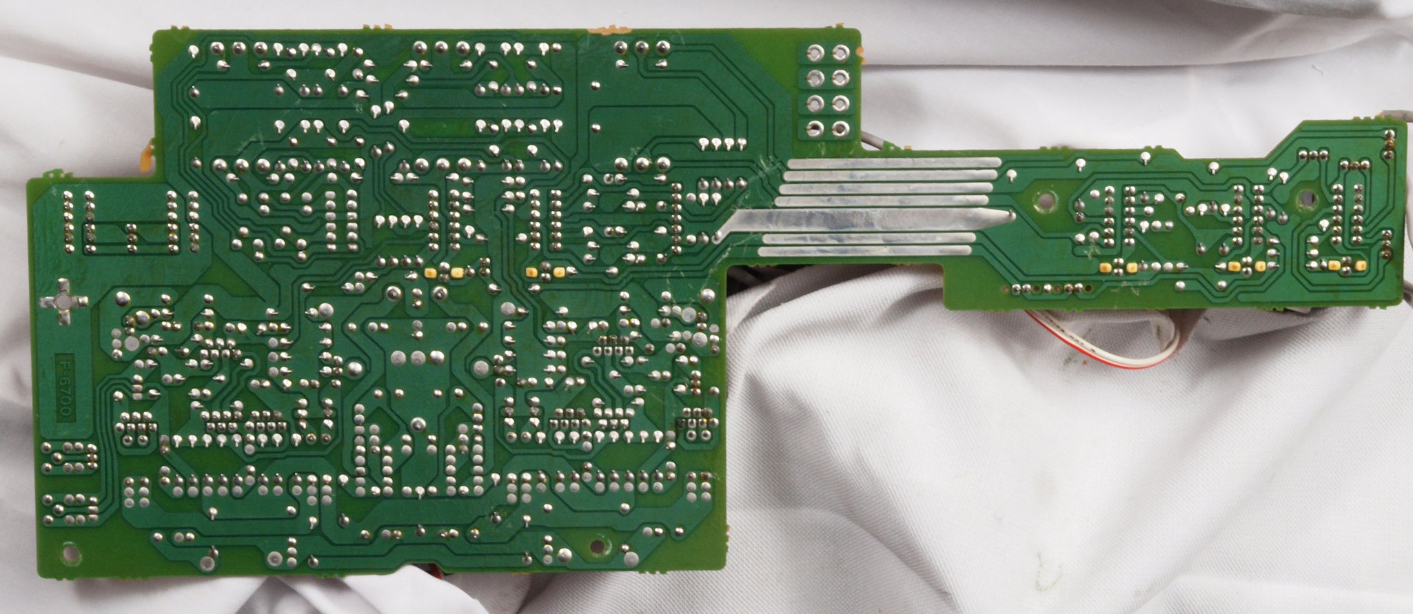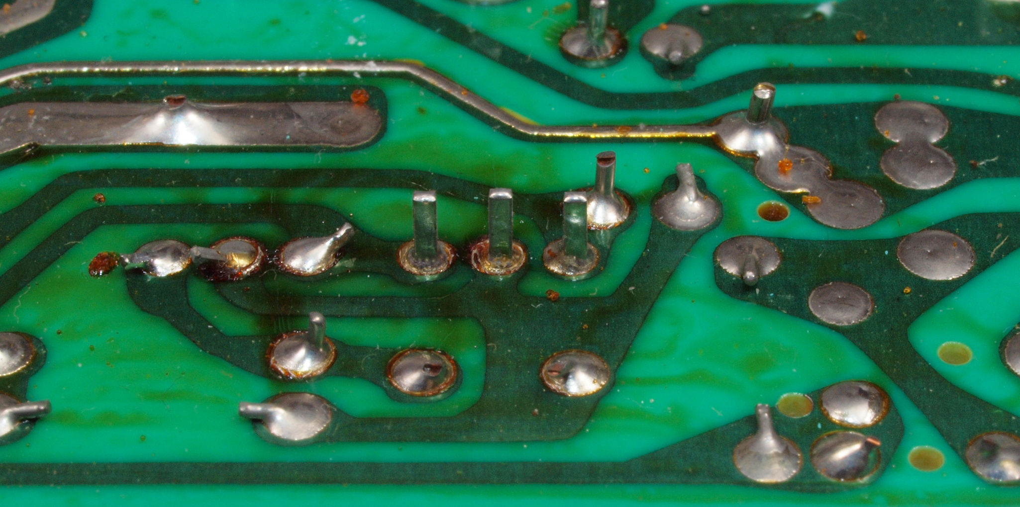 | C634. 修理後 L側ドライブ基板裏。 ドライブTR(トランジスター)の足の銅箔を広げる。 | ||||||||||||||||||||||||||||||||||||||||||||||||||||