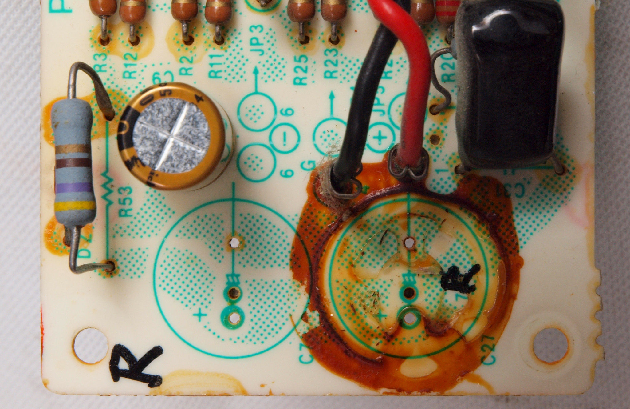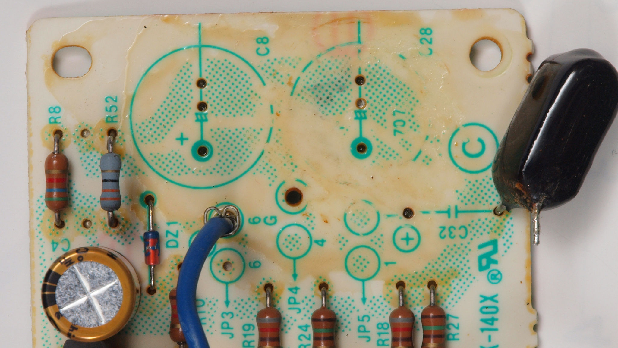 | C414. 修理前 R側AMP基板。 電解コンデンサー固定用の接着材2、当時は溶媒にトルエンが使用されており、銅を腐食する。 | ||||||||||||||||||||||||||||||||||||||||||||||||||||