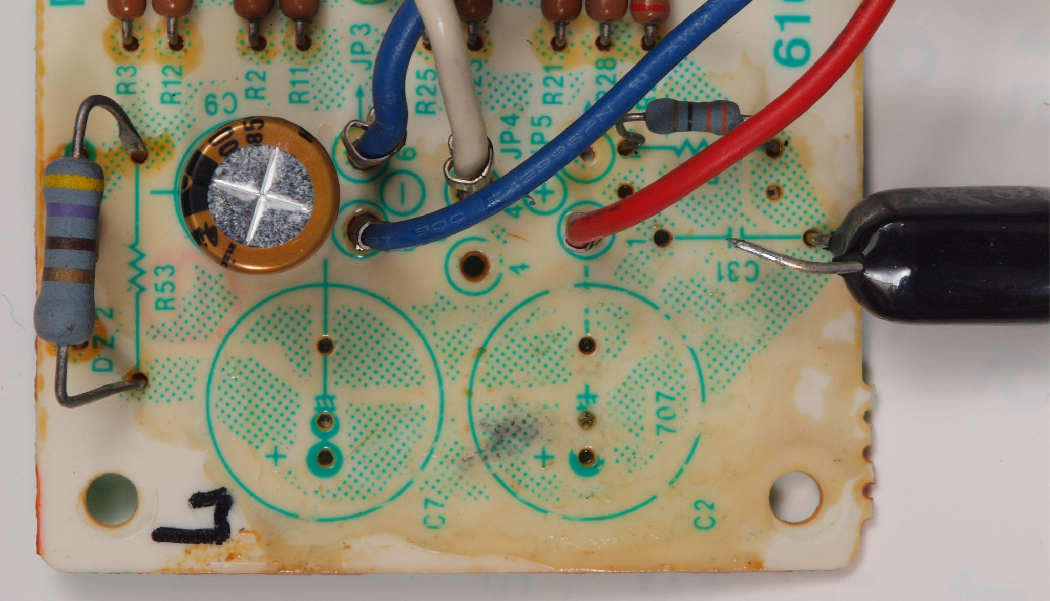 | C712. 修理前 L側AMP基板。電解コンデンサー固定用の接着材、当時は溶媒にトルエンが使用されており、銅を腐食する。 | ||||||||||||||||||||||||||||||||||||||||||||||||||||