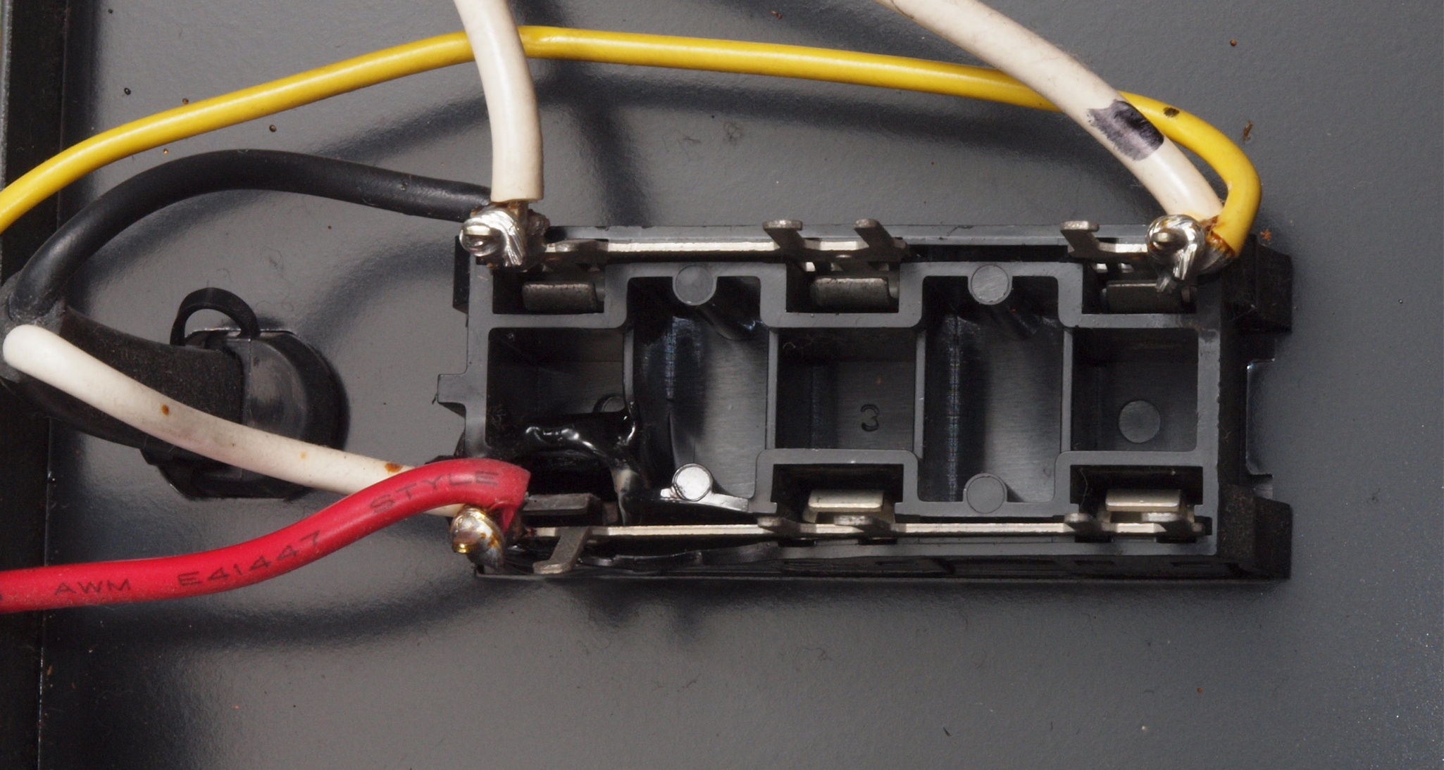 | A132. 点検中 後から見る。 ACコンセントの1個が焼けている。 | ||||||||||||||||||||||||||||||||||||||||||||||||||||