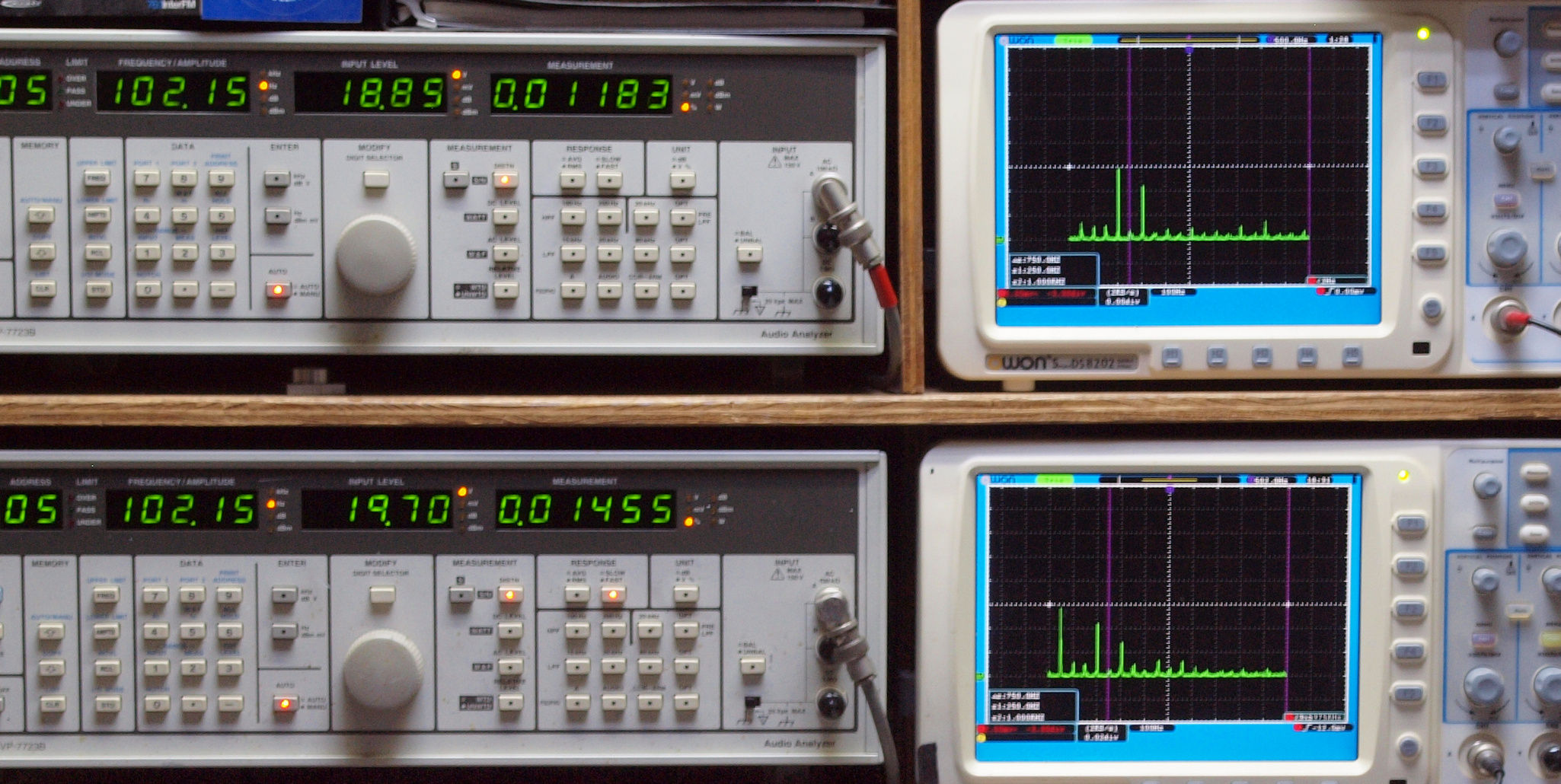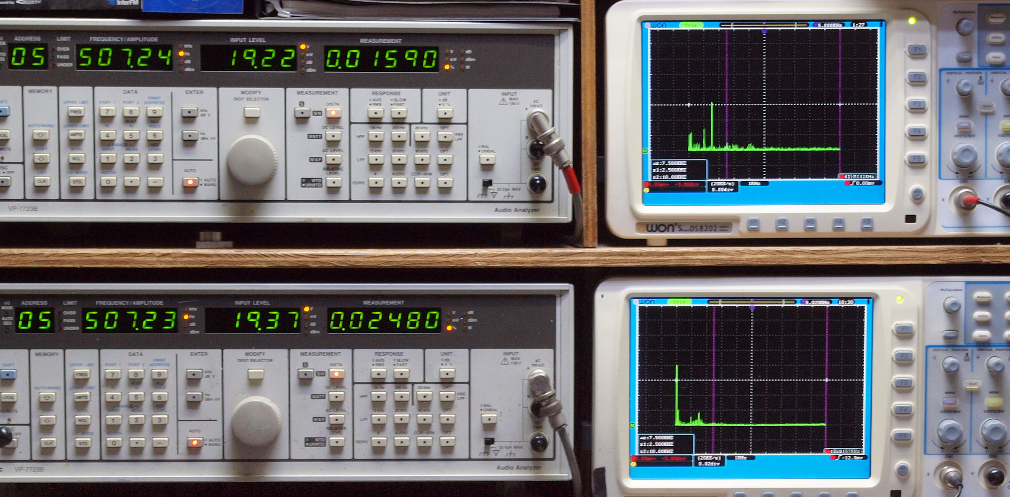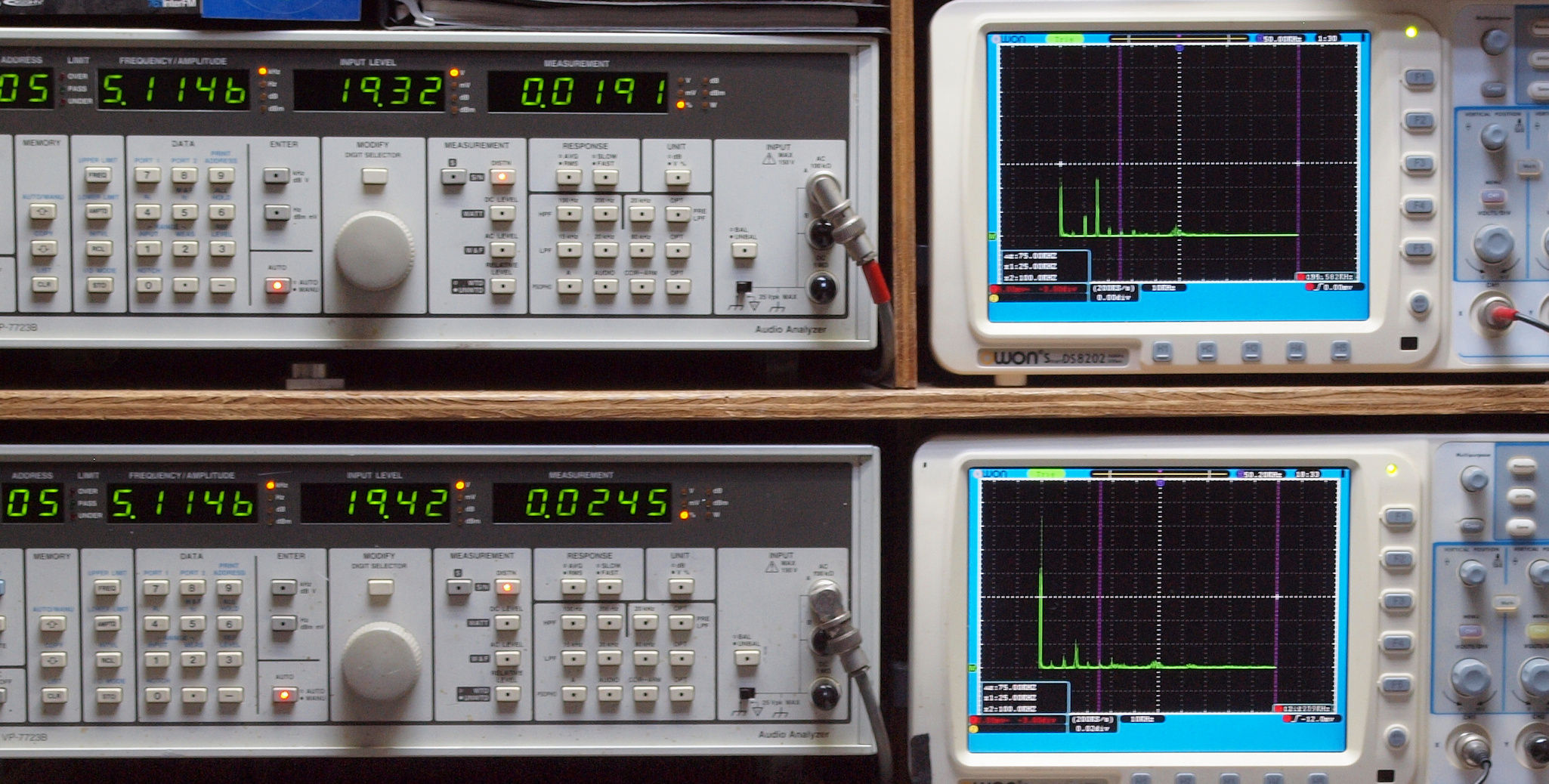 | E. 測定・調整。 画像をクリックすると、大きく(横幅2050ドット)表示されます。 E0. 出力・歪み率測定・調整 「見方」。 上段中 右側SP出力を「Audio Analyzer Panasonic VP−7723B」により測定。 表示LED、 左端=メモリーNo、 中左=周波数測定、 中右=出力電圧測定、 右端=歪み率測定。 上段右端 VP−7723Bの基本波除去出力を「owon SDS8202(200MHZ)」で「FFT分析」表示。 下段中 左側SP出力を「Audio Analyzer Panasonic VP−7723B」により測定。 表示LED、 左端=メモリーNo、 中左=周波数測定、 中右=出力電圧測定、 右端=歪み率測定。 下段右端 VP−7723Bの基本波除去出力を「owon SDS6062(200MHZ)」で「FFT分析」表示。 下段左端 オーディオ発振器 VP−7201A より50Hz〜100kHzの信号を出し(歪み率=約0.003%)、ATT+分配器を通し、AMPに入力。 よって、ダイアル設定出力レベルより低くなります。測定機器の仕様や整備の様子はこちら、「VP−7723B」「VP−7201A」。 FFT画面の見方はこちら。 |