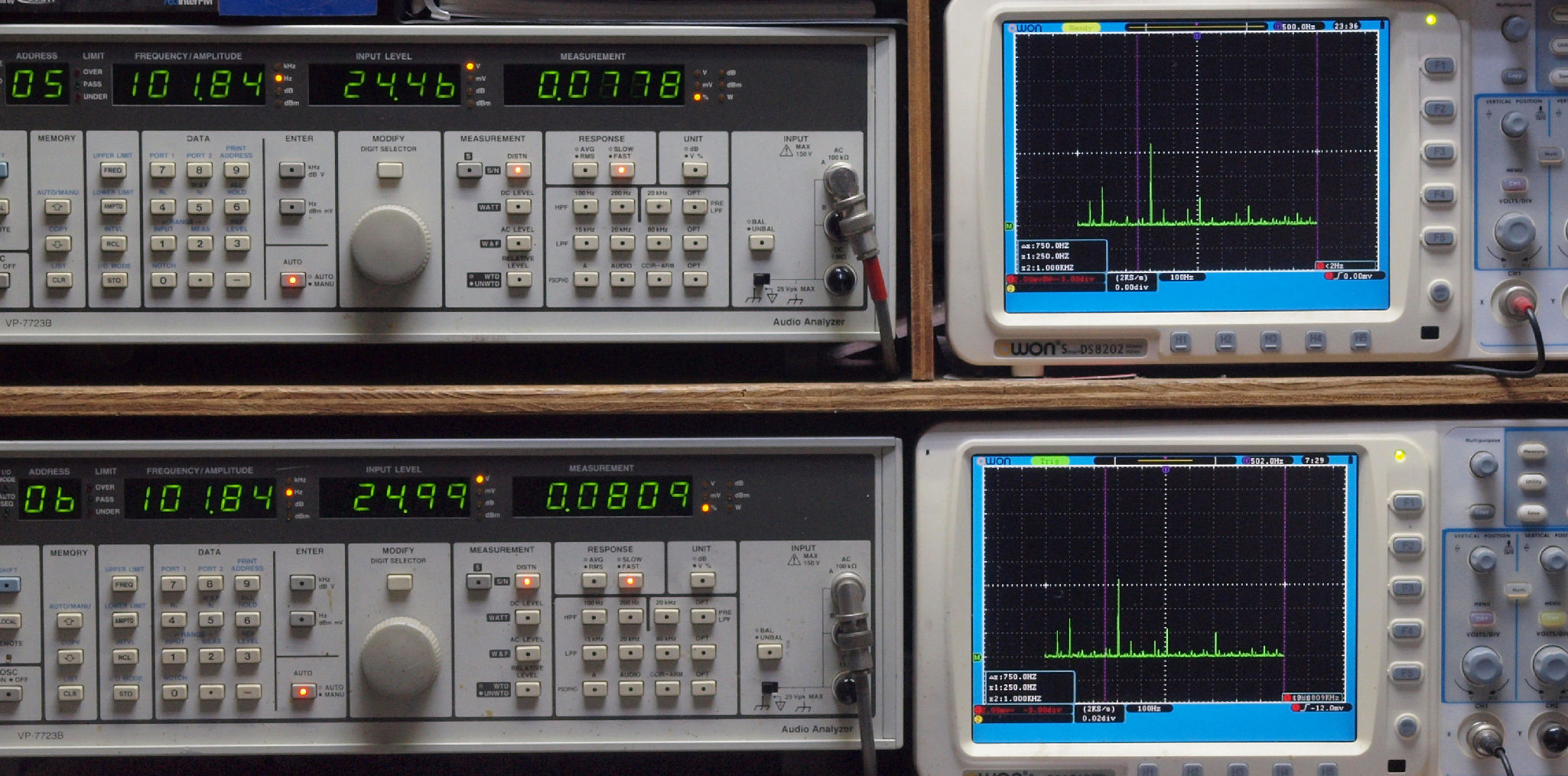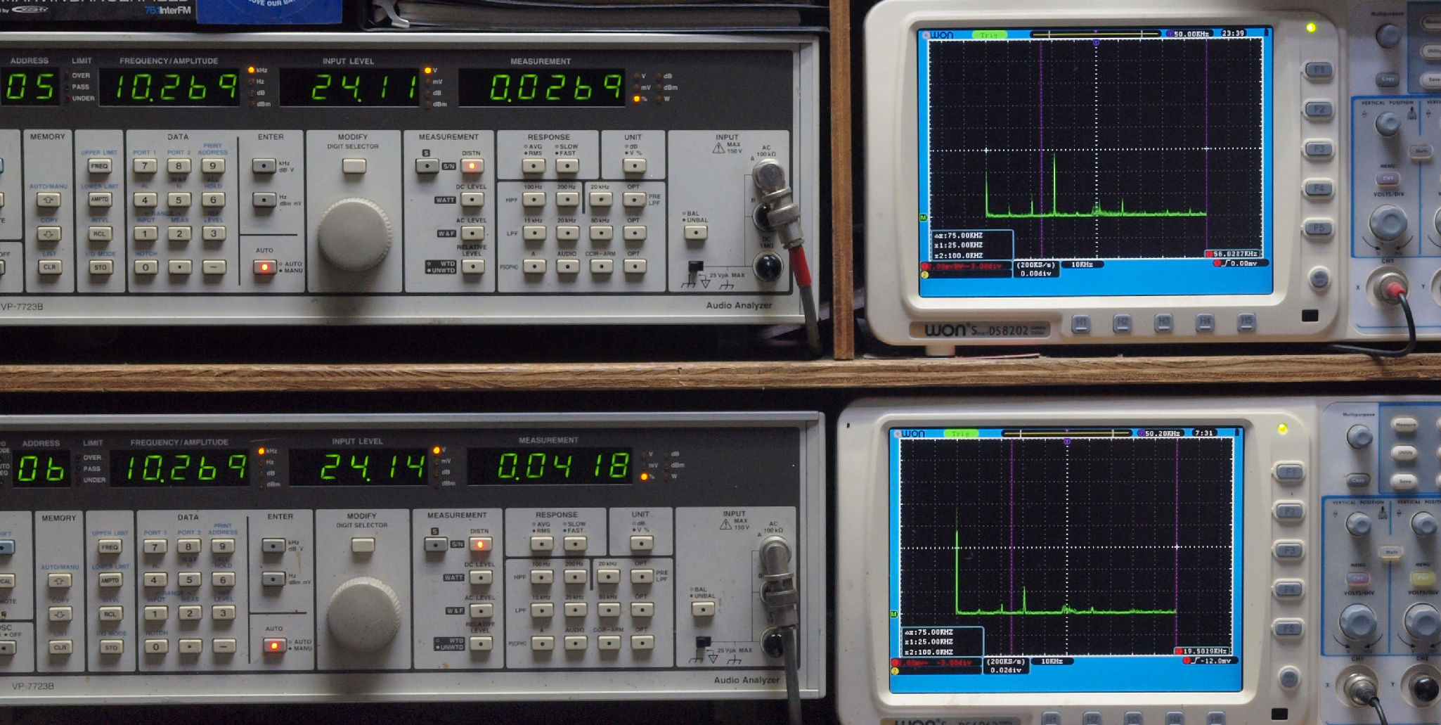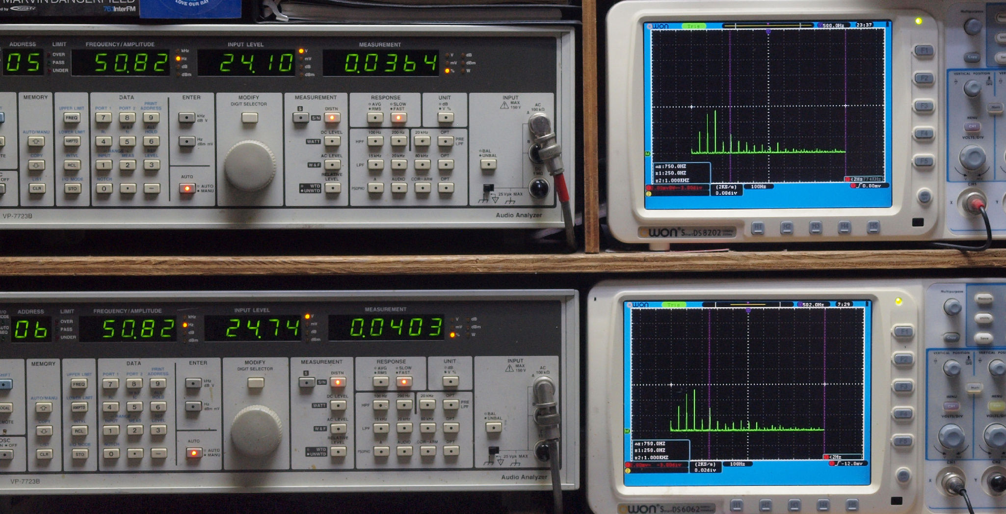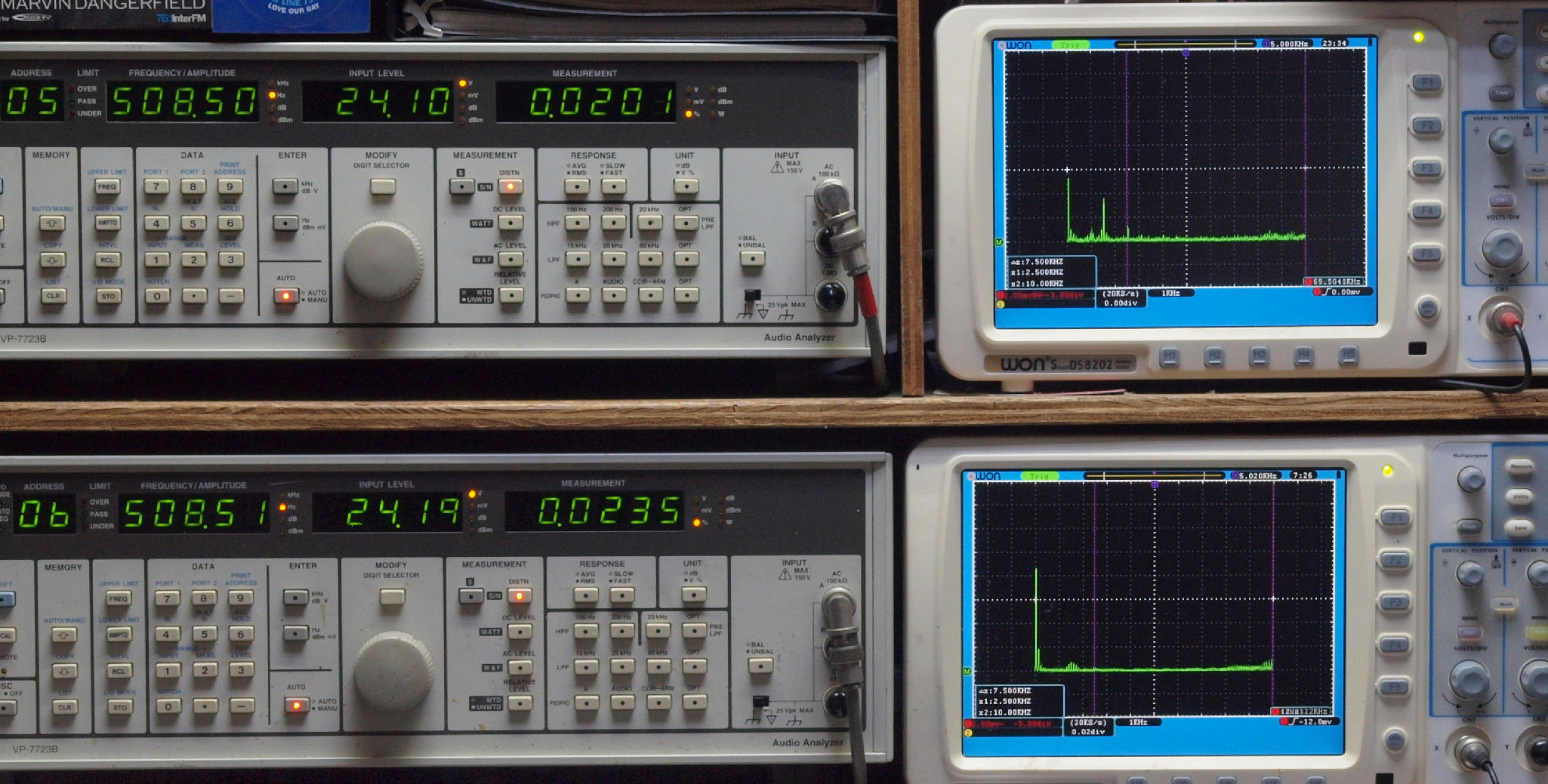 | R1. 測定・調整。 画像をクリックすると、大きく(横幅2050ドット)表示されます。 「見方」。 上段中 右側SP出力を「Audio Analyzer Panasonic VP−7723B」により測定。 表示LED、 左端=メモリーNo、 中左=周波数測定、 中右=出力電圧測定、 右端=歪み率測定。 上段右端 VP−7723Bの基本波除去出力を「owon SDS8202(200MHZ)」で「FFT分析」表示。 下段中 左側SP出力を「Audio Analyzer Panasonic VP−7723B」により測定。 表示LED、 左端=メモリーNo、 中左=周波数測定、 中右=出力電圧測定、 右端=歪み率測定。 下段右端 VP−7723Bの基本波除去出力を「owon SDS6062(200MHZ)」で「FFT分析」表示。 下段左端 オーディオ発振器 VP−7201A より50Hz〜100kHzの信号を出し(歪み率=約0.003%)、ATT+分配器を通し、AMPに入力。 よって、ダイアル設定出力レベルより低くなります。測定機器の仕様や整備の様子はこちら、「VP−7723B」「VP−7201A」。 FFT画面の見方はこちら。 |