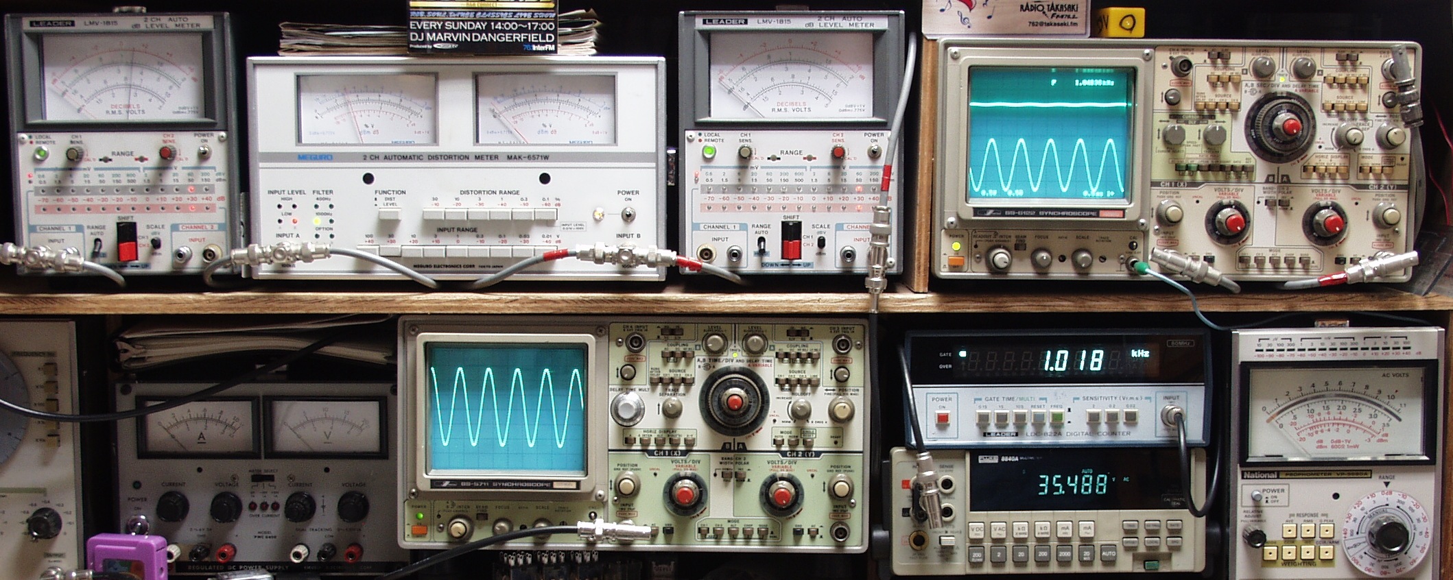 上中左=SP出力の歪み率測定 左メータ=L出力、右メータ=R出力