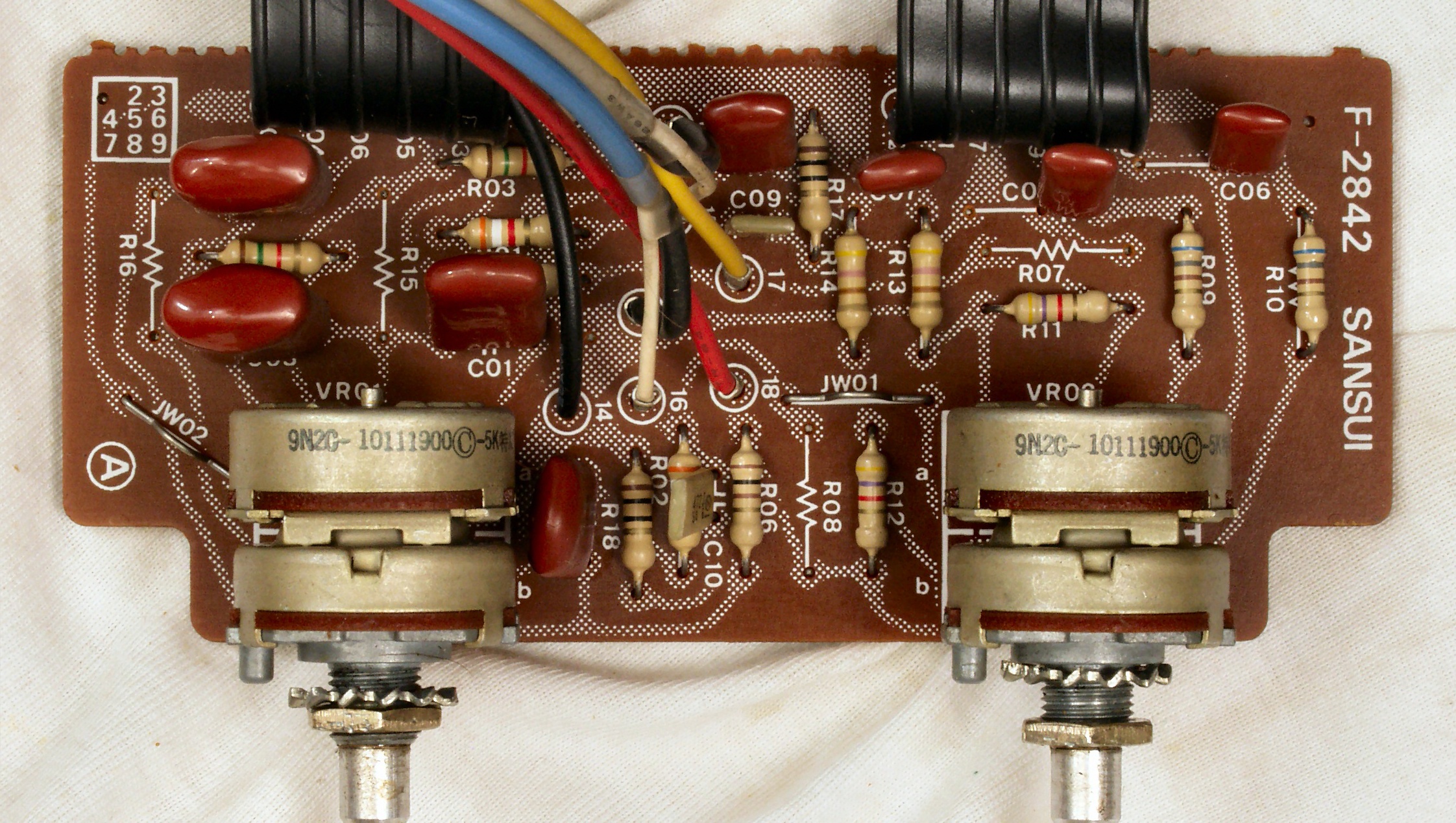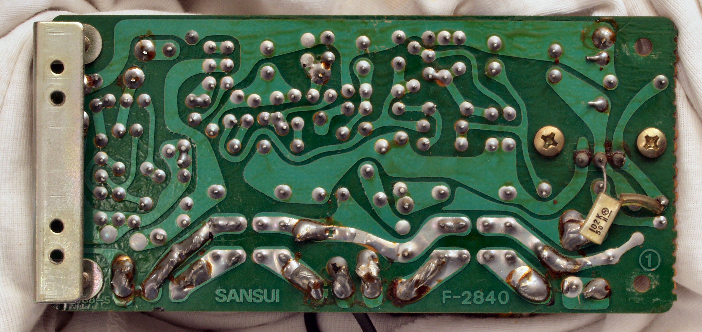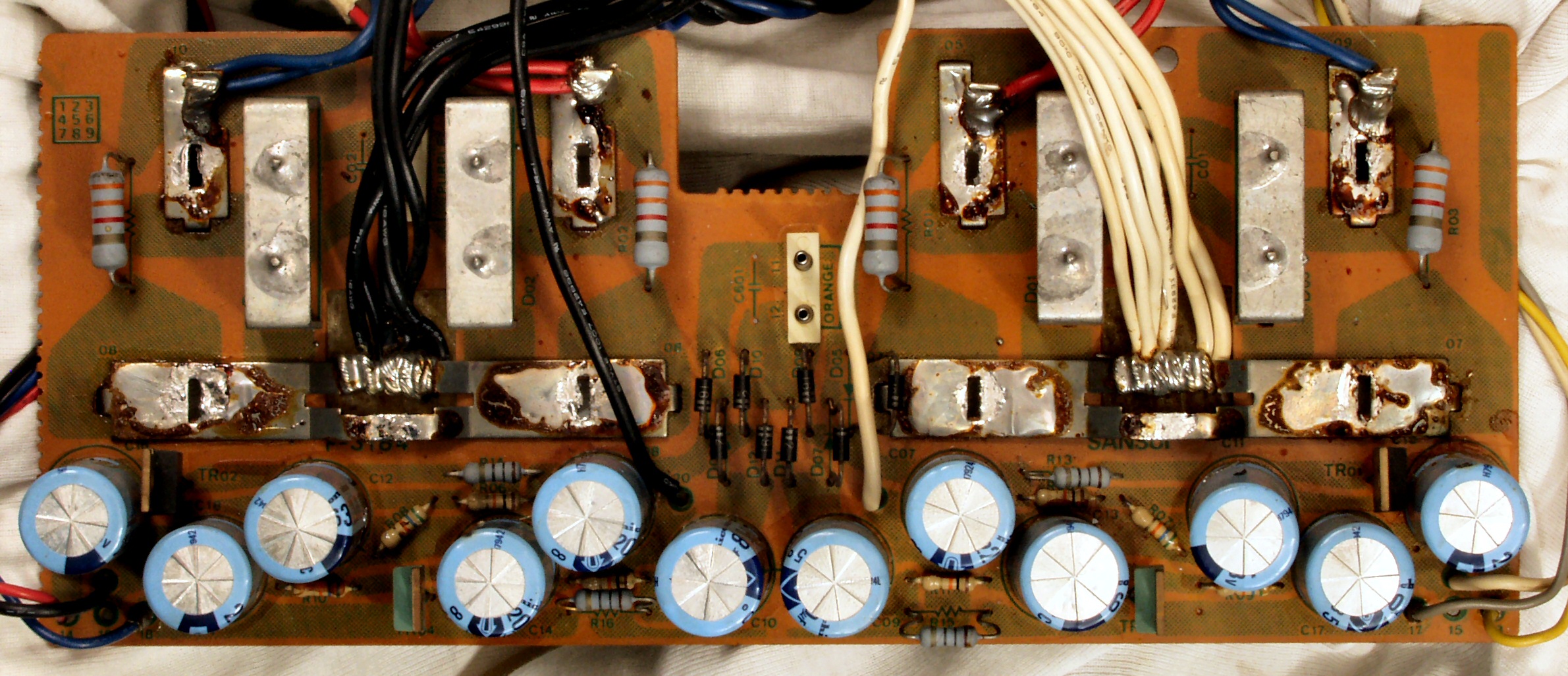 初段FET(電界効果トランジスター)2個、半固定VR4個、電解コンデンサ−20個、抵抗6個、TR(トランジスター)6個交換