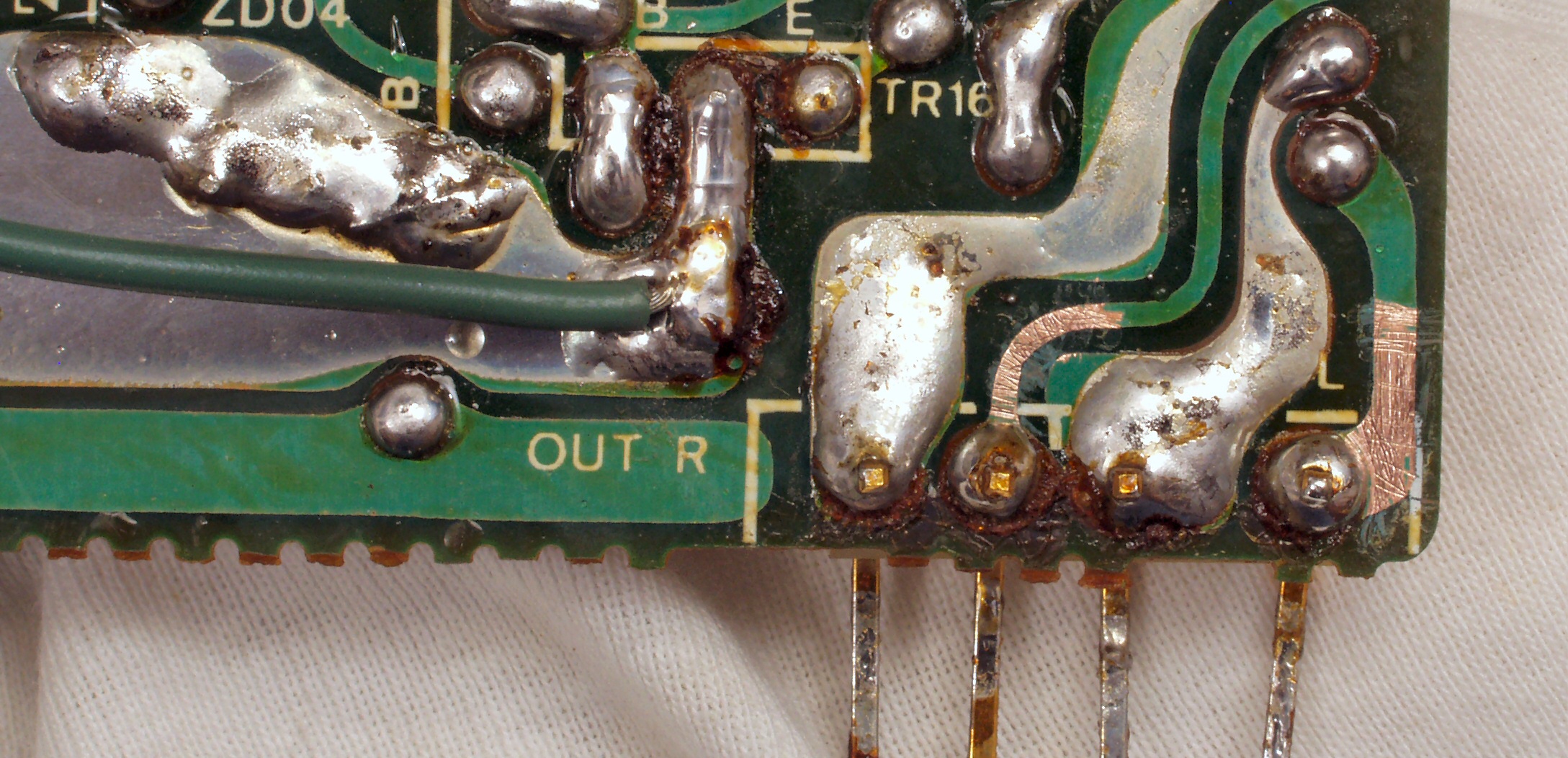 C1C2. 修理前 メイン・ドライブAMP基板裏 短絡で焼けた銅箔や半田。