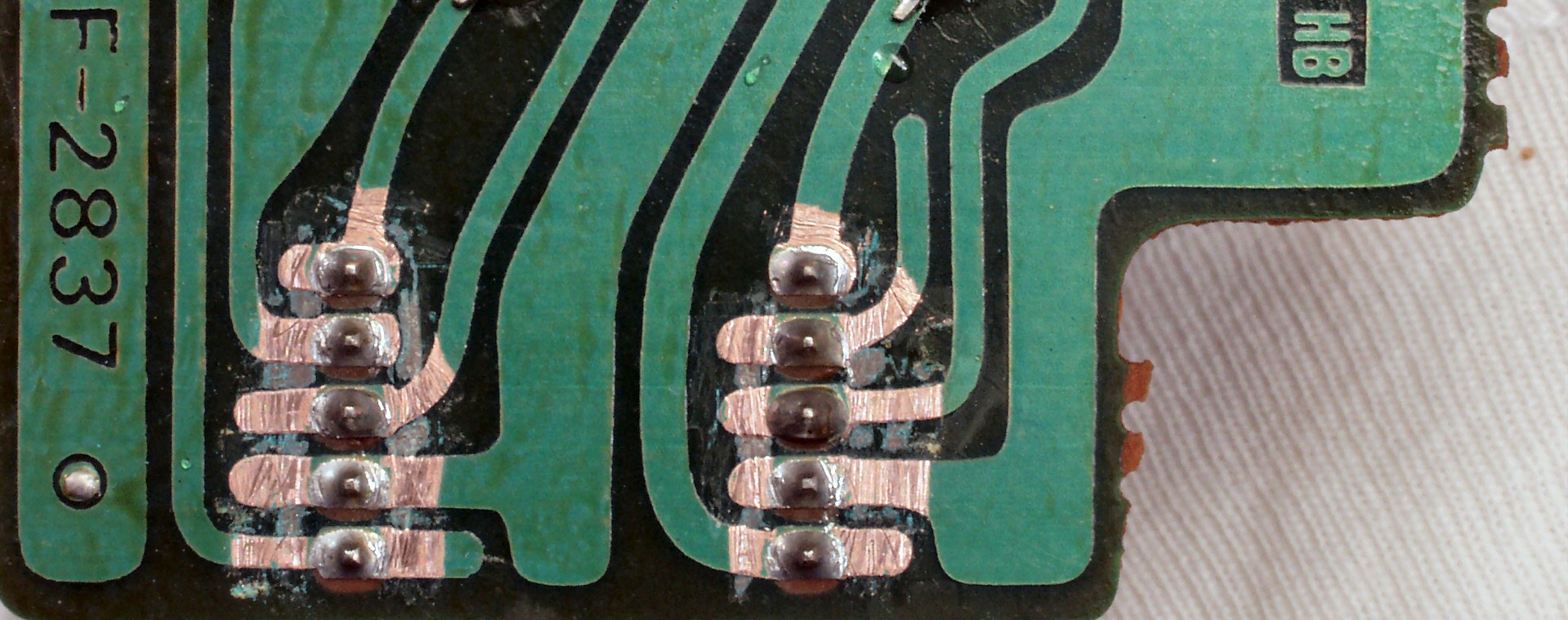 C3D−2. 修理中 FLAT−AMP基板裏、コネクター足の銅箔を広げる。2