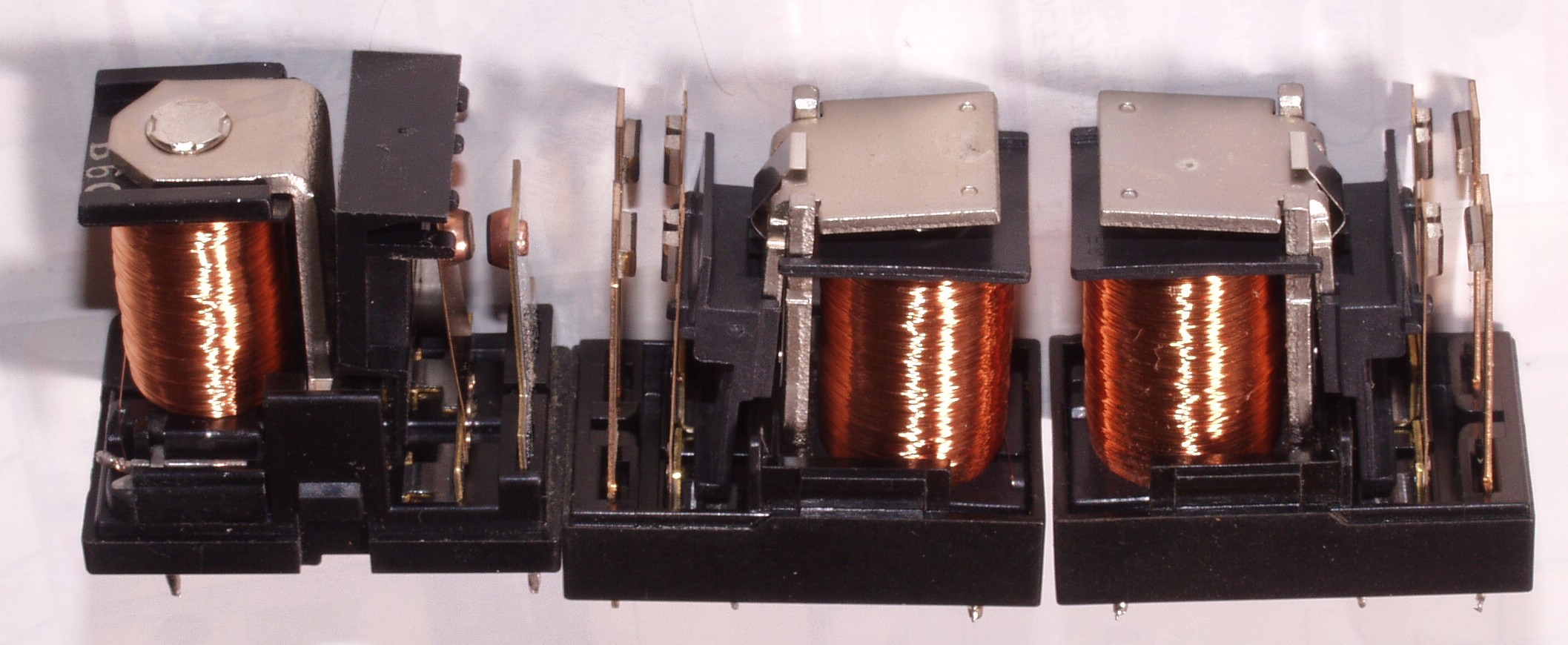 | A3. 点検中 SP接続リレー比較 左=付いていた接点容量7A=8Ω出力だと392W定格 右=交換する接点容量10A=8Ω出力だと800W定格 |