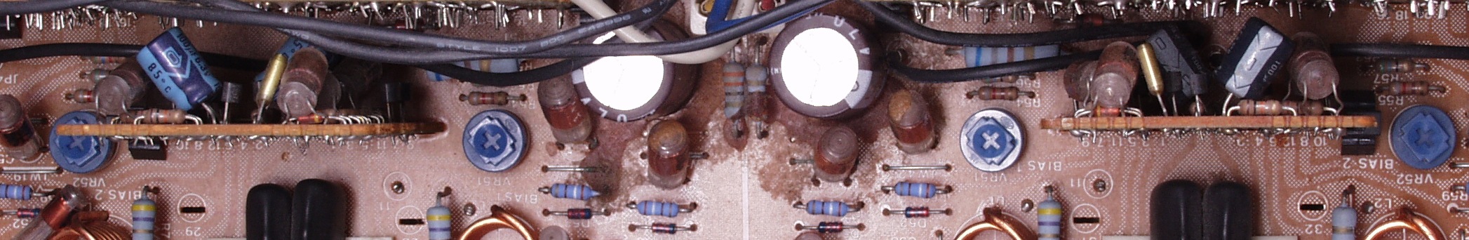 A13. 点検中 メインAMP基板のRLプロテクト基板の電解コンデンサーが異なる
