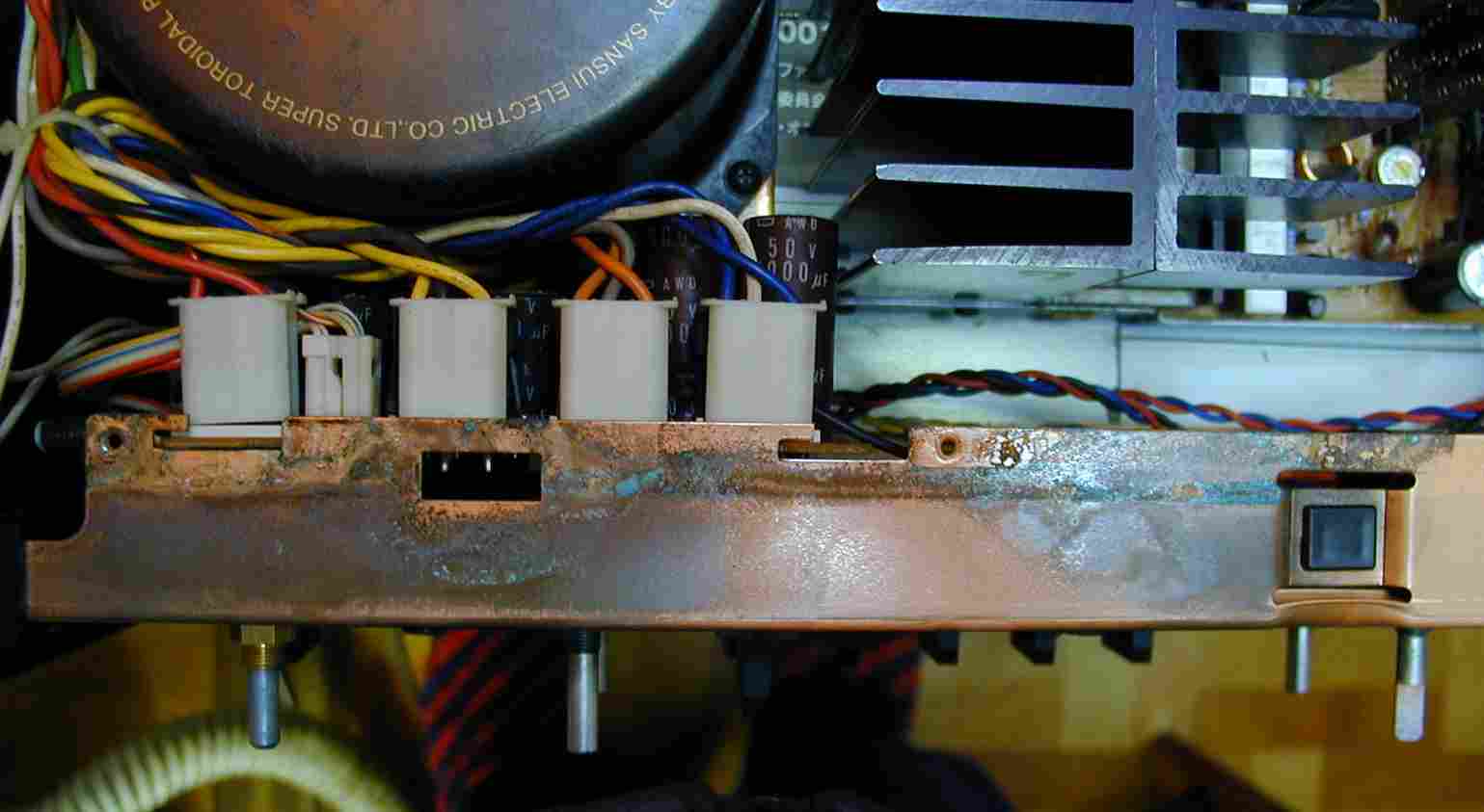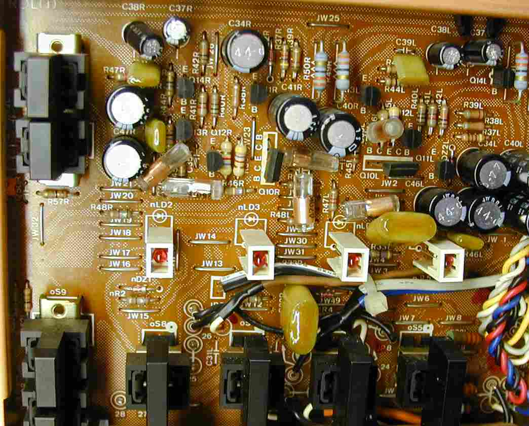 | A. 修理前の状況 YAHOOで買い、購入直後は正常に動作しました。送料入れて約4万円。 数時間後、右側の音が出ていないことを見つけました。 スピーカーの接続をやり直 したところ 音が出ることを確認しました。 しかし、翌日、右側の音が出ておらず、それ以後出なくなりました。 音源(CD,MDなど)を変えても右側の音は出ません。 スピーカーの接続は何度もチェックしたが、効果ありません。 B.原因 TR(トランジスター)の劣化。 接点復活剤の多量使用か、又は何かをこぼしたか、パネル裏の基板受けに腐食あり。 C. 修理状況 SP接続リレー交換 、基板清掃 メインAMPのバランス/バイアス半固定VR交換 メインAMPの初段FET(電界効果トランジスター)交換 メインAMPのTR(トランジスター)交換 フラット/コントロールAMPの初段FET(電界効果トランジスター)交換 コントロール基板清掃、ハンダ補正 取り外し、各基板の半田不良を修理します、所謂、半田補正作業。 配線手直し、補強 経年劣化による各部ハンダ補正 EQ−AMPは使用しない D.使用部品 バランス/バイアス半固定VR 13mmΦ高級品 8個 メインAMPの初段FET(電界効果トランジスター) 2個 メインAMPのTR(トランジスター) 20個 フラット/コントロールAMPの初段 4個 SP接続リレー 2個 E. 修理費 38,000円 通常修理。 S. Sansui AU−D907X の仕様(マニアル・カタログより) |