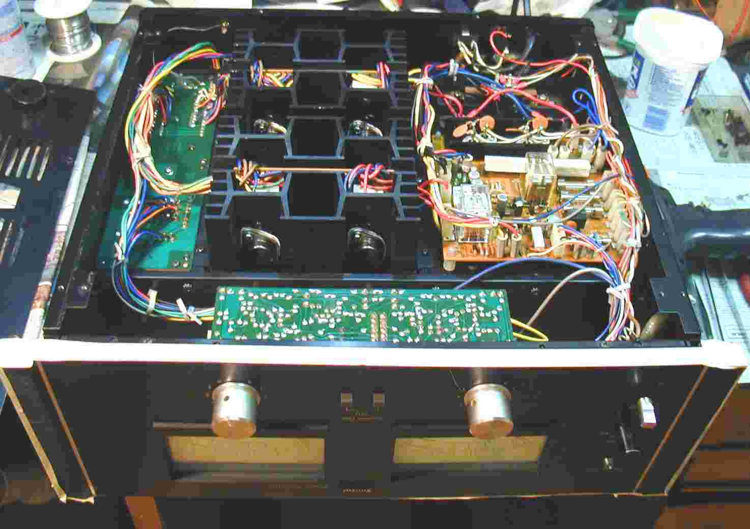 終段TR(トランジスター)が、3パラPPで、合計12個使用、片側で、軽く200W出る。 |