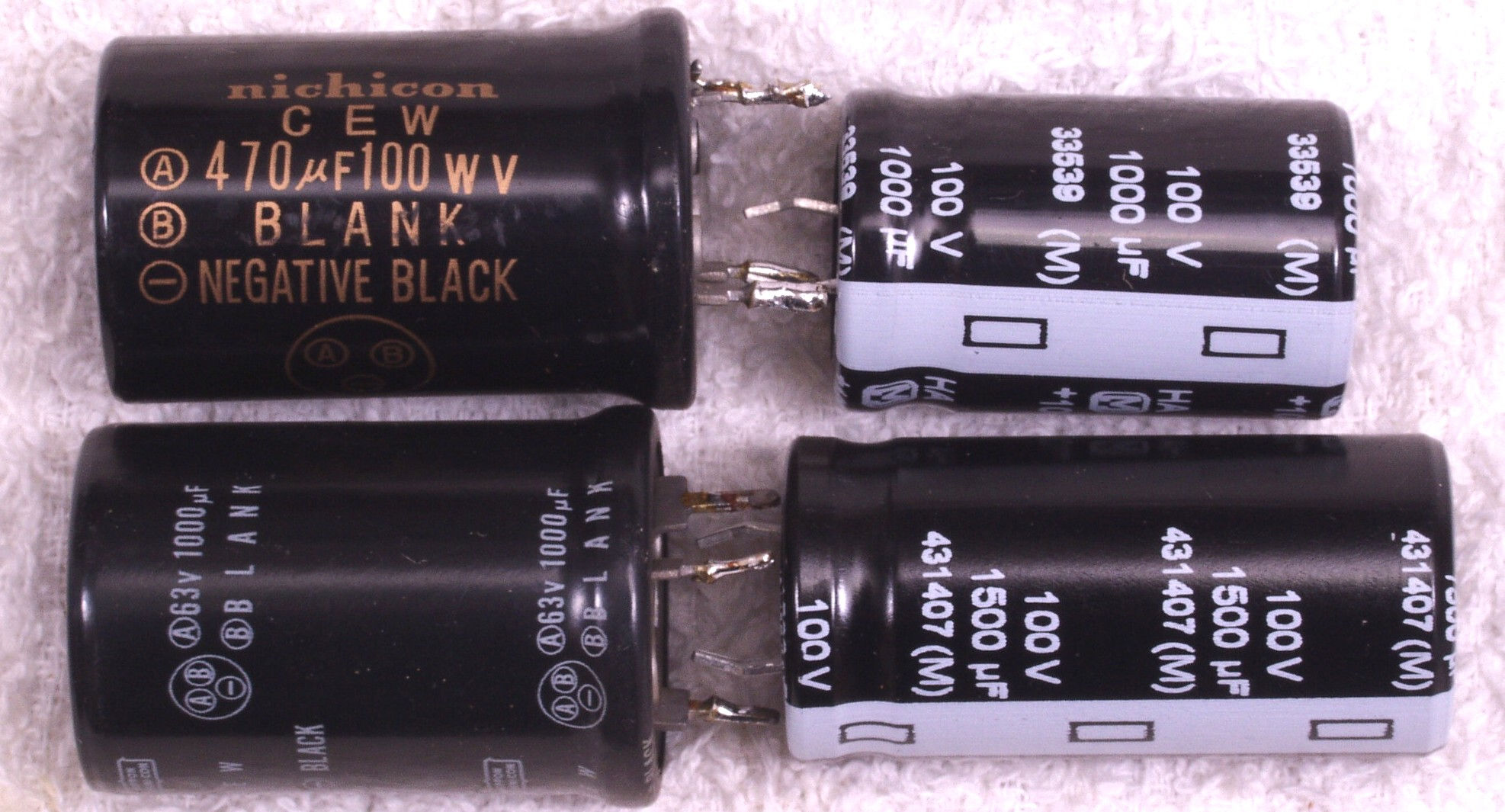 | C−GE. 交換した電源電解コンデンサー 下の方のビニールが後退している |
