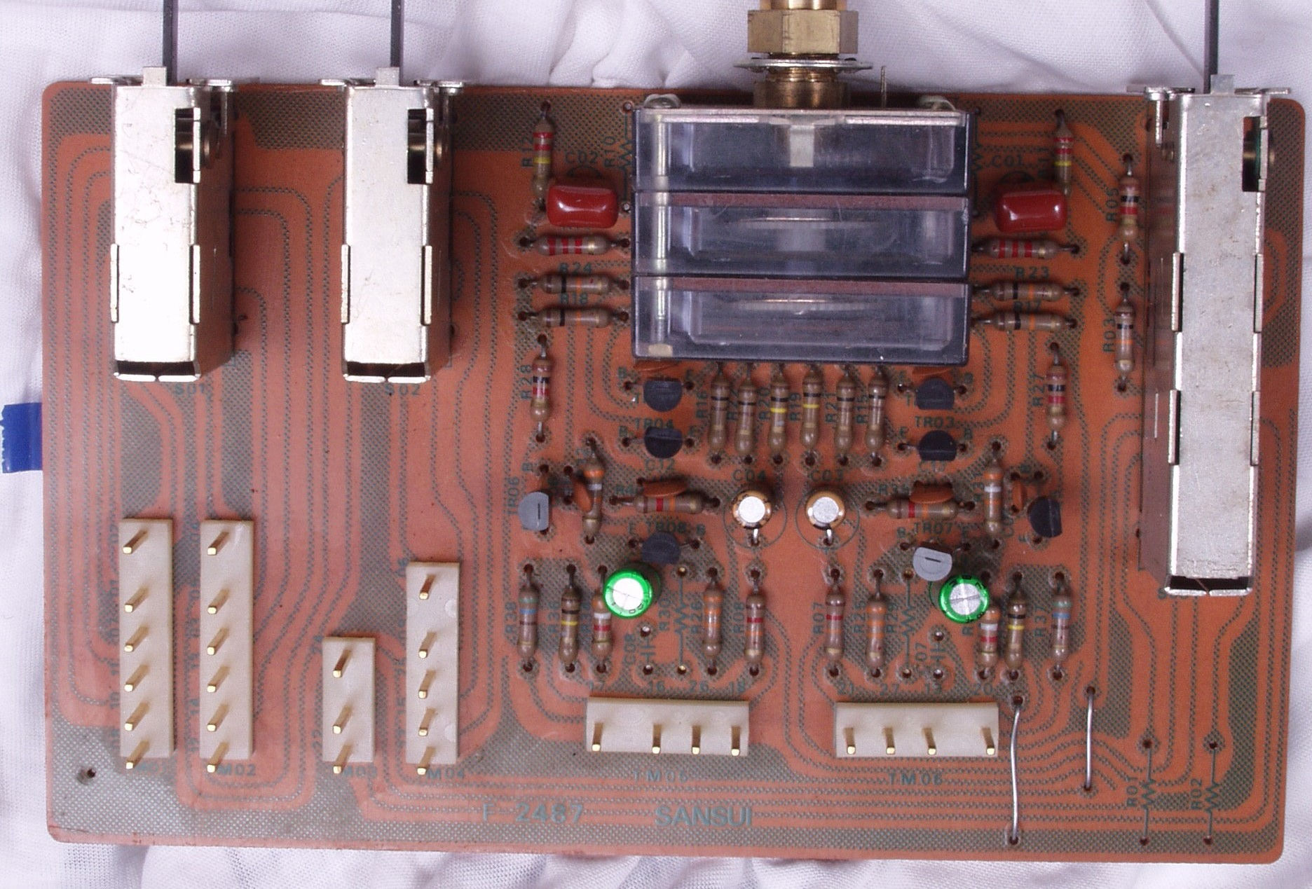 | C−DB. 修理後 VU−AMP基板 TR(トランジスター)8個、半固定VR4個、電解コンデンサー12個交換、抵抗2個追加 |