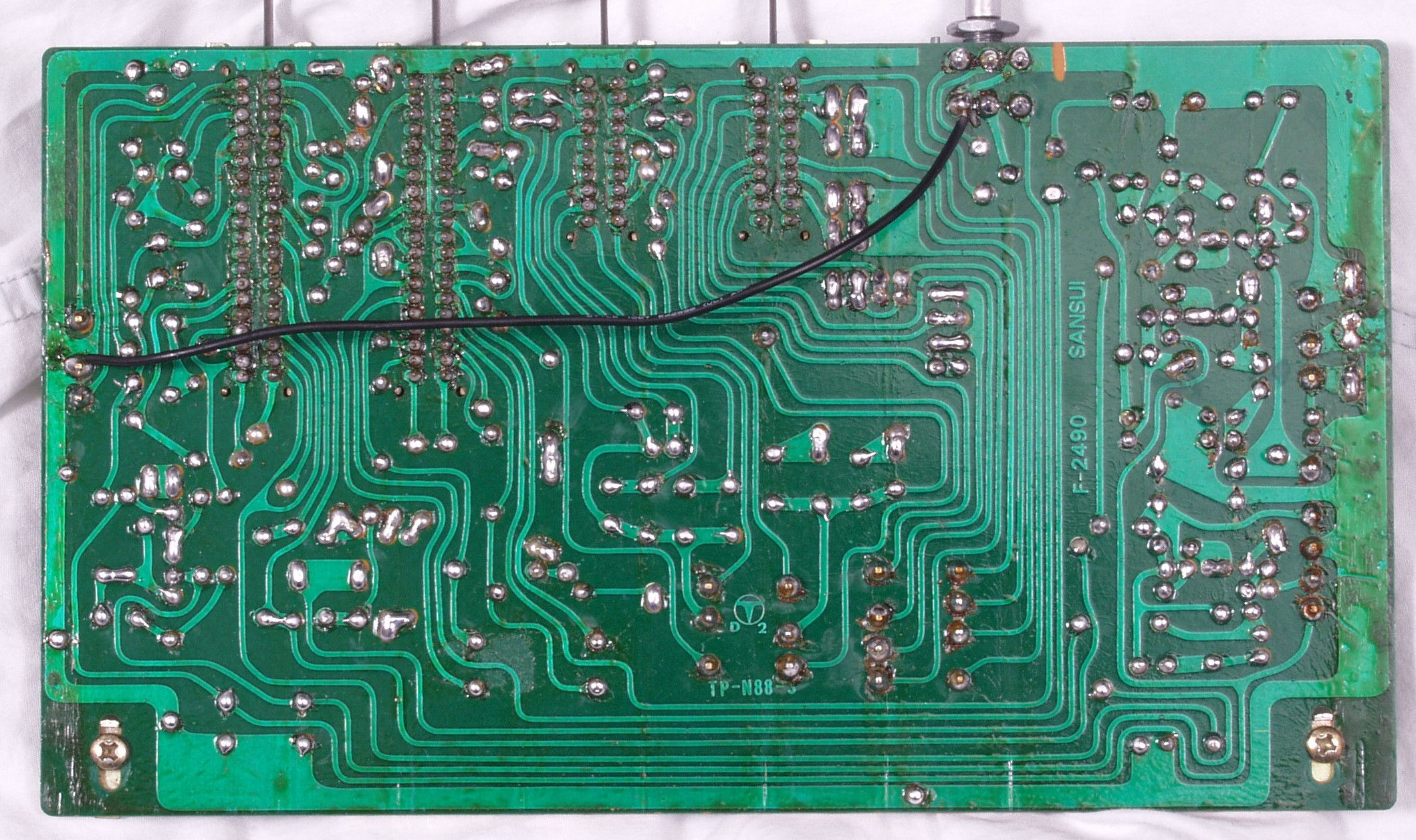 | C−DC. 修理前 VU−AMP基板裏 接触不良だと思いコネクターが外され、引き出し線が半田付けされている お陰で、修理は大変! |