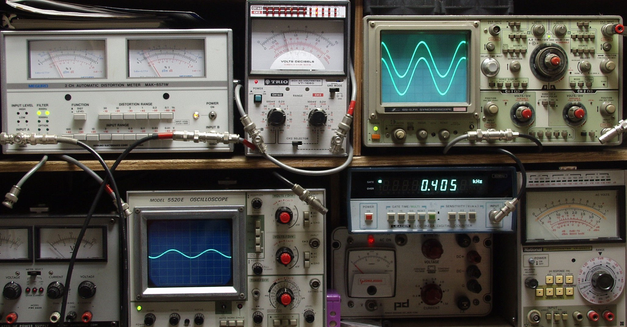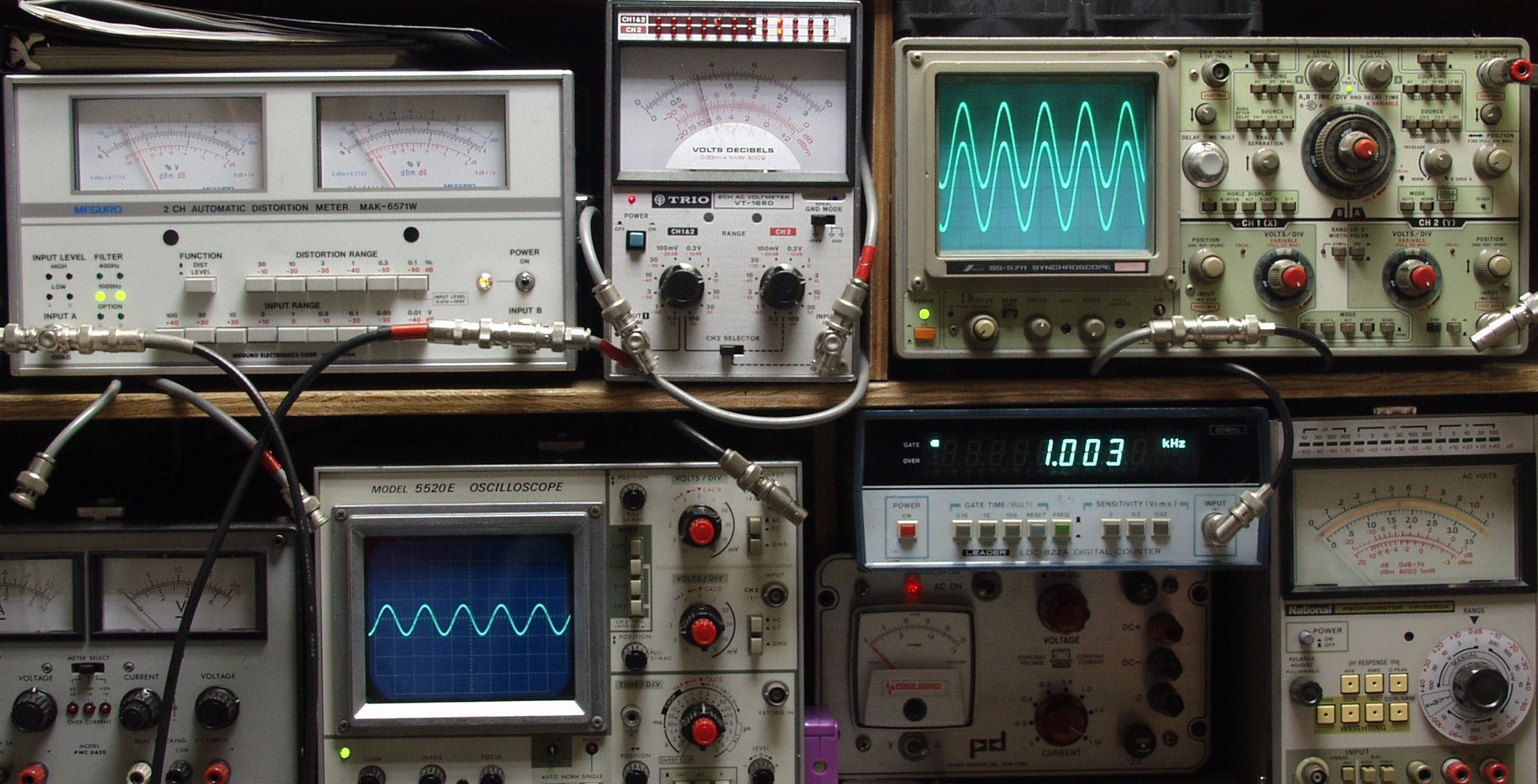 | E. 調整・測定 E−1. 出力/歪み率測定・調整 <見方> 上左オーデオ発振器より400HZ・1KHZの信号を出す(歪み率=約0.003%) 下中=入力波形(オーデオ発振器のTTLレベル) 下右=周波数計 上左=SP出力の歪み率測定 左メータ=L出力、右メータ=R出力 上中=SP出力電圧測定器、赤針=R出力、黒針=L出力 上右=SP出力波形オシロ 上=R出力、下=L出力(出力電圧測定器の出力) |