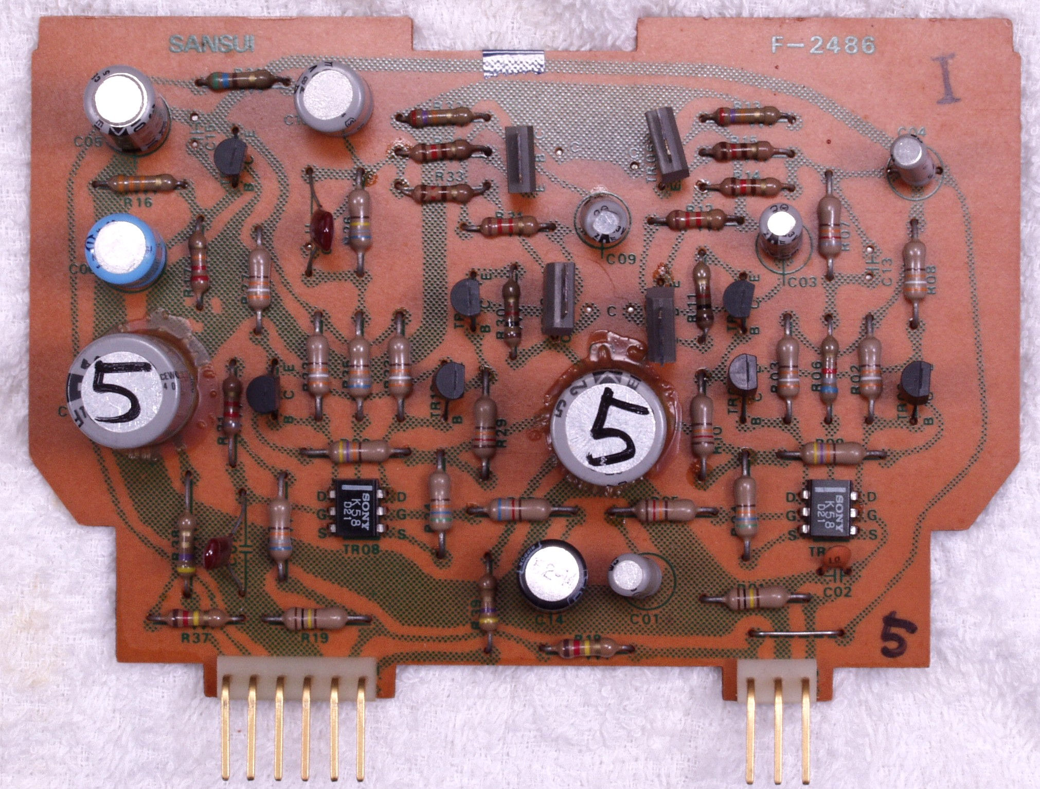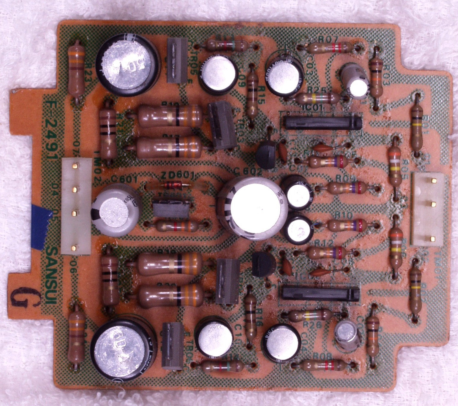| C−7B. 修理後 L−EQ−AMP基板 TR(トランジスター)3個、電解コンデンサー10個交換 |