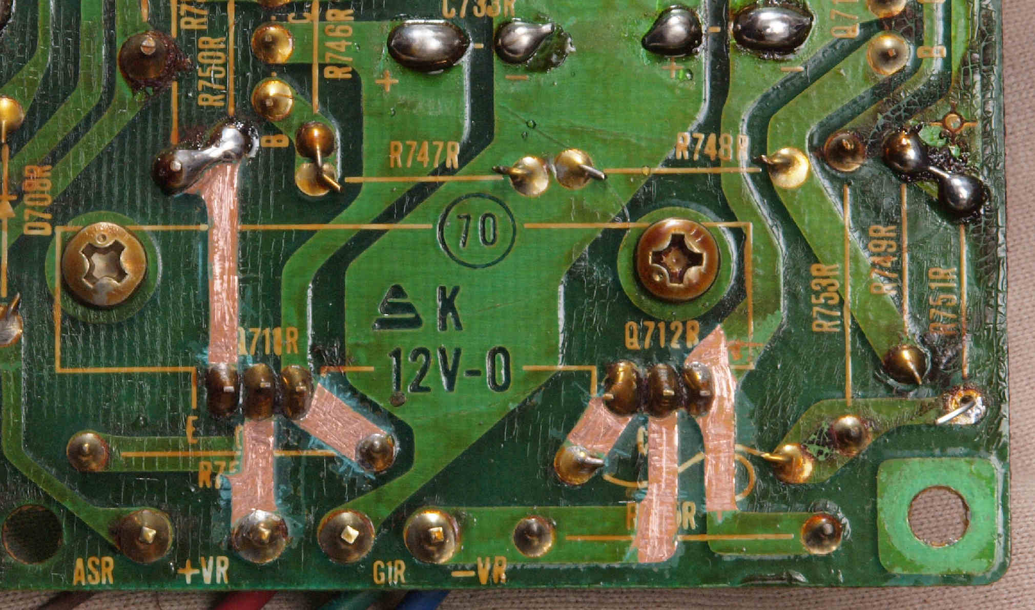 | C14. 修理中 R側ドライブ基板裏 定電圧TR(トランジスター)の足の銅箔を広げる。 |