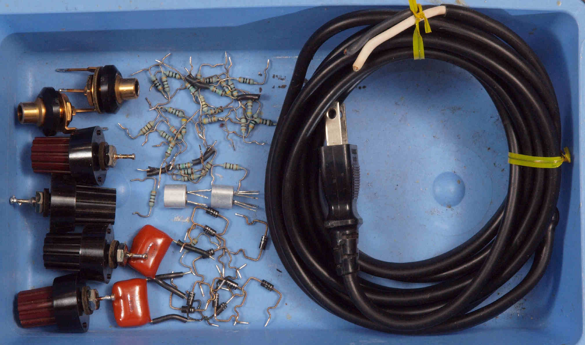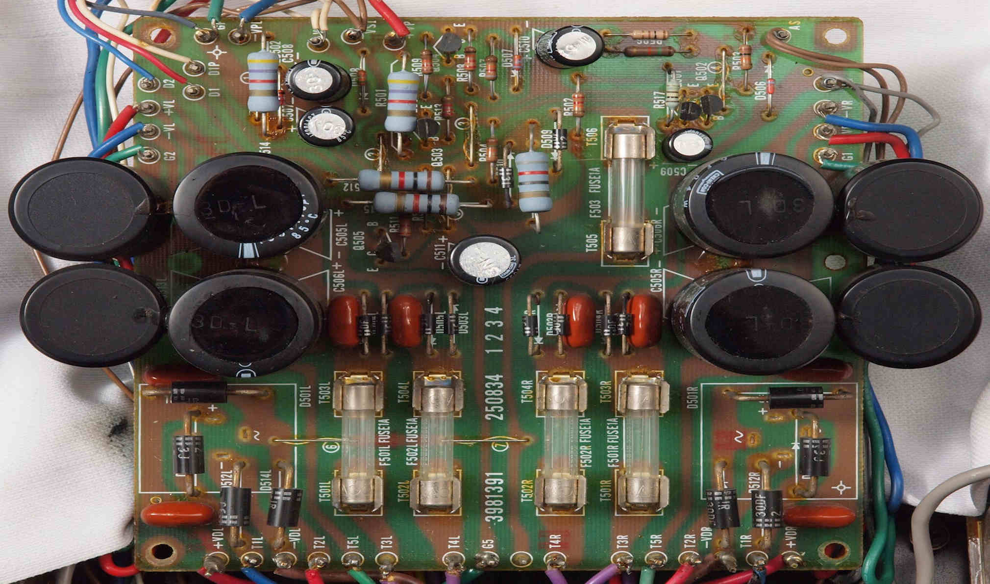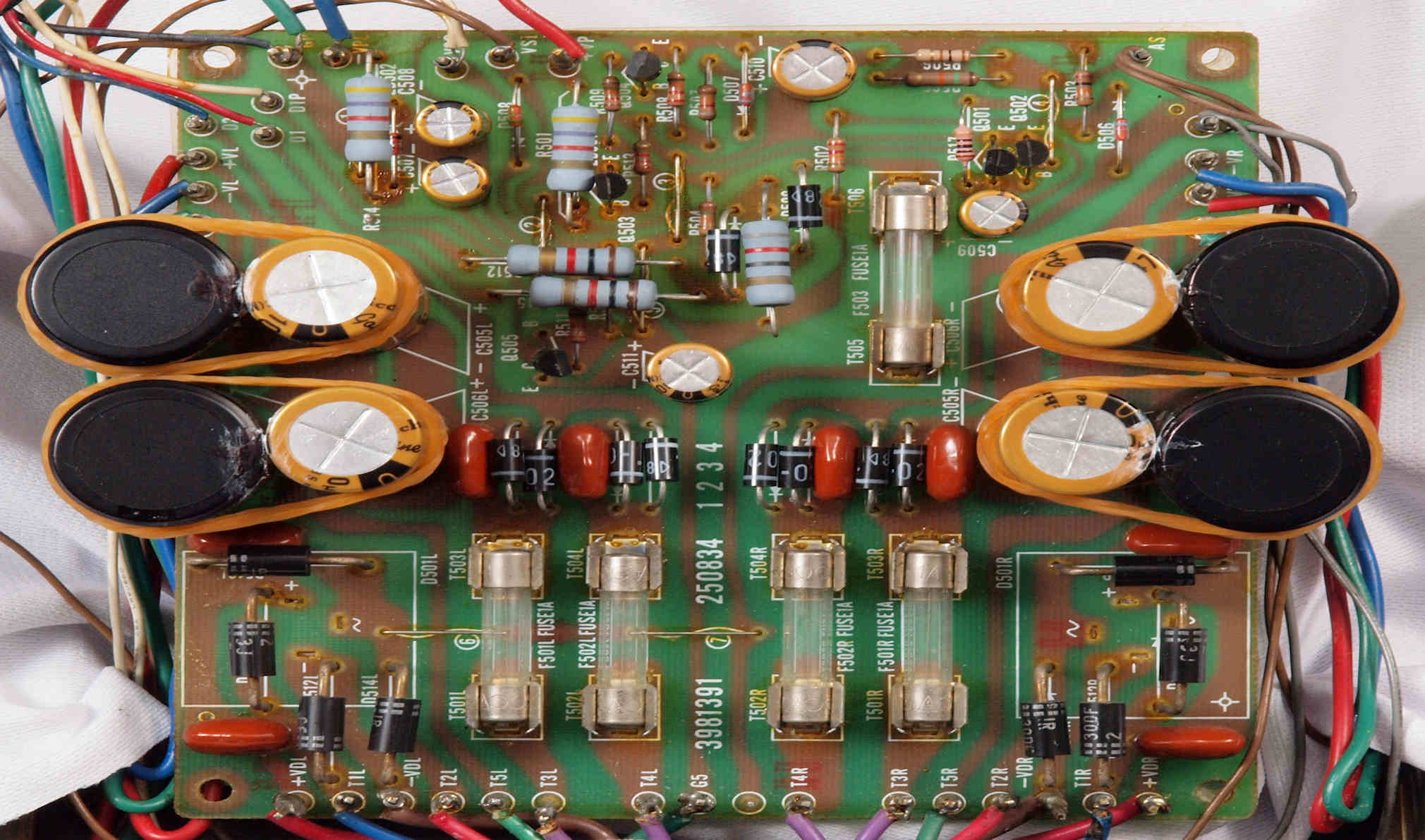 | C54. 修理後 電源基板 ヒューズ入り抵抗全部、電解コンデンサー9個交換。 輪ゴムは接着材が硬化するまで固定する。 |
