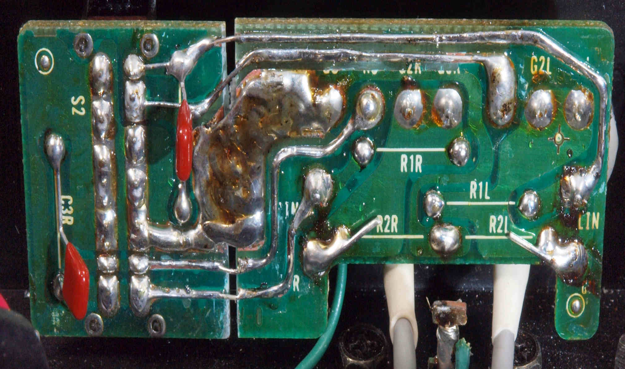 | C67. 修理(半田補正)後 RCA端子基板裏 半田を全部やり直す フイルムコンデンサー2個増設 |