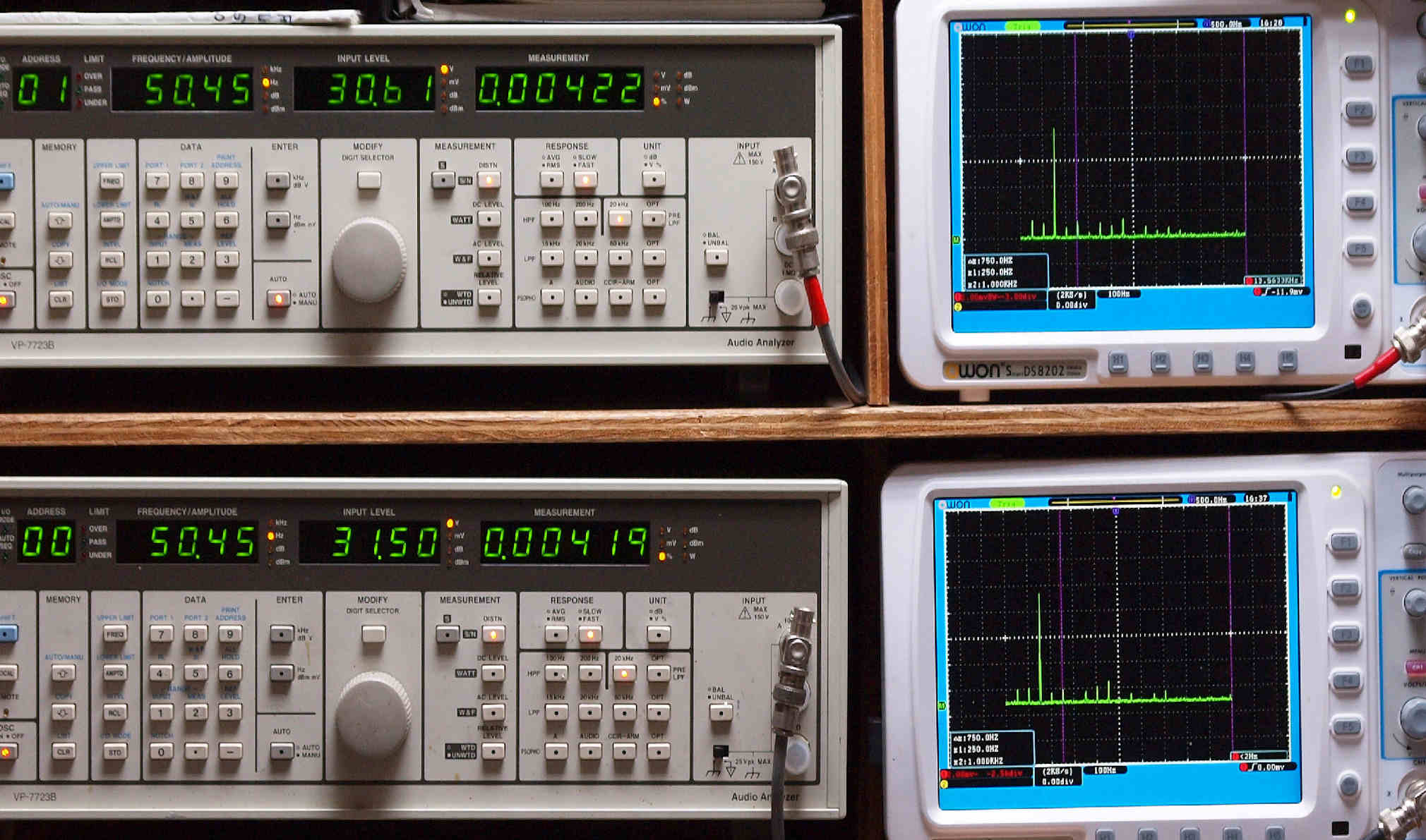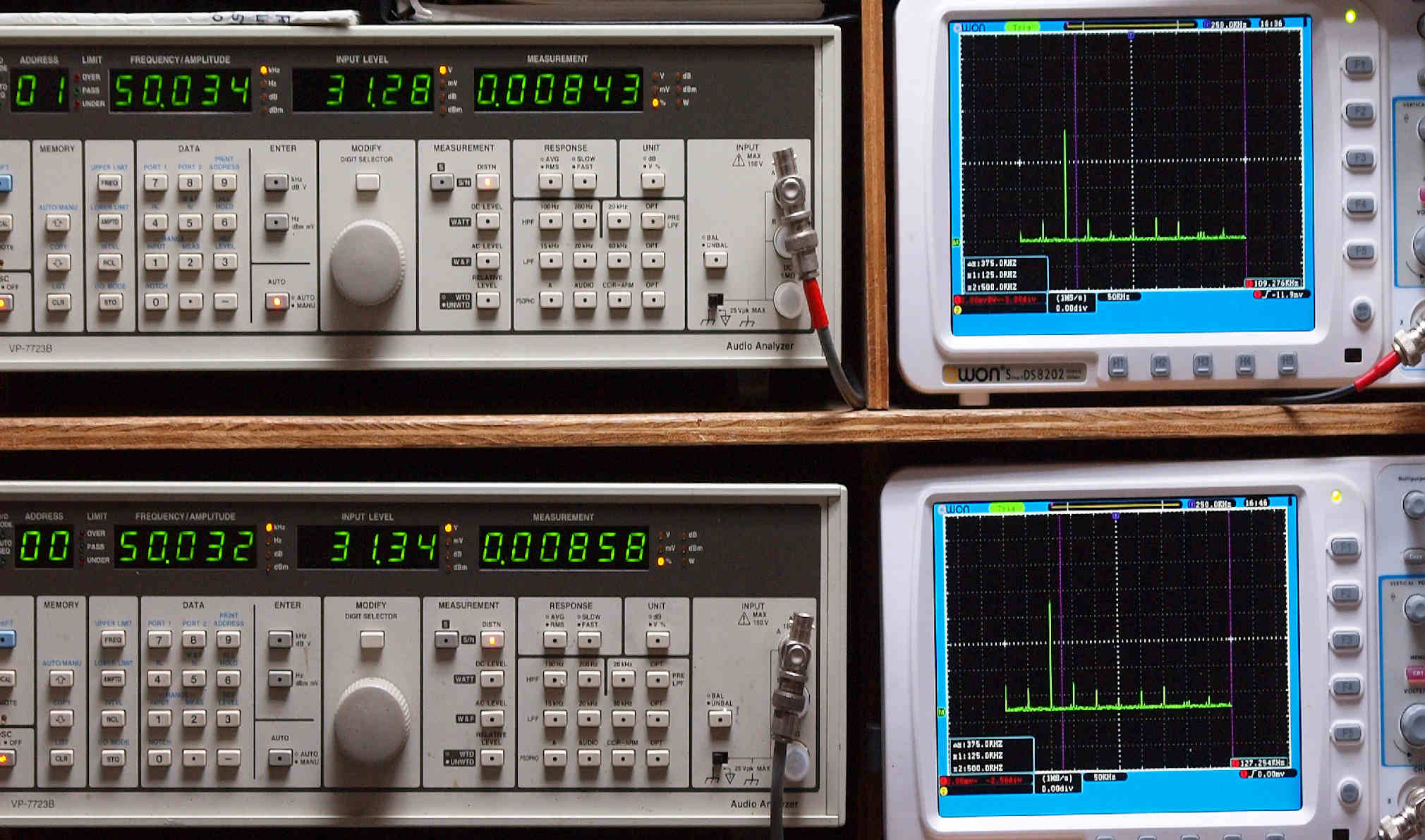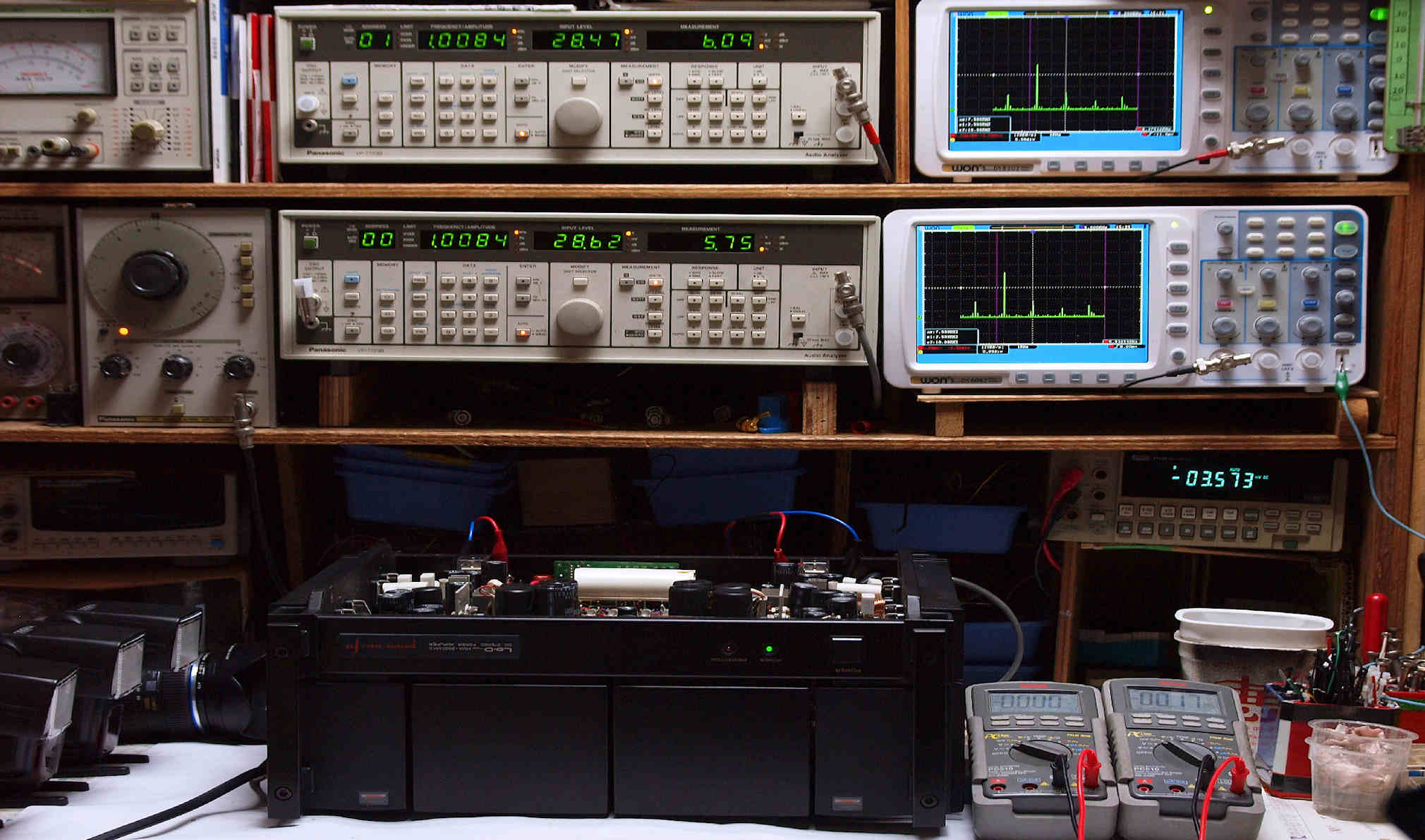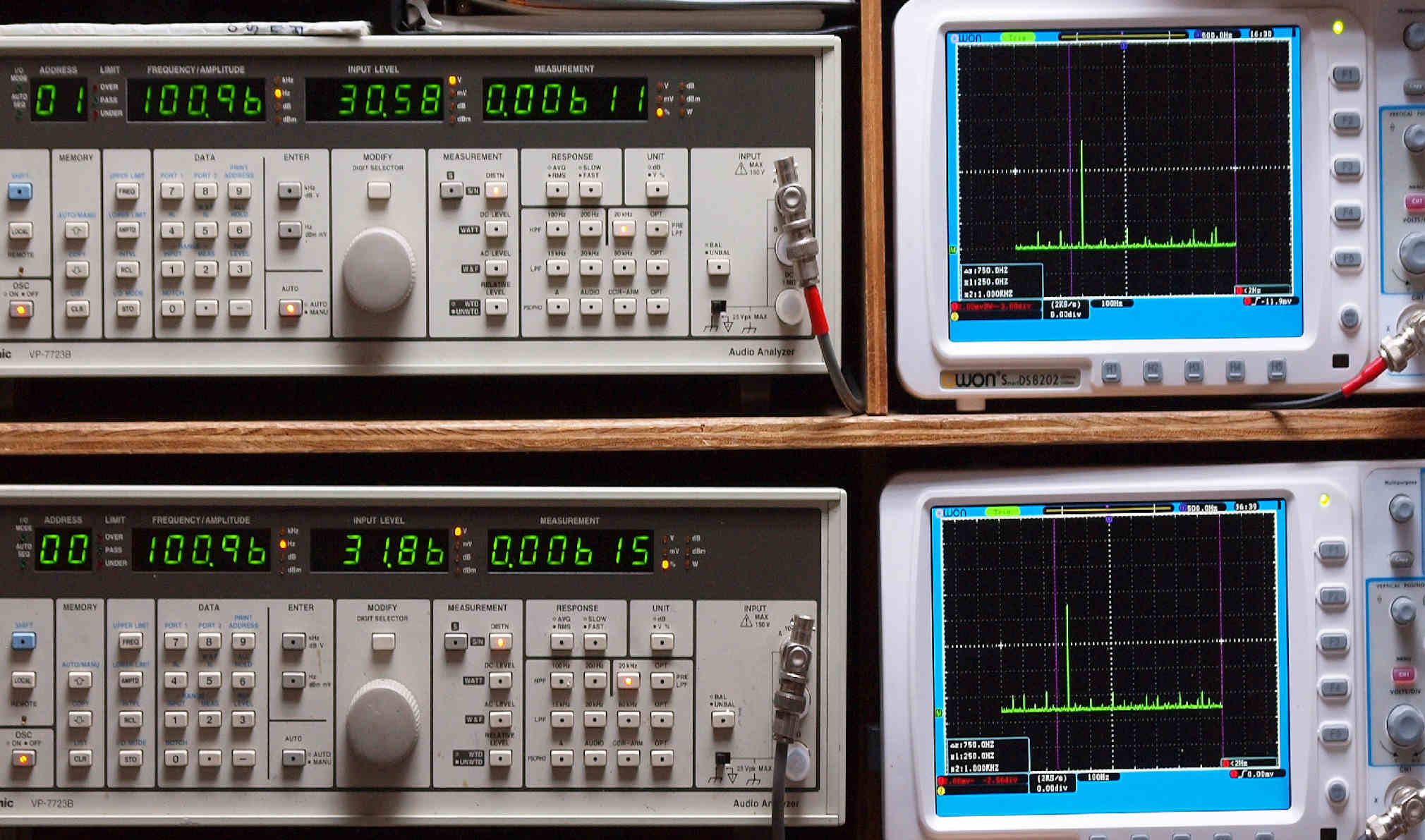 | T. バラック修理後の測定 T1. バラック修理後の出力・歪み率測定 「見方」。 上段中 右側SP出力を「Audio Analyzer Panasonic VP−7723B」により測定。 表示LED、 左端=メモリーNo、 中左=周波数測定、 中右=出力電圧測定、 右端=歪み率測定。 上段右端 VP−7723Bの基本波除去出力を「owon SDS8202(200MHZ)」で「FFT分析」表示。 下段中 左側SP出力を「Audio Analyzer Panasonic VP−7723B」により測定。 表示LED、 左端=メモリーNo、 中左=周波数測定、 中右=出力電圧測定、 右端=歪み率測定。 下段右端 VP−7723Bの基本波除去出力を「owon SDS6062(200MHZ)」で「FFT分析」表示。 下段左端 オーディオ発振器 VP−7201A より50Hz〜100kHzの信号を出し(歪み率=約0.003%)、ATT+分配器を通し、AMPに入力。 よって、ダイアル設定出力レベルより低くなります。測定機器の仕様や整備の様子はこちら、「VP−7723B」「VP−7201A」。 FFT画面の見方はこちら。 |