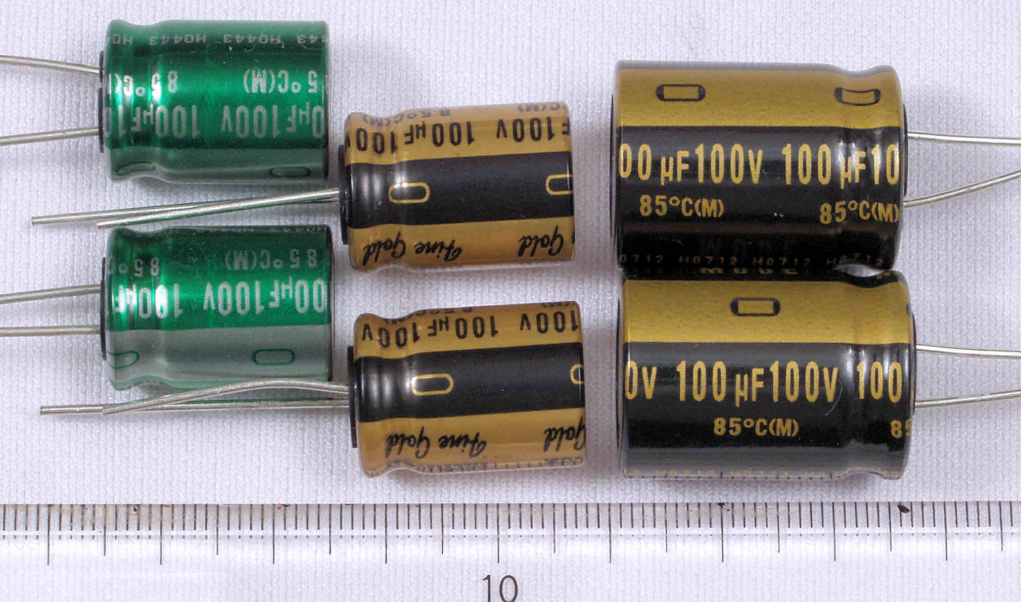 | A41. 点検中 電解コンデンサー外観比較、100μ/100V |