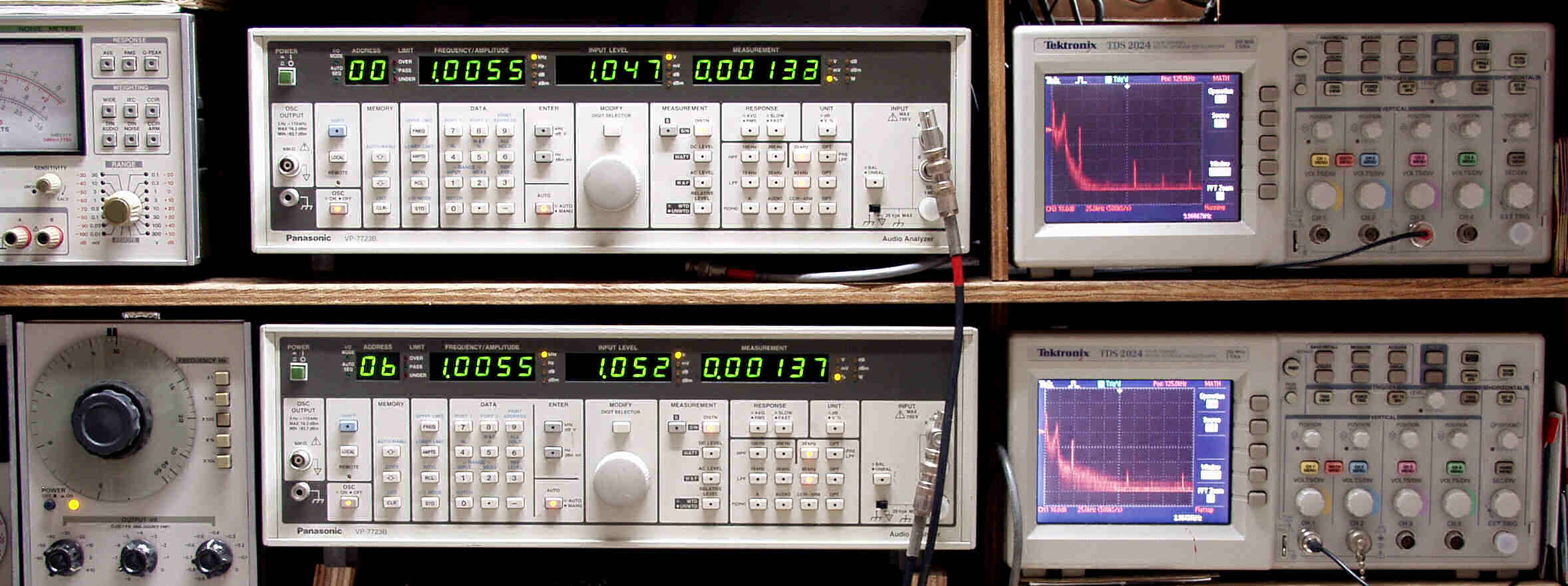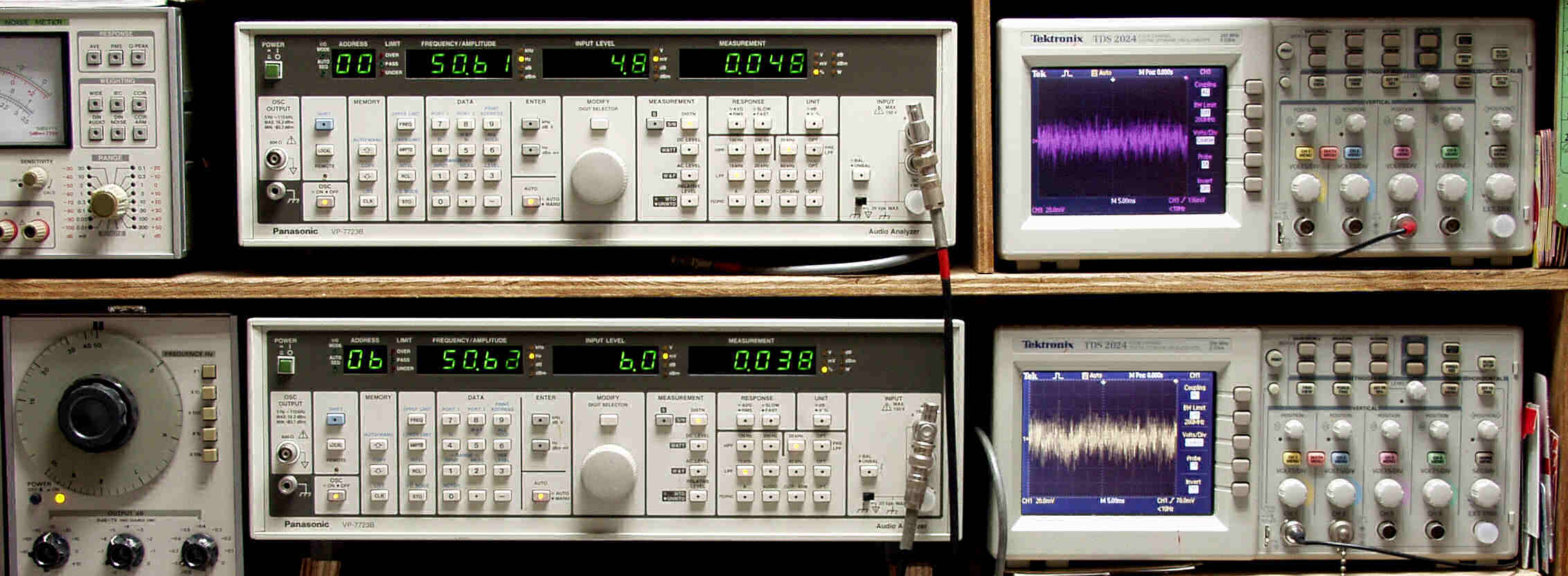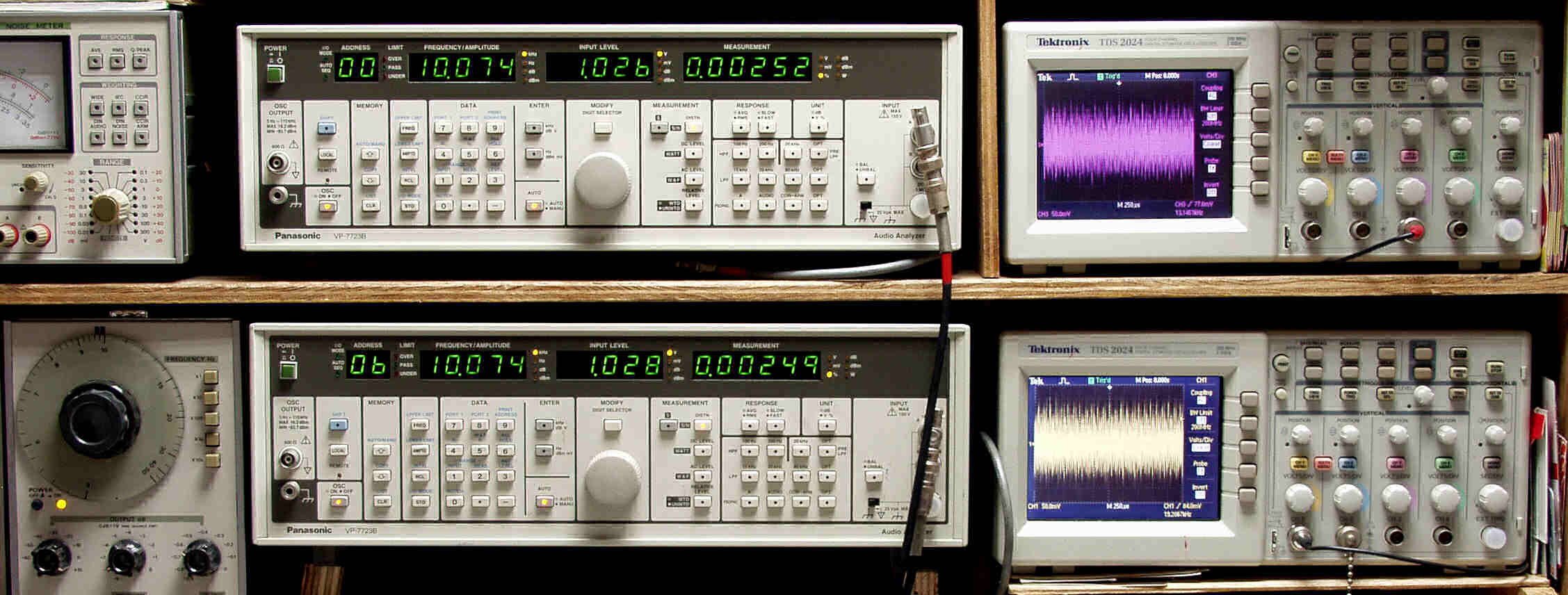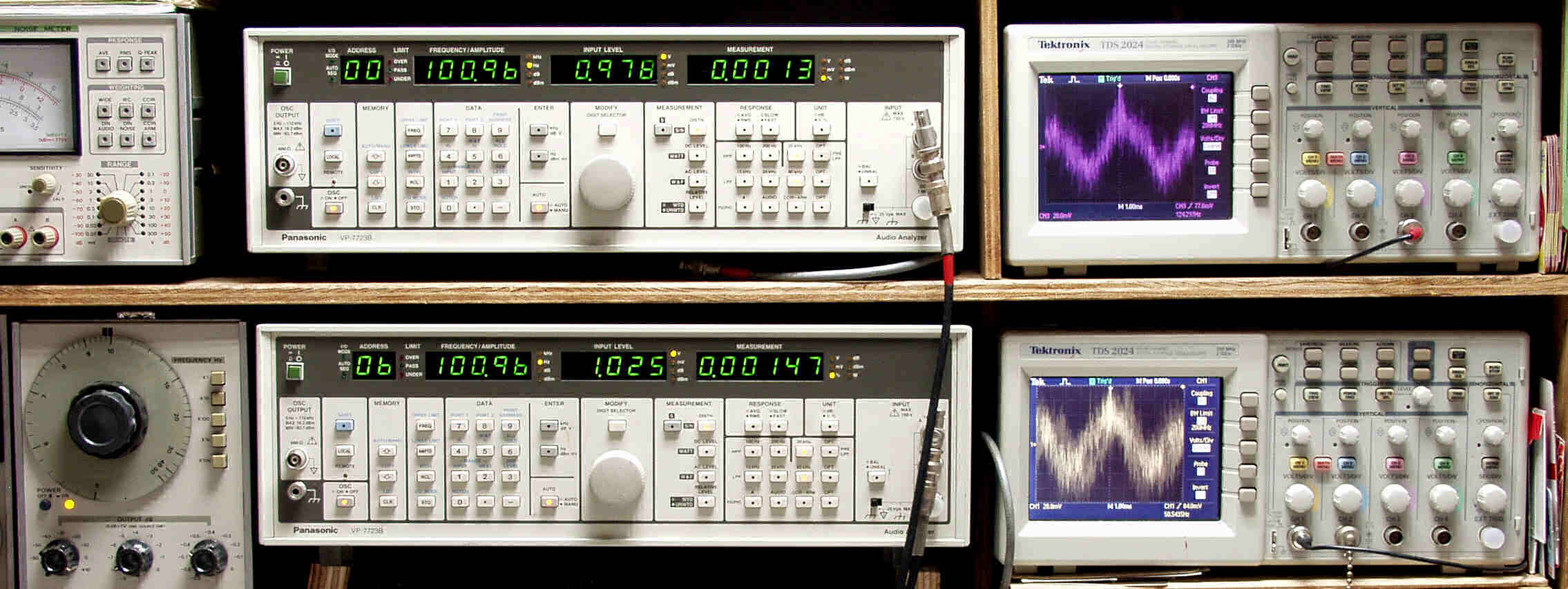 | G. 測定機器の出力・歪み率測定。最新の測定方法はこちら。 「見方」。 上段中央オーディオアナライザ VP−7723B=R側測定。LED表示は右から、「歪み率」、「SP出力電圧」、「周波数」。 下段中央オーディオアナライザ VP−7723B=L側測定。LED表示は右から、「歪み率」、「SP出力電圧」、「周波数」。 上段右端オシロ TDS−2024=R側歪み出力波形表示。 下段右端オシロ TDS−2024=L側歪み出力波形表示。 下段左端 オーディオ発振器 VP−7201A より50Hz〜50kHzの信号を出し(歪み率=約0.003%)、 ATT+分配器を通し測定する。 よって、発振器ダイアル設定出力レベルより低くなります。 AUXレベル100mV=CD、Tuner、Radio、Tape入力等のレベル。 MMレベル5mV =PonoMMカートリッジのレベル。 VV−AMP1V=真空管メインAMPや大型AMPのレベル。 |