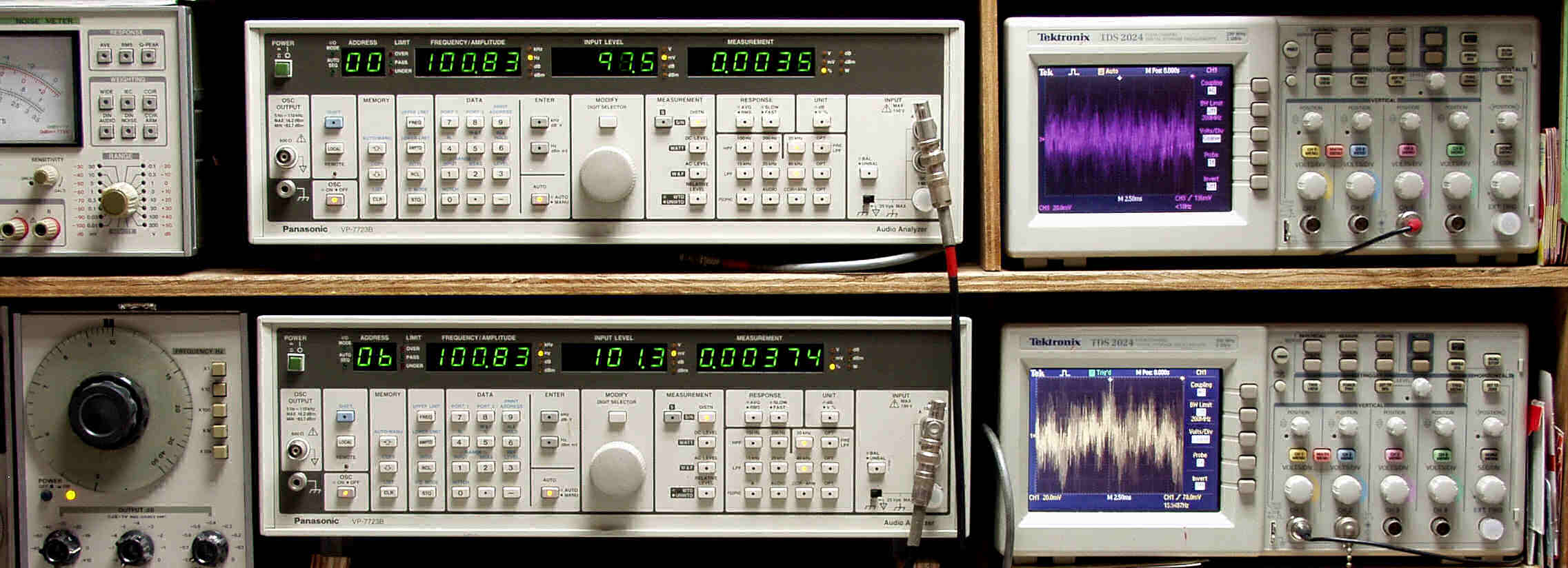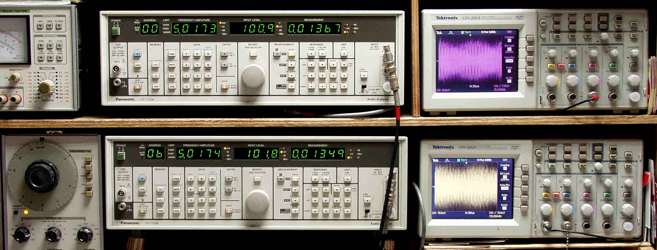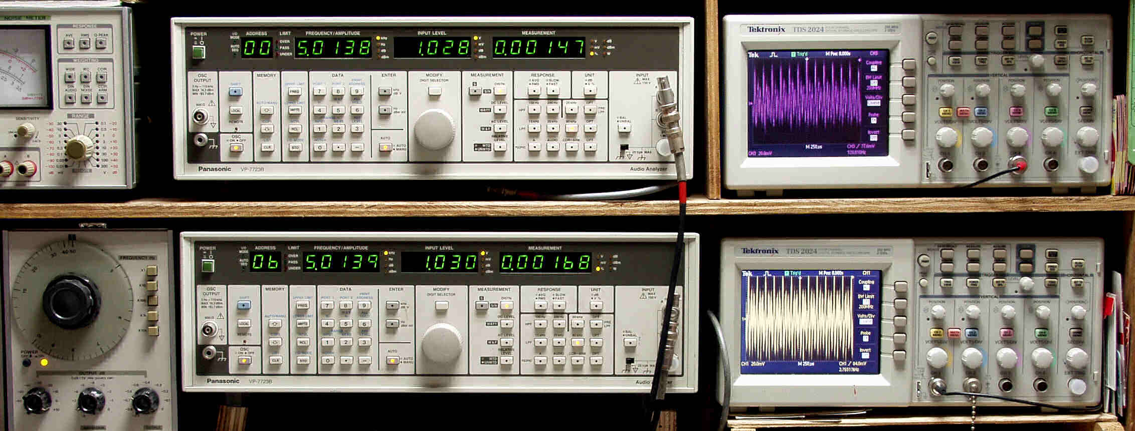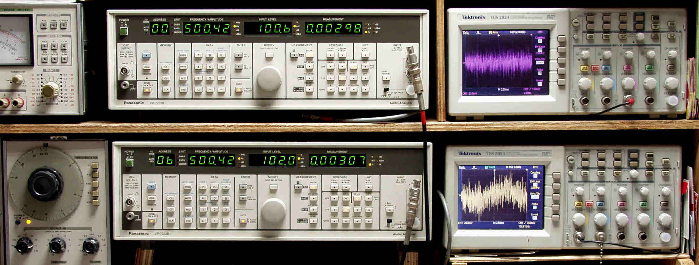 | G. 測定機器の出力・歪み率測定。最新の測定方法はこちら。 「見方」。 上段中央オーディオアナライザ VP−7723B=R側測定。LED表示は右から、「歪み率」、「SP出力電圧」、「周波数」。 下段中央オーディオアナライザ VP−7723B=L側測定。LED表示は右から、「歪み率」、「SP出力電圧」、「周波数」。 上段右端オシロ TDS−2024=R側歪み出力波形表示。 下段右端オシロ TDS−2024=L側歪み出力波形表示。 下段左端 オーディオ発振器 VP−7201A より50Hz〜50kHzの信号を出し(歪み率=約0.003%)、 ATT+分配器を通し測定する。 よって、発振器ダイアル設定出力レベルより低くなります。 AUXレベル100mV=CD、Tuner、Radio、Tape入力等のレベル。 MMレベル5mV =PonoMMカートリッジのレベル。 VV−AMP1V=真空管メインAMPや大型AMPのレベル。 |