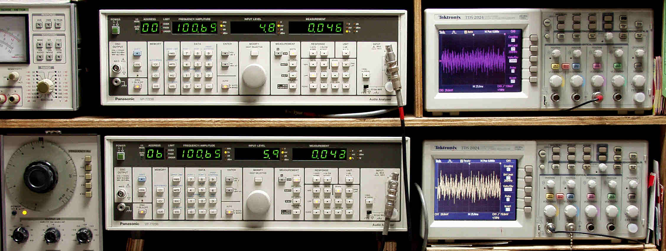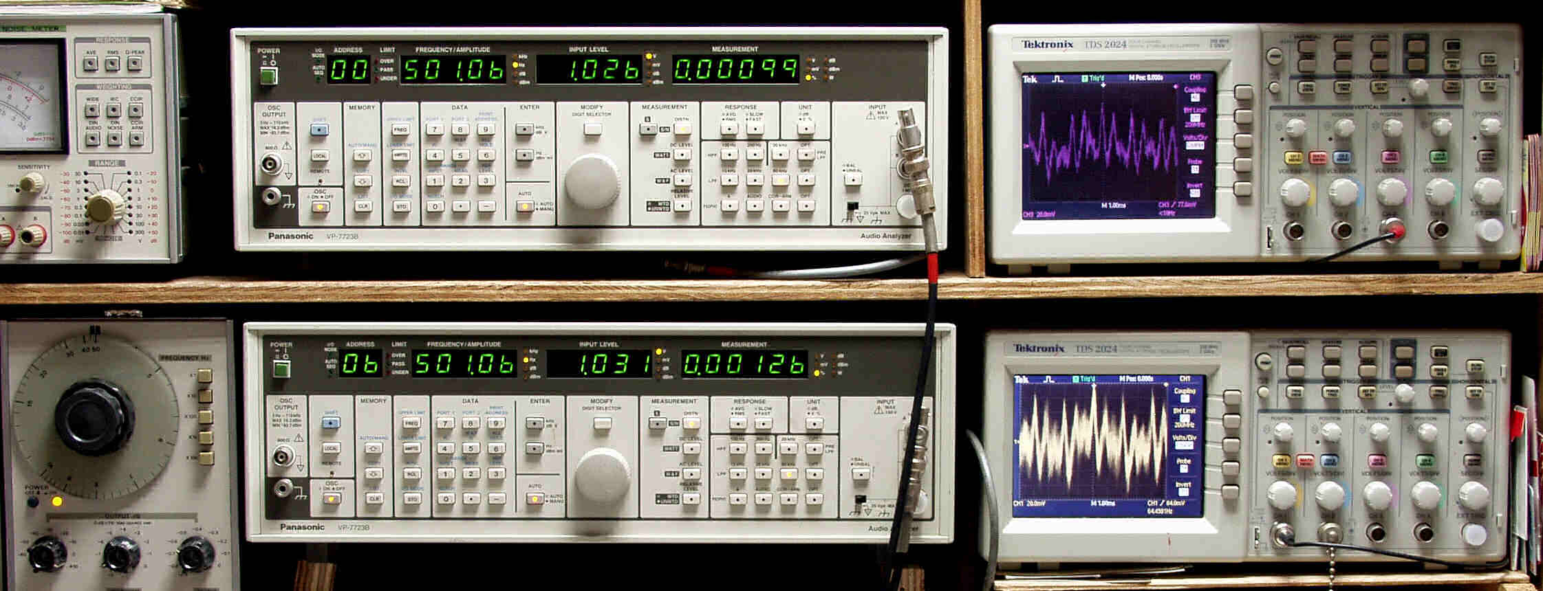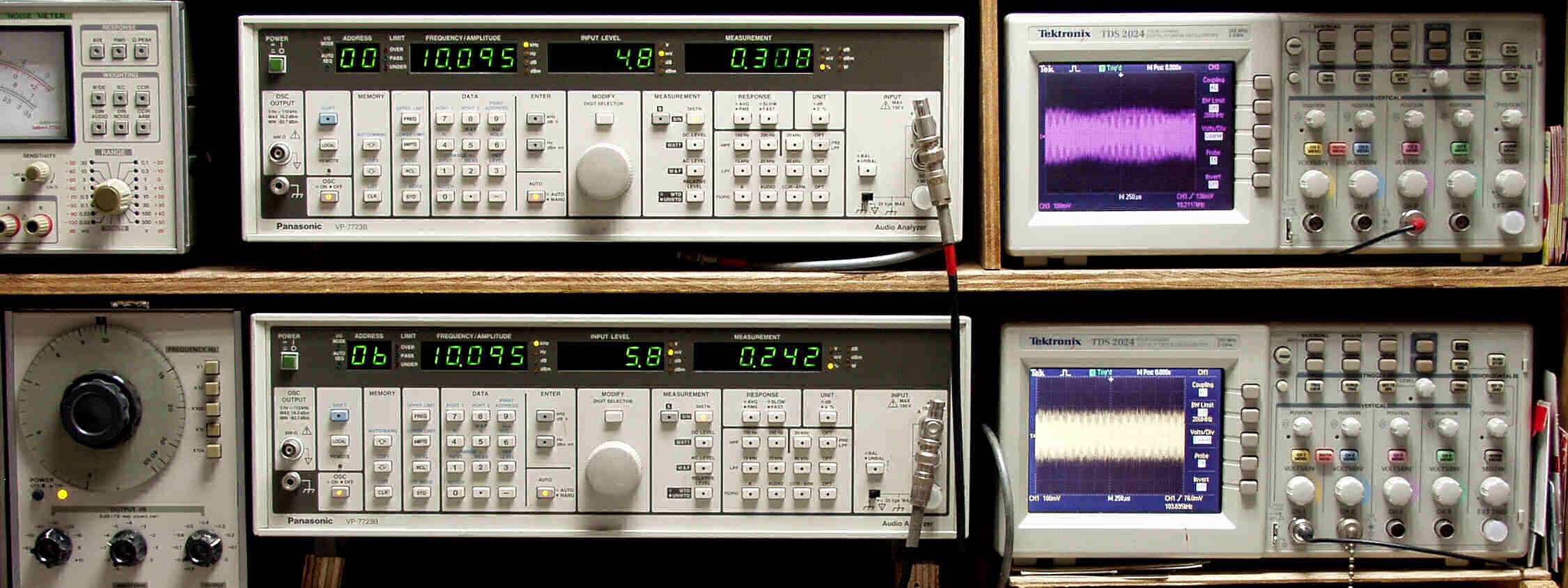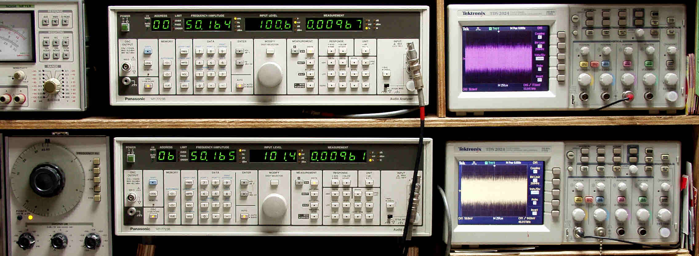 | G. 測定機器の出力・歪み率測定。最新の測定方法はこちら。 「見方」。 上段中央オーディオアナライザ VP−7723B=R側測定。LED表示は右から、「歪み率」、「SP出力電圧」、「周波数」。 下段中央オーディオアナライザ VP−7723B=L側測定。LED表示は右から、「歪み率」、「SP出力電圧」、「周波数」。 上段右端オシロ TDS−2024=R側歪み出力波形表示。 下段右端オシロ TDS−2024=L側歪み出力波形表示。 下段左端 オーディオ発振器 VP−7201A より50Hz〜50kHzの信号を出し(歪み率=約0.003%)、 ATT+分配器を通し測定する。 よって、発振器ダイアル設定出力レベルより低くなります。 AUXレベル100mV=CD、Tuner、Radio、Tape入力等のレベル。 MMレベル5mV =PonoMMカートリッジのレベル。 VV−AMP1V=真空管メインAMPや大型AMPのレベル。 |