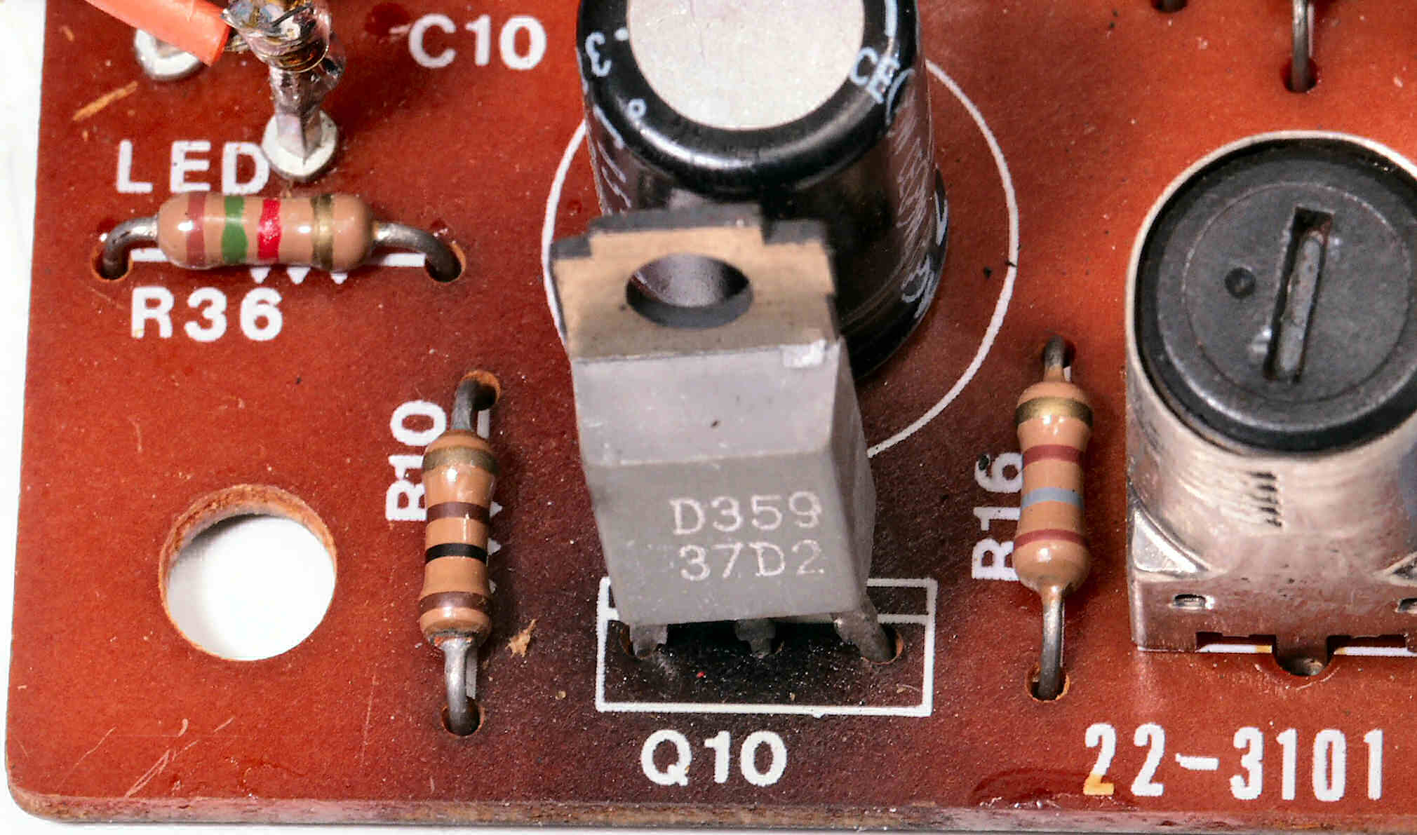 | C112. 修理前 基板、出力TR(トランジスター)の回りの基板が熱で変色 |