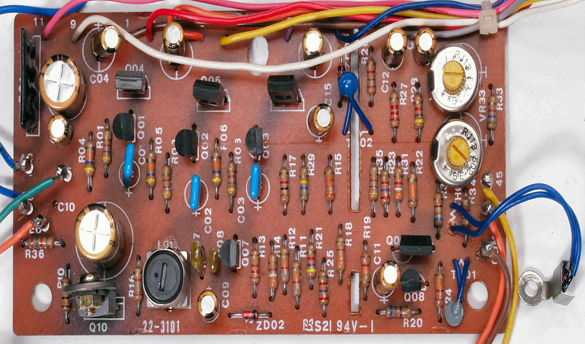 | C12 .修理後 基板 半固定VR2個、電解コンデンサー11個、フイルムコンデンサー3個交換 |
