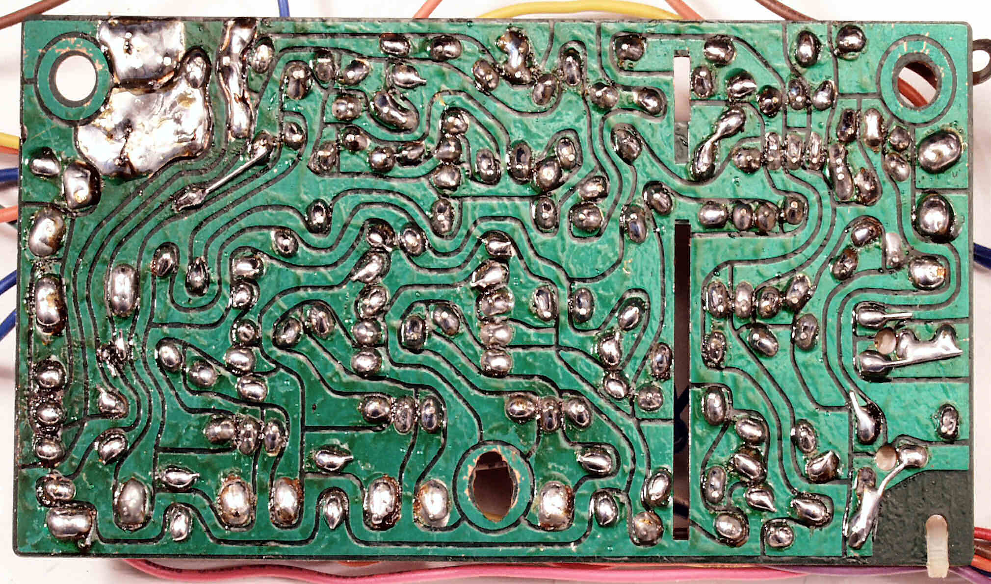 | C132. 修理前 基板裏、出力TR(トランジスター)の足の半田が熱で劣化 |