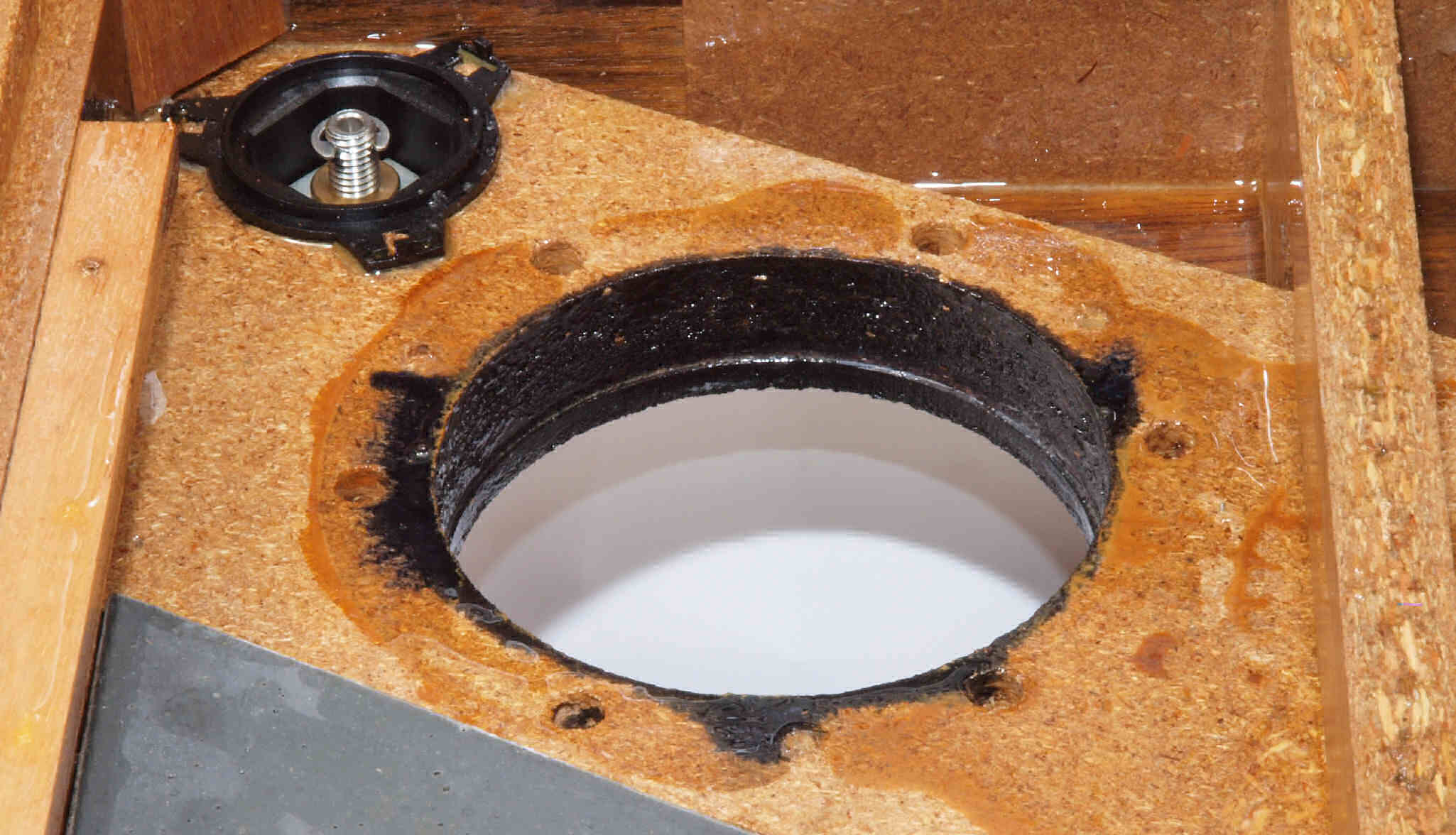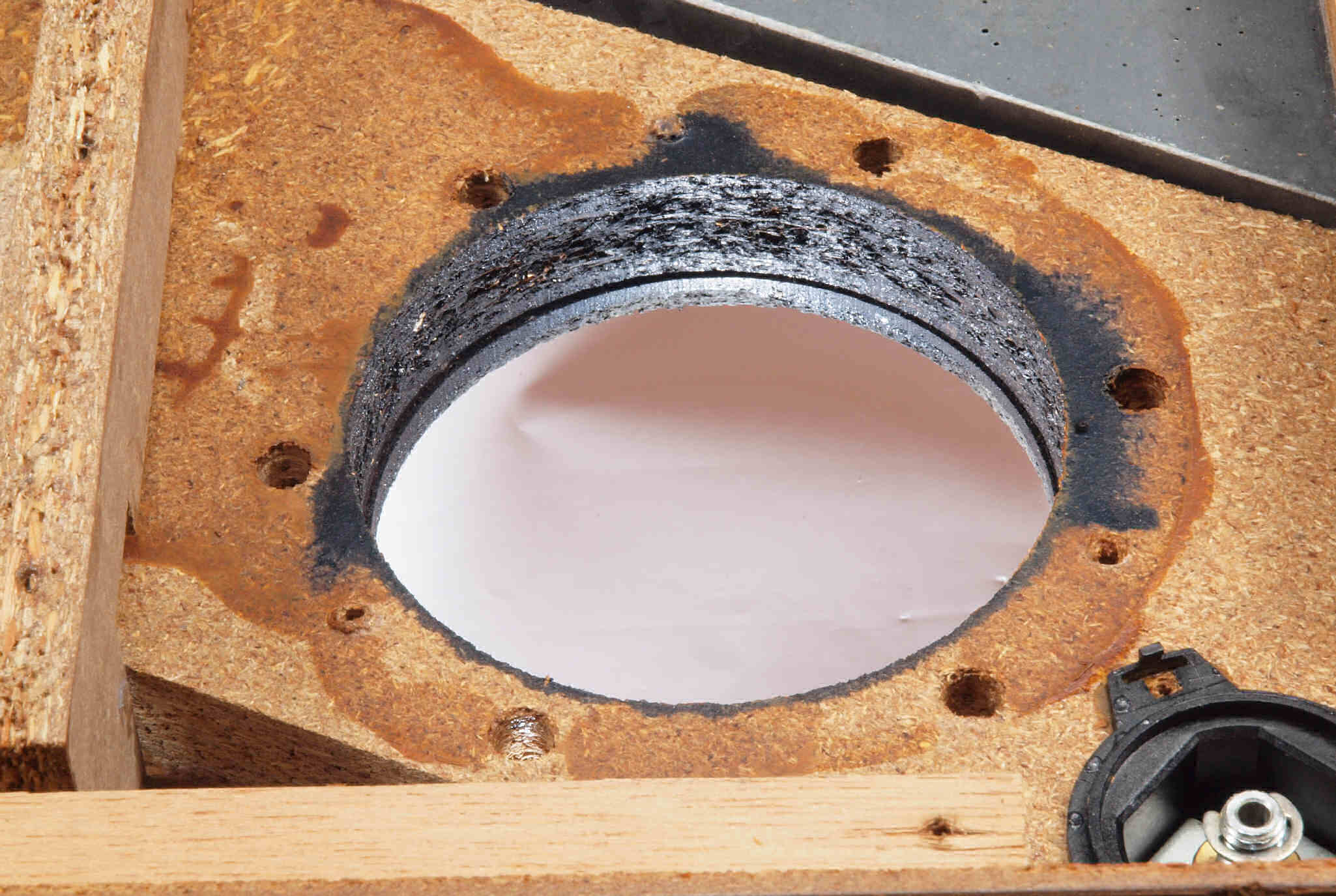 | W25. 修理中 アーム取付穴。 圧縮材にボンドを染みこませる。 | ||||||||||||||||||||||||||||||