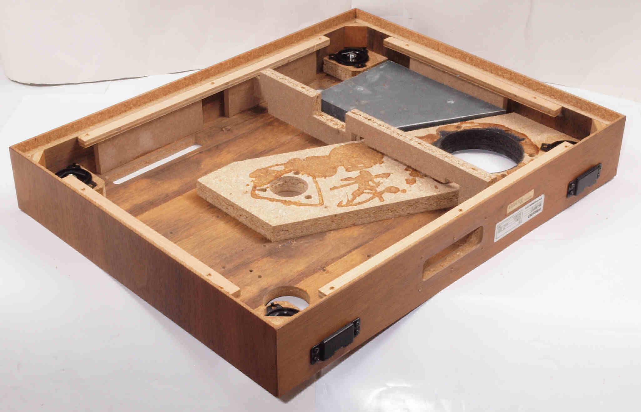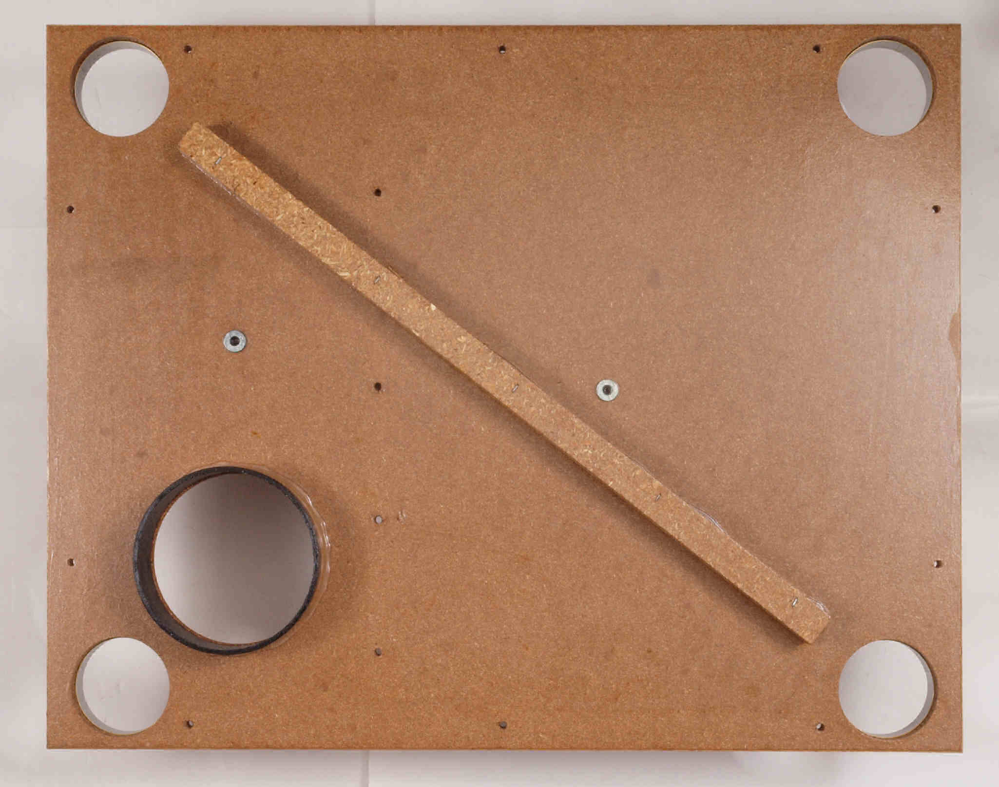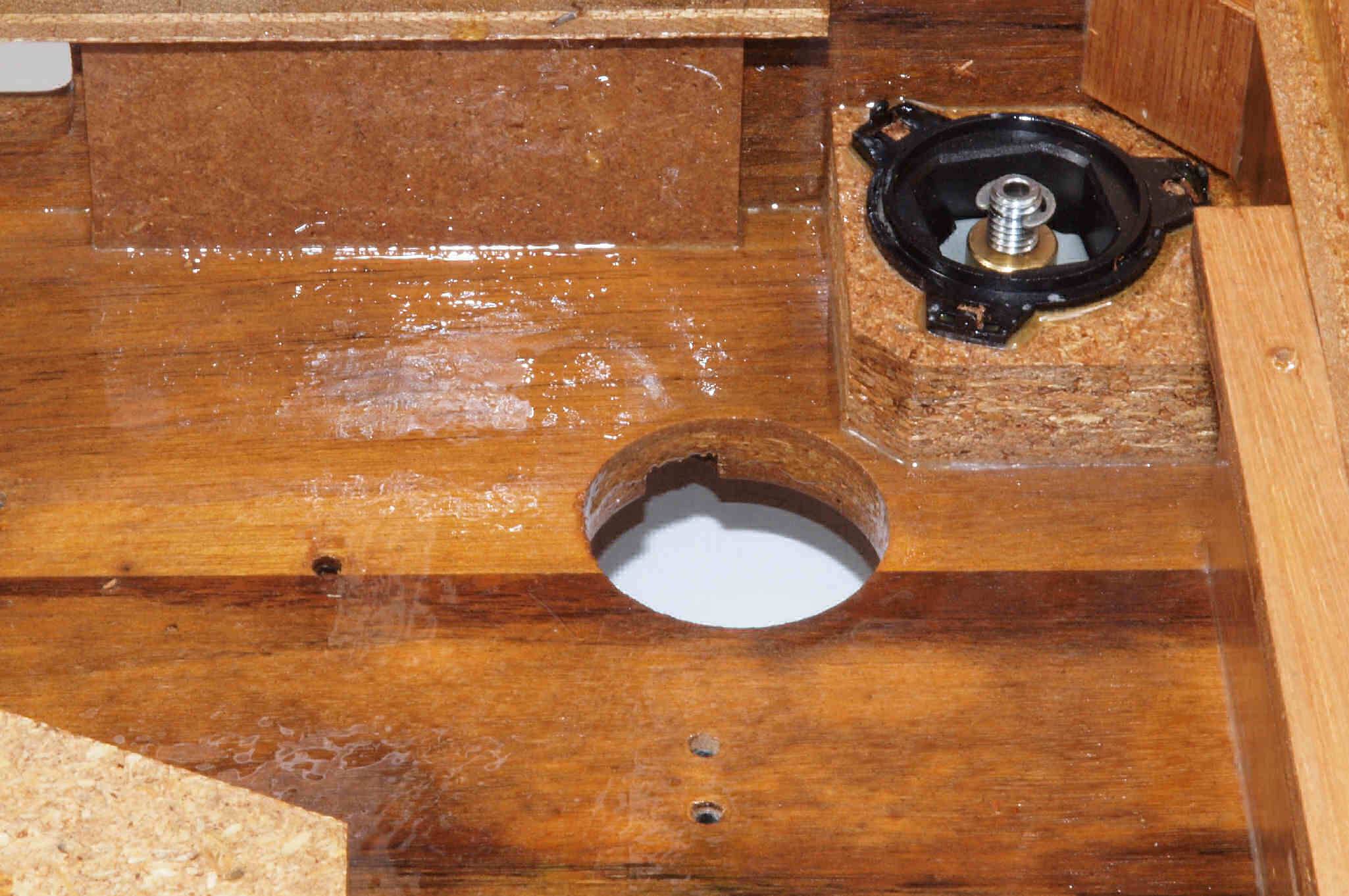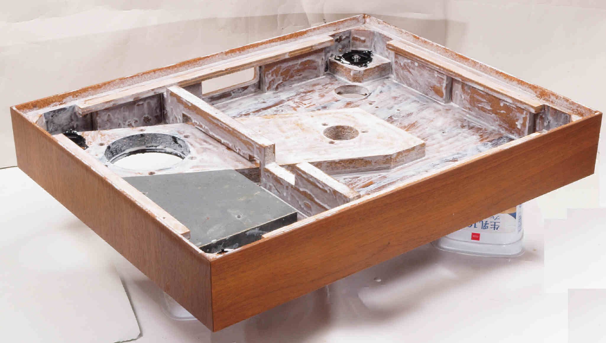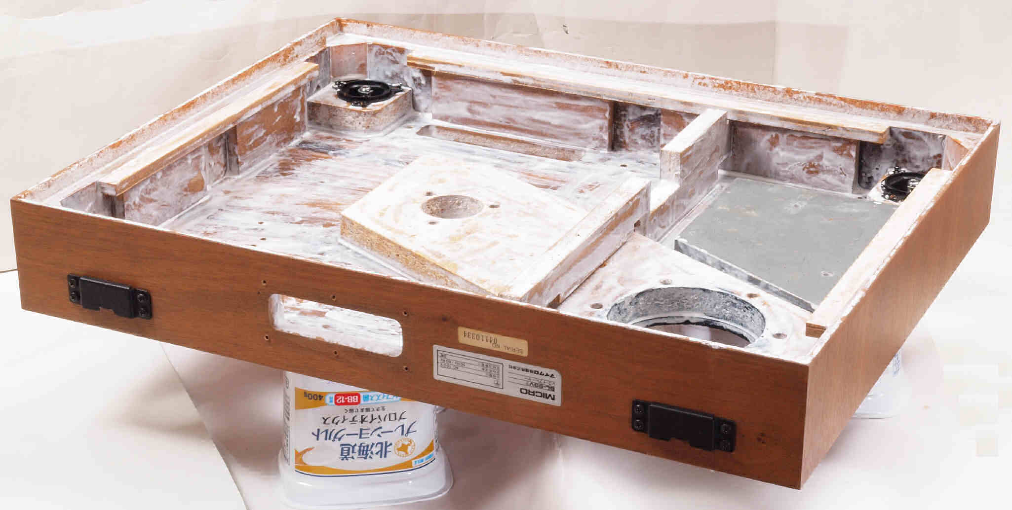 | W32. 修理中 プラッター軸受取付穴。 圧縮材にボンドを染みこませる、ネジ穴も塗る。 | ||||||||||||||||||||||||||||||