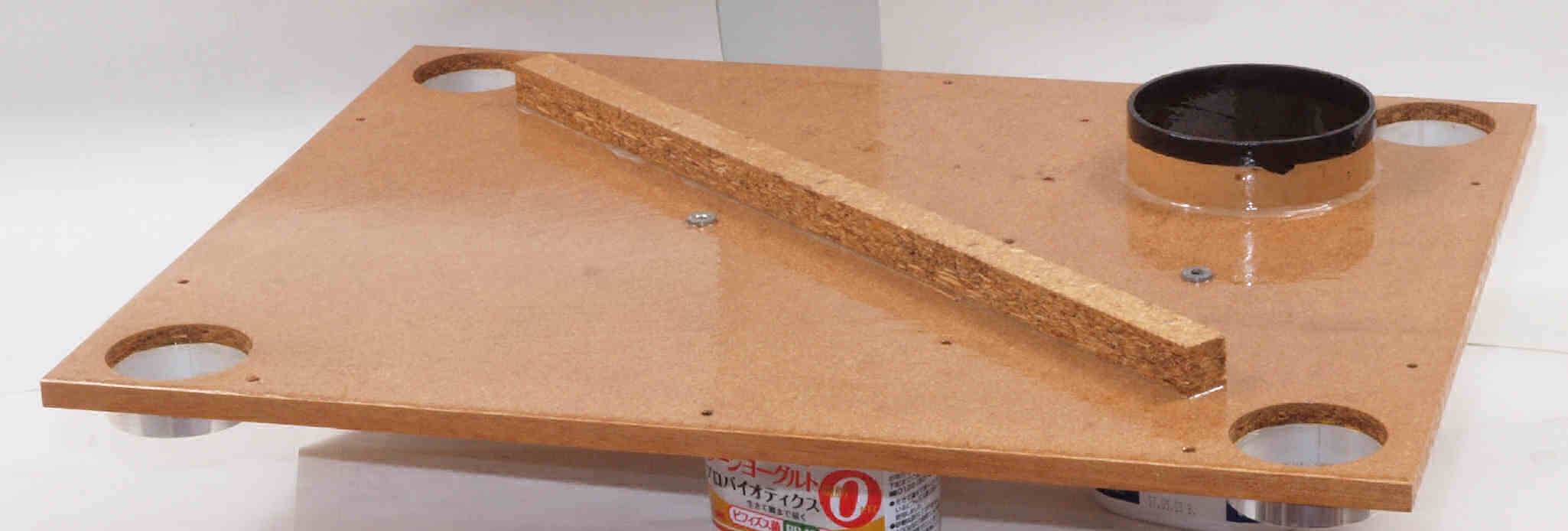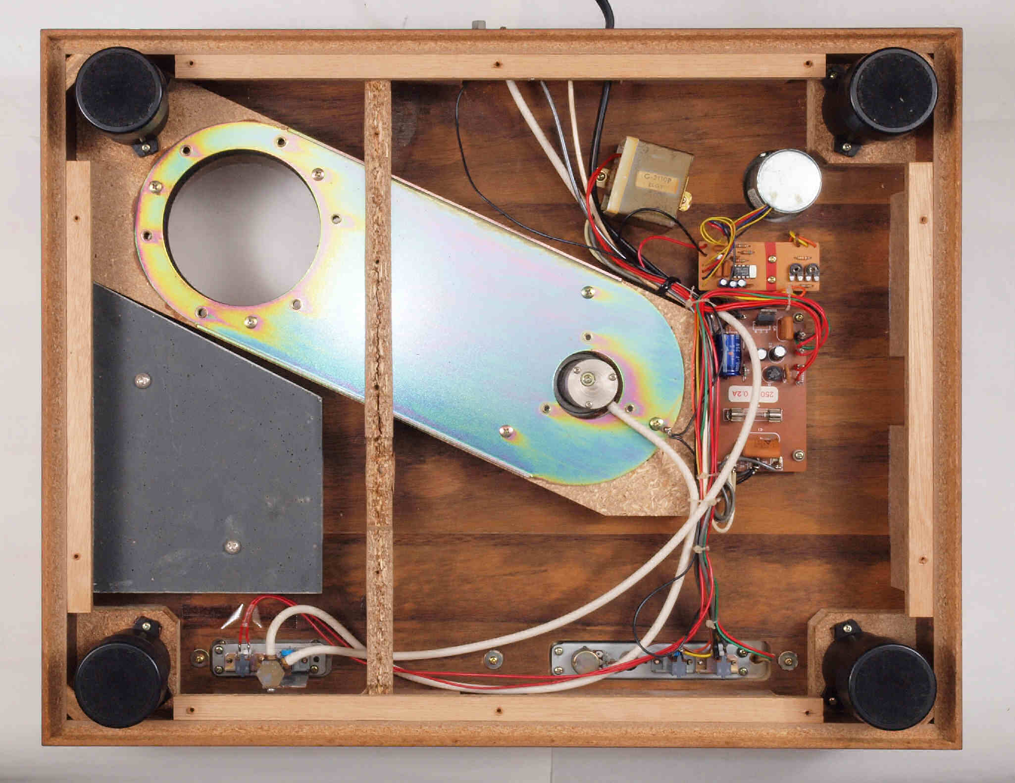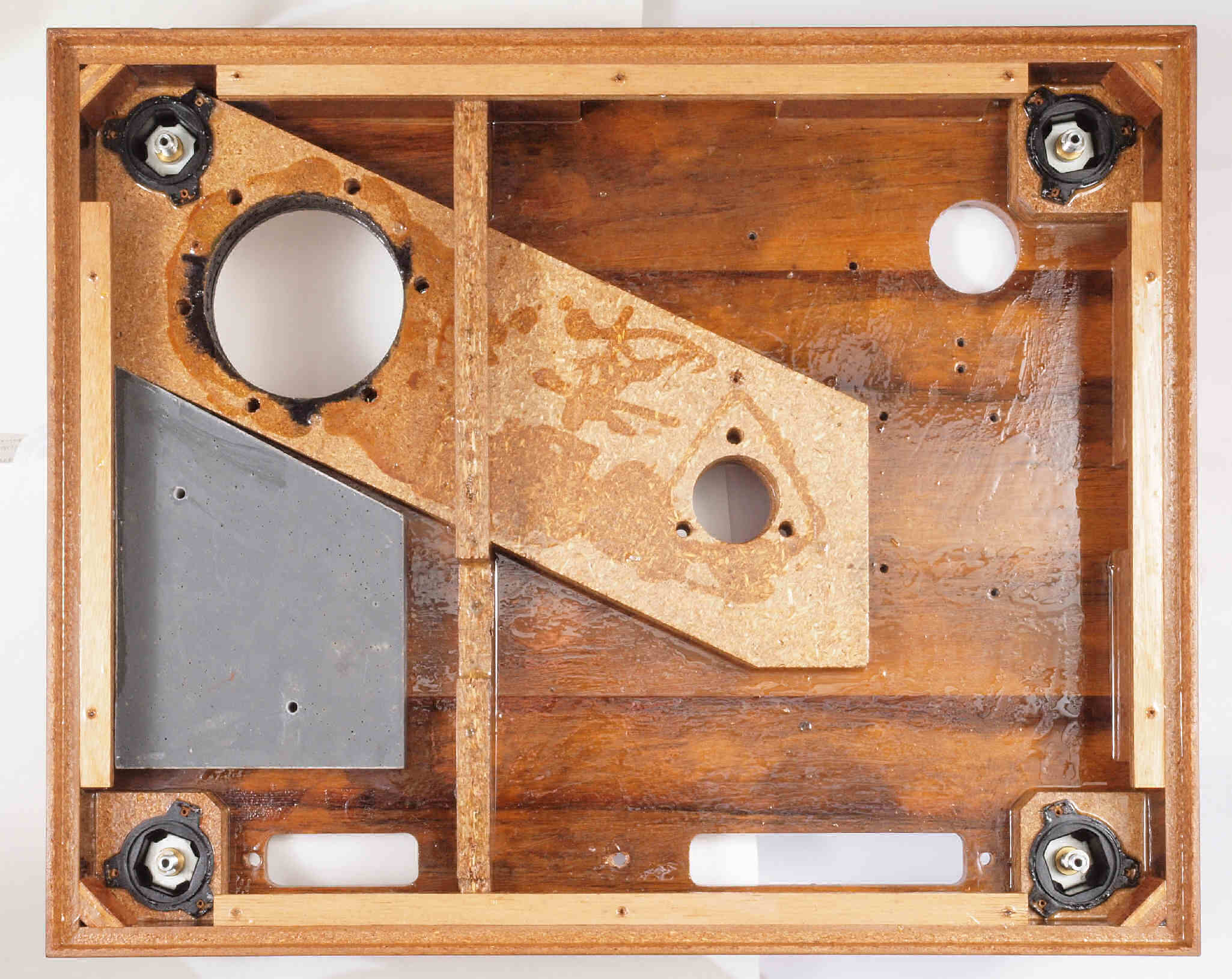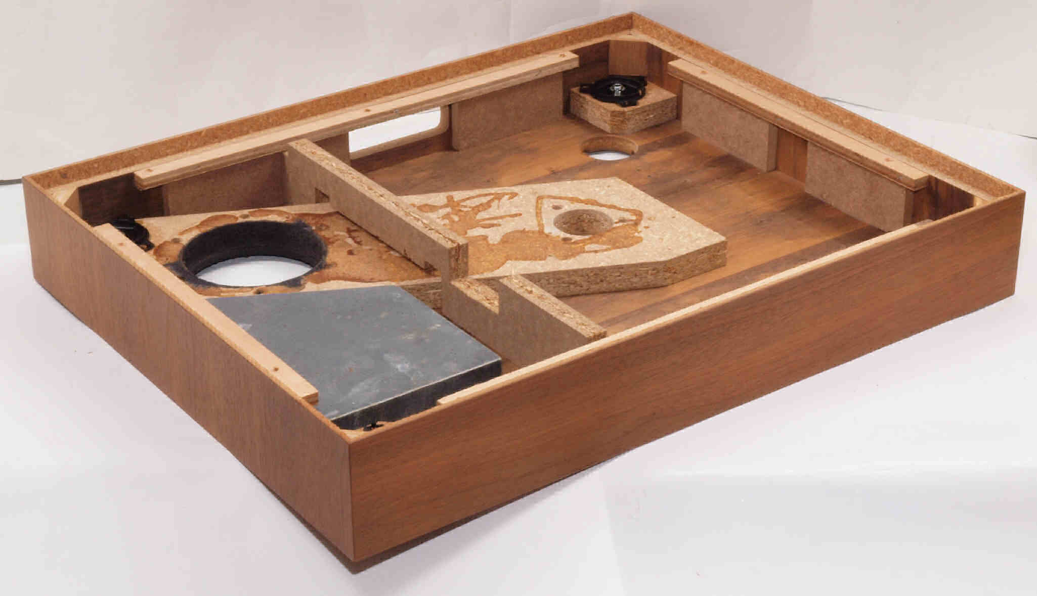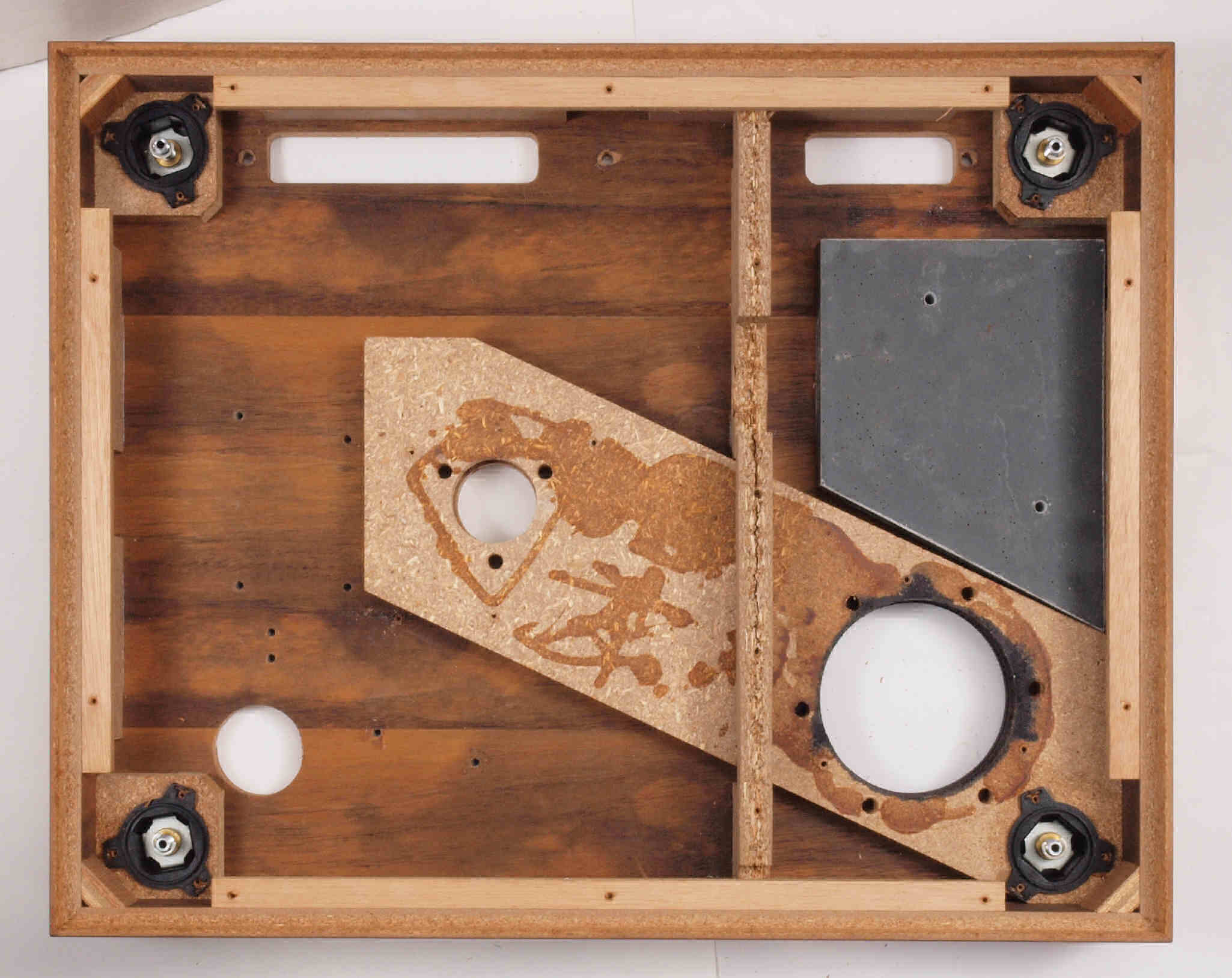 | W32. 修理中 プラッター軸受取付穴。 圧縮材にボンドを染みこませる、ネジ穴も塗る。 | ||||||||||||||||||||||||||||||