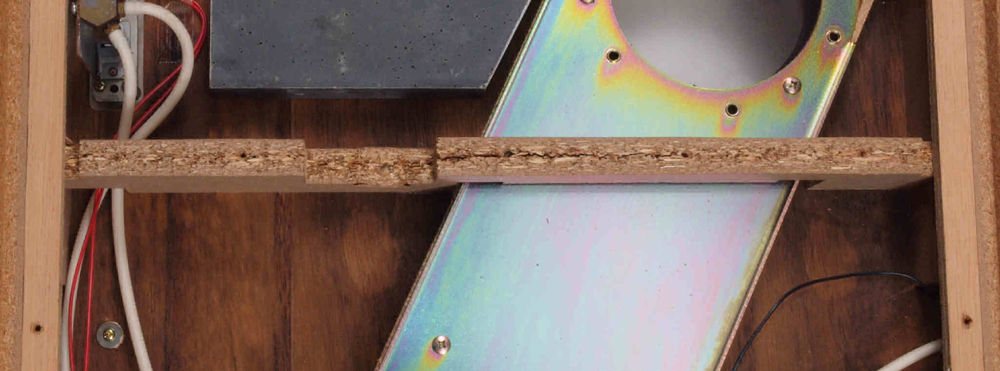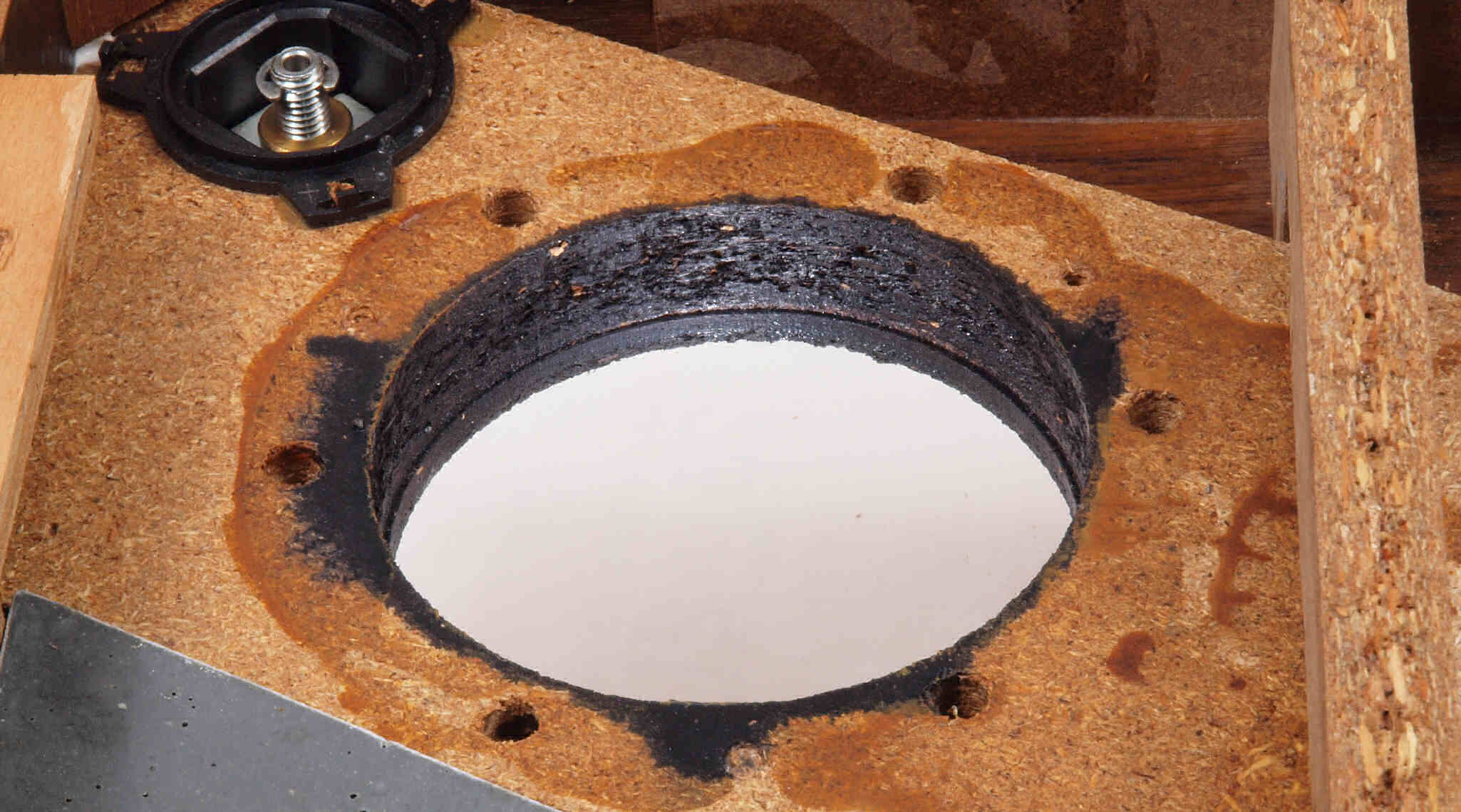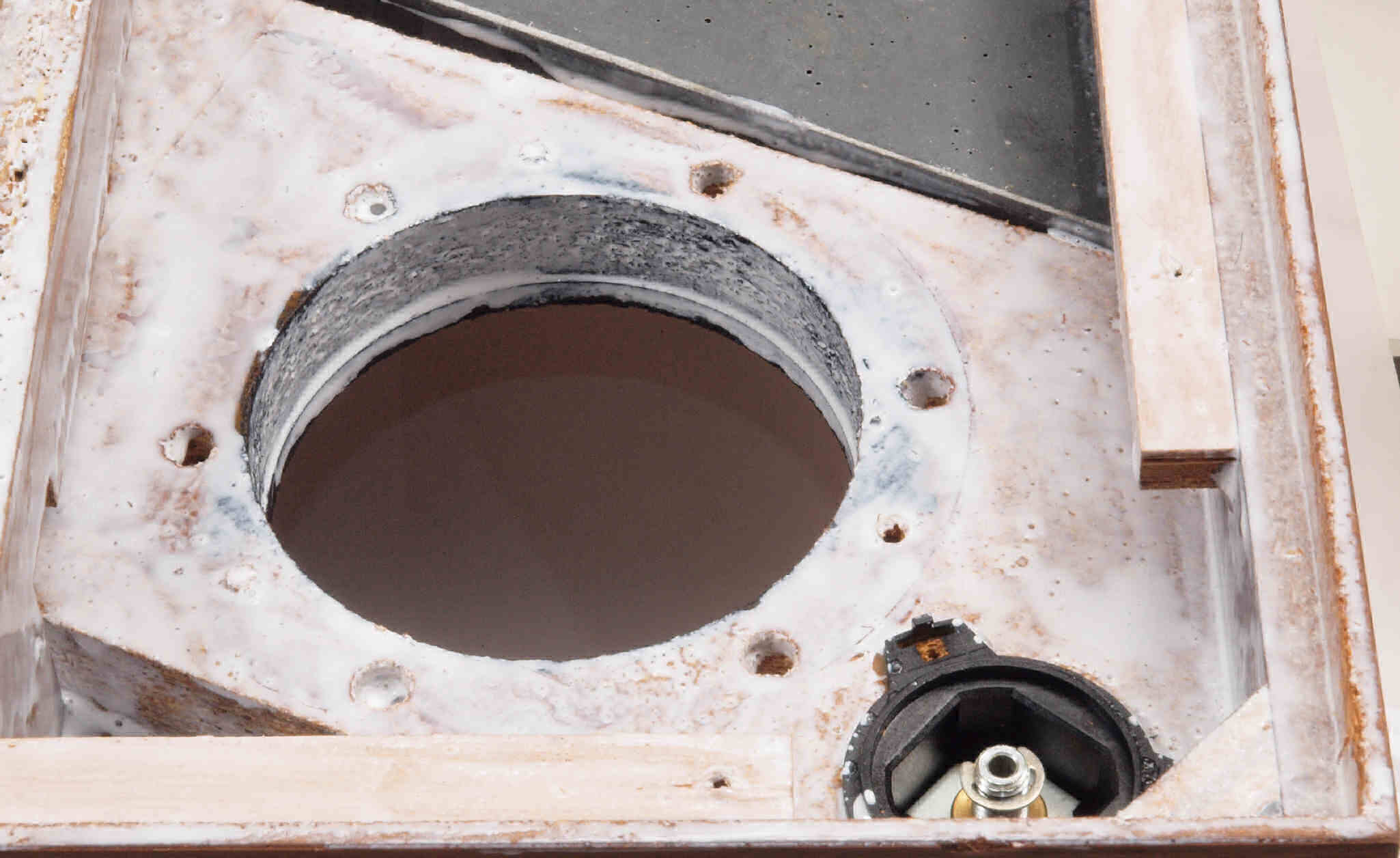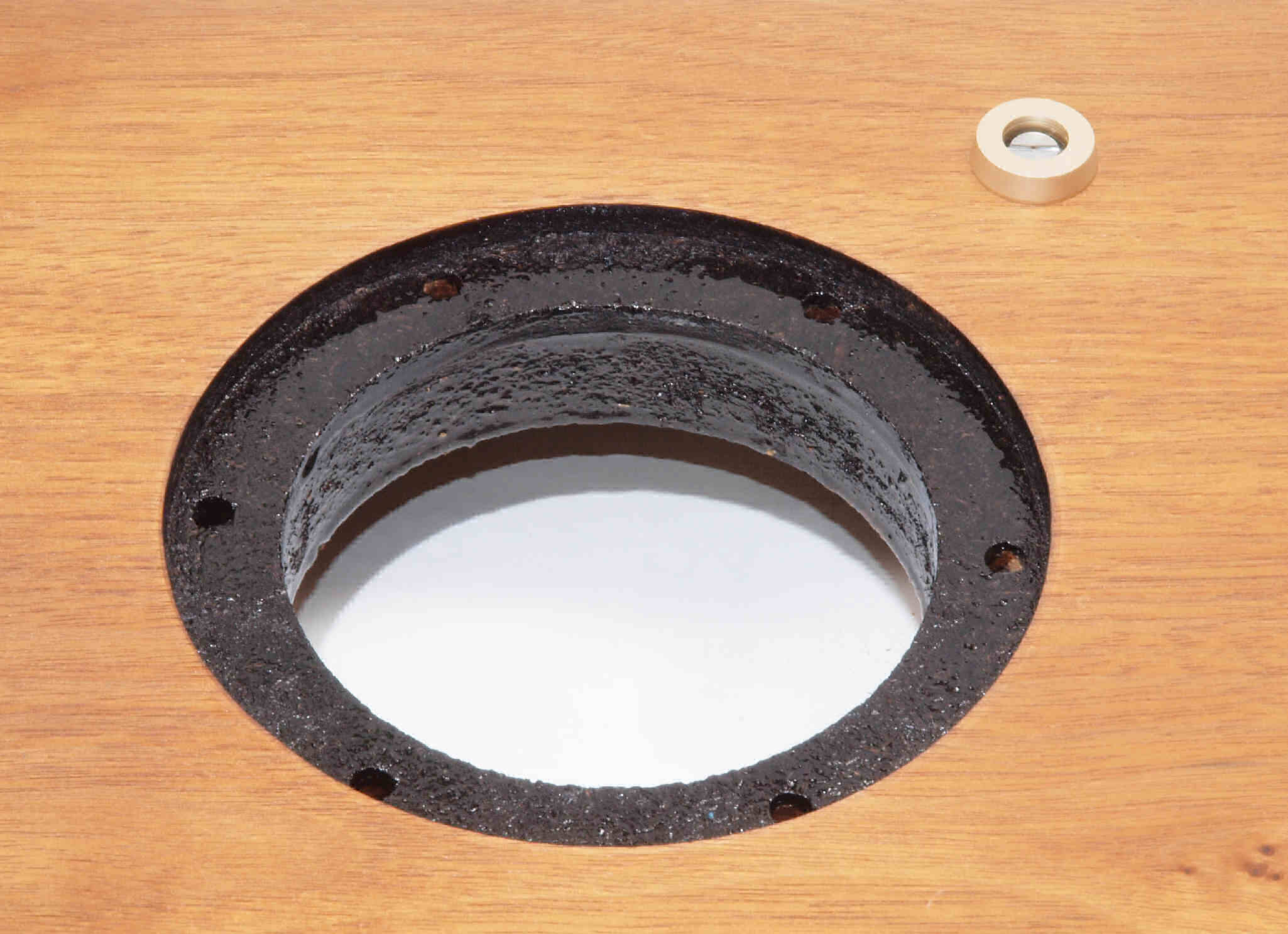 | W35. 修理中 プラッター軸受取付穴、反対側。 圧縮材にボンドを染みこませる、ネジ穴も塗る。 | ||||||||||||||||||||||||||||||