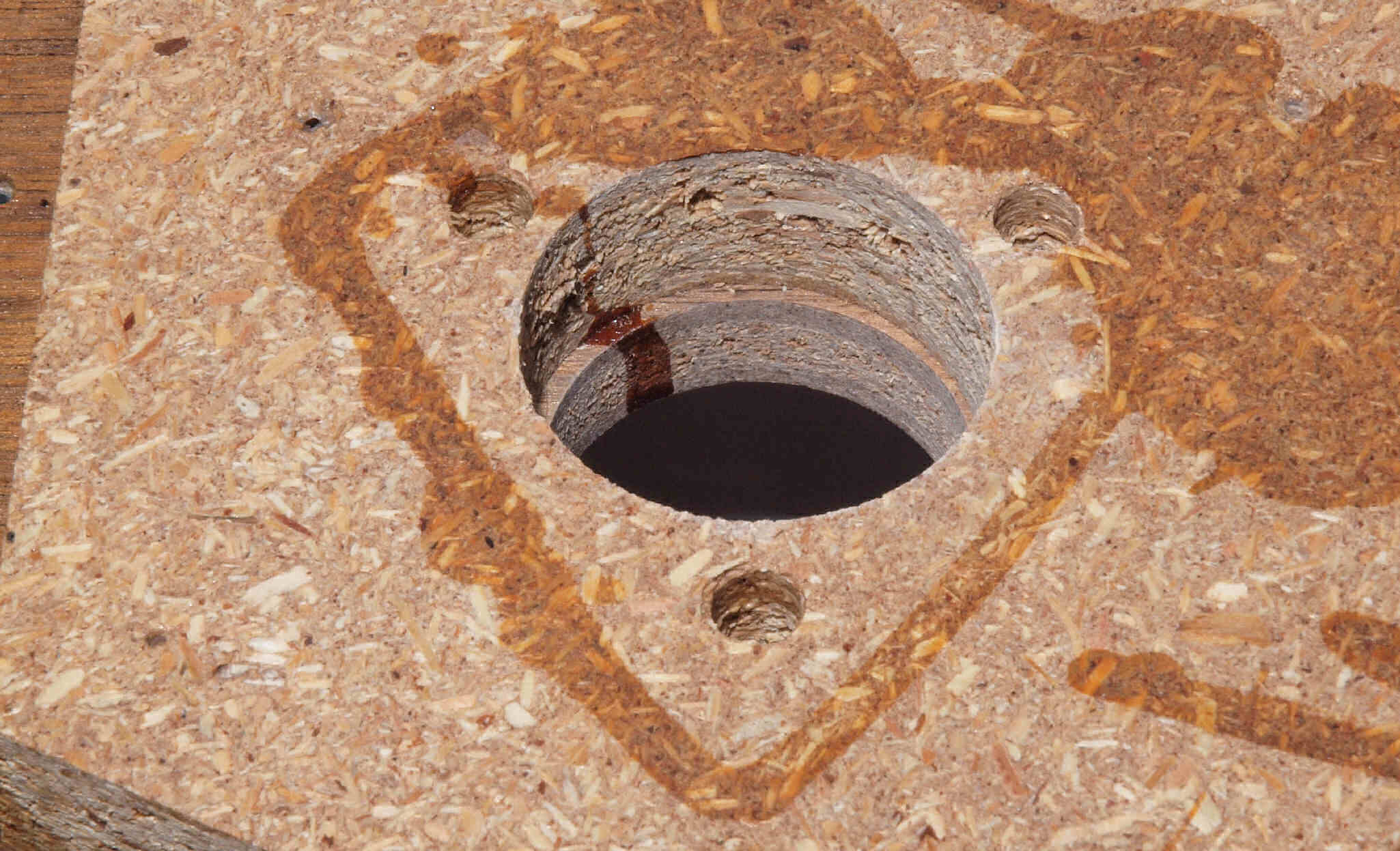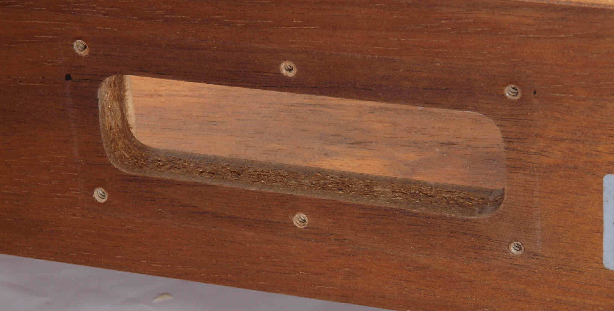 | W29. 修理後 アーム取付穴、反対側。 乾燥後さらにウレタン塗料を塗る。 | ||||||||||||||||||||||||||||||