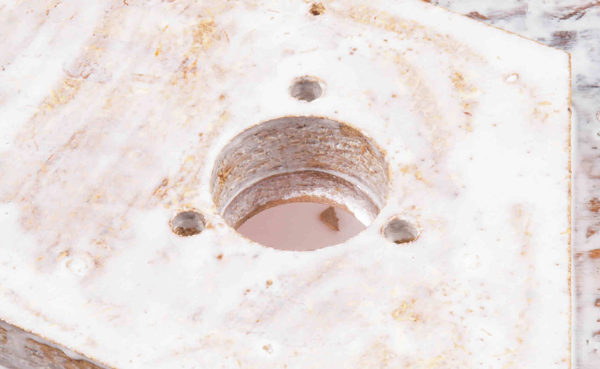 | W2B. 修理後 アーム取付穴表、反対側。 乾燥後さらにウレタン塗料を塗る。 | ||||||||||||||||||||||||||||||