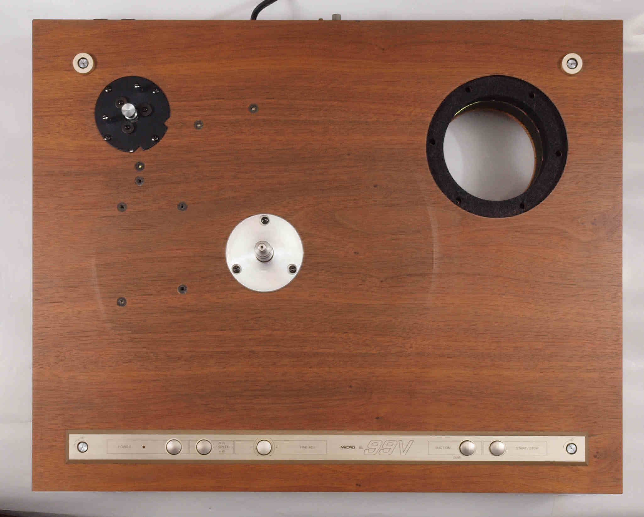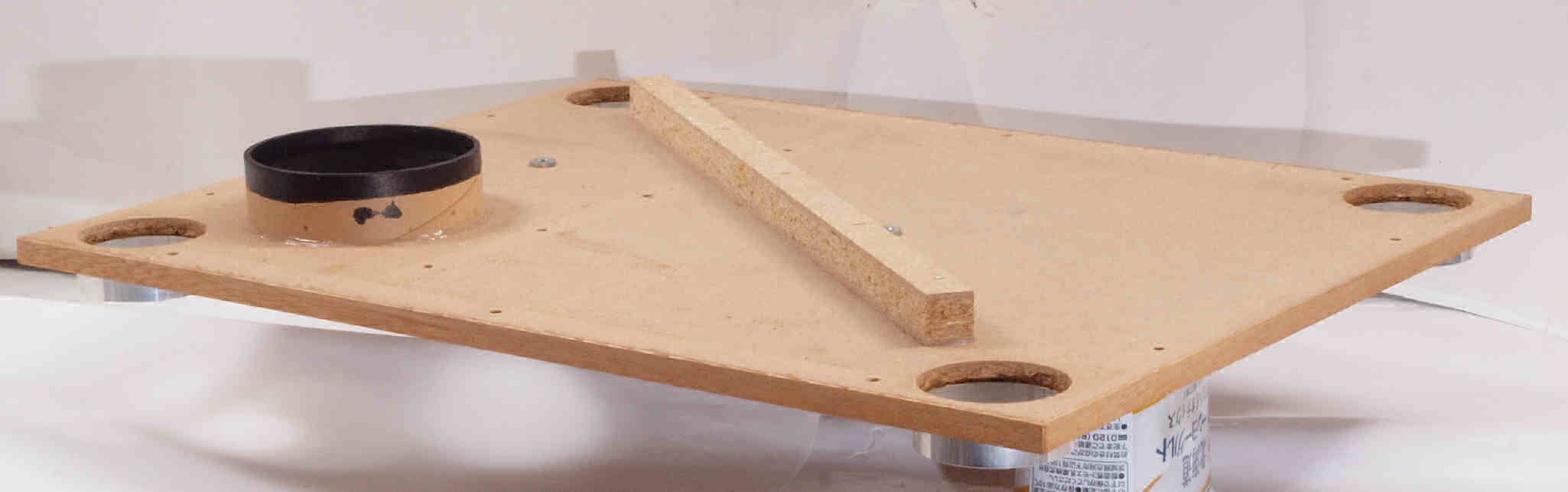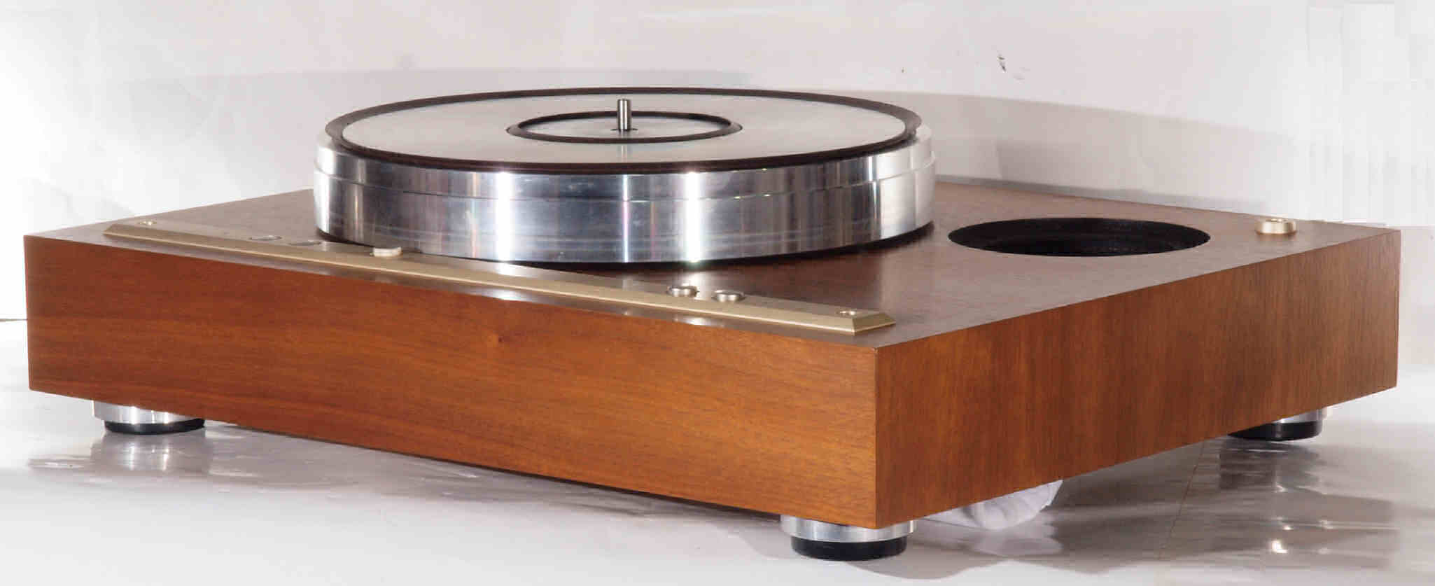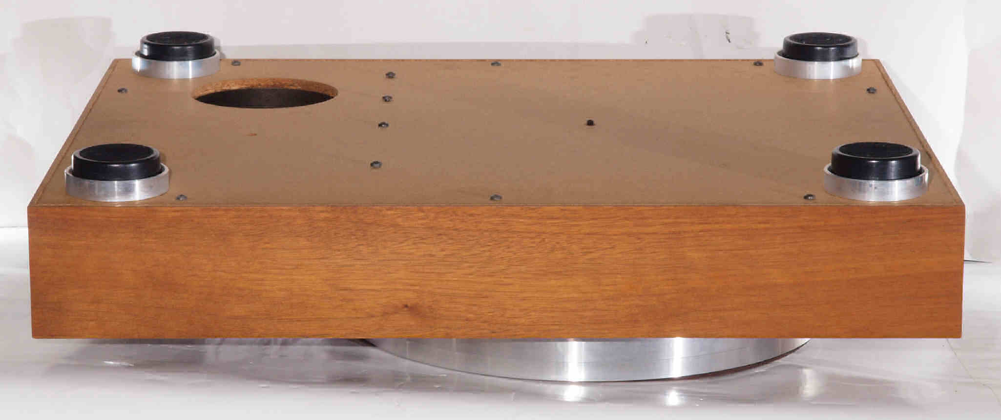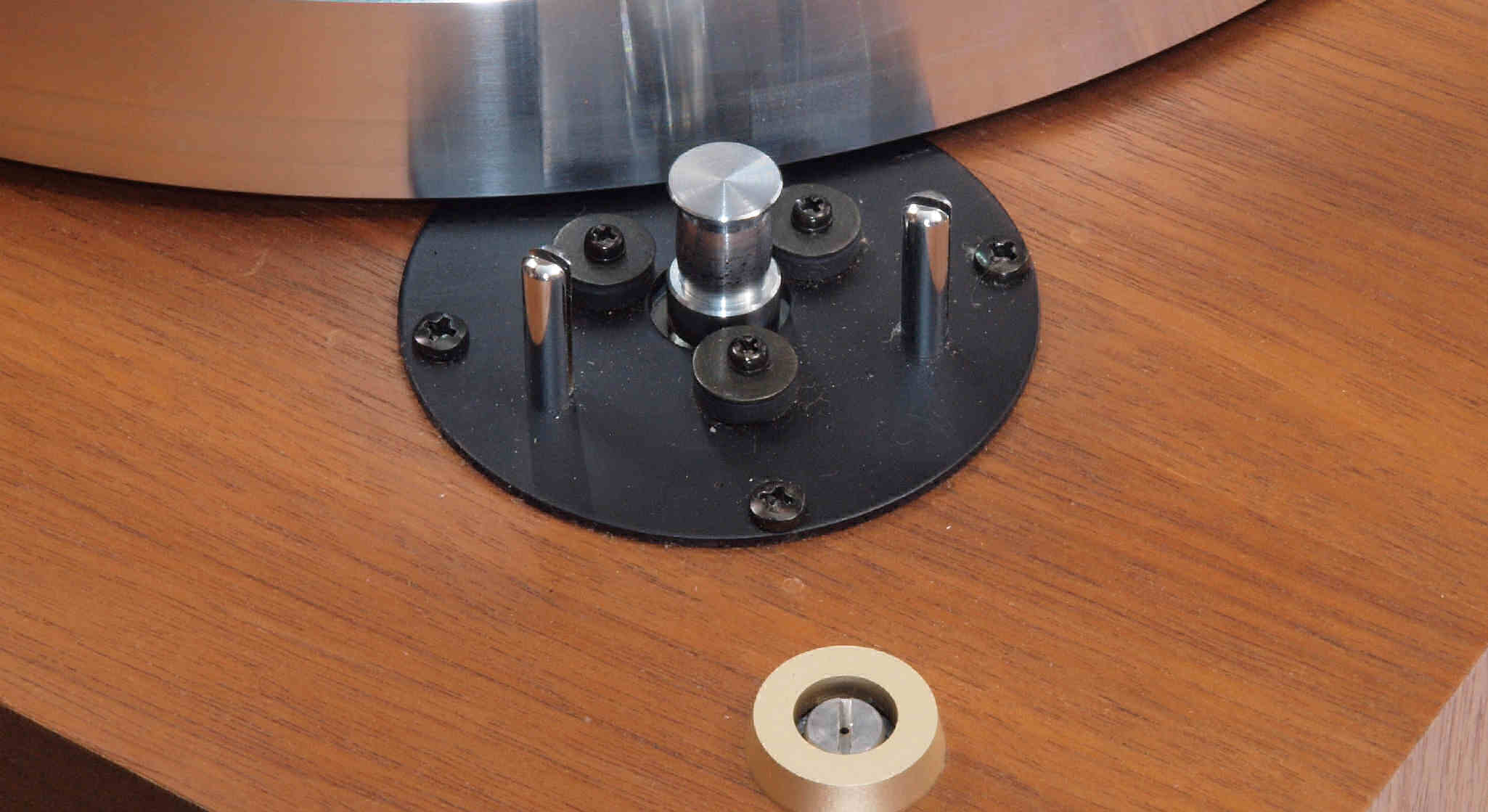| A16. 点検中 上から見る。ユーザはタンテーブル(プラッター)が外せないので「かいものを」入れて固定。 このタンテーブル(プラッター)がアルミ製で軽いので、軸への負担は少ない。 |