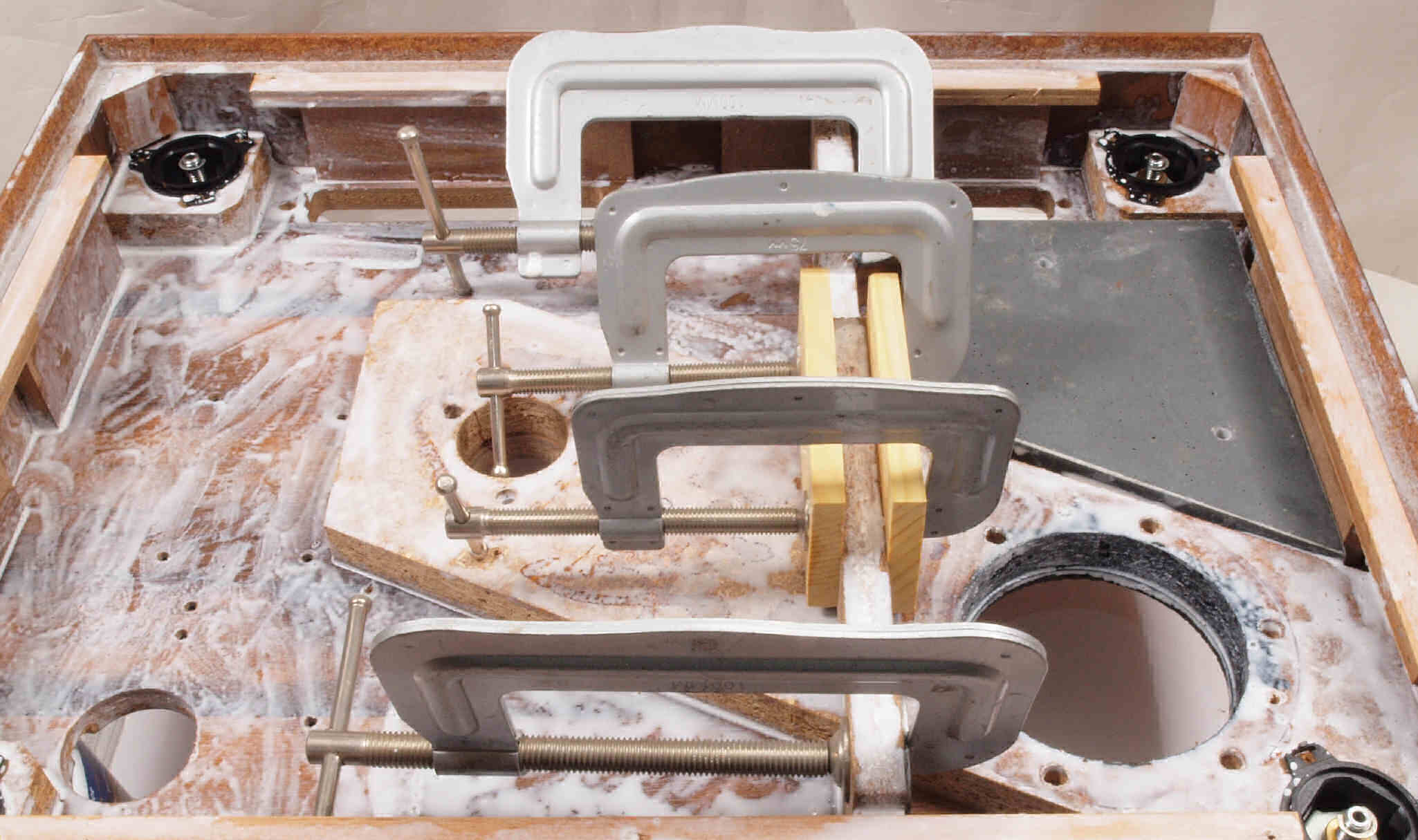 | W12. 修理中 本体木枠下。 補強の圧縮材の割れ目にボンドを染みこませ、シャコ万力で固定する。 | ||||||||||||||||||||||||||||||
