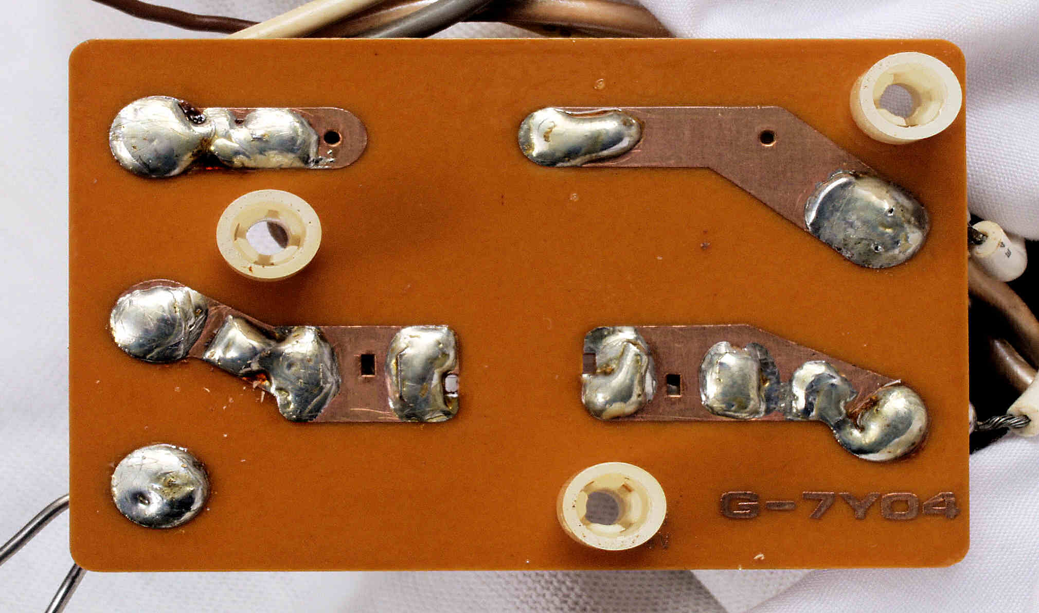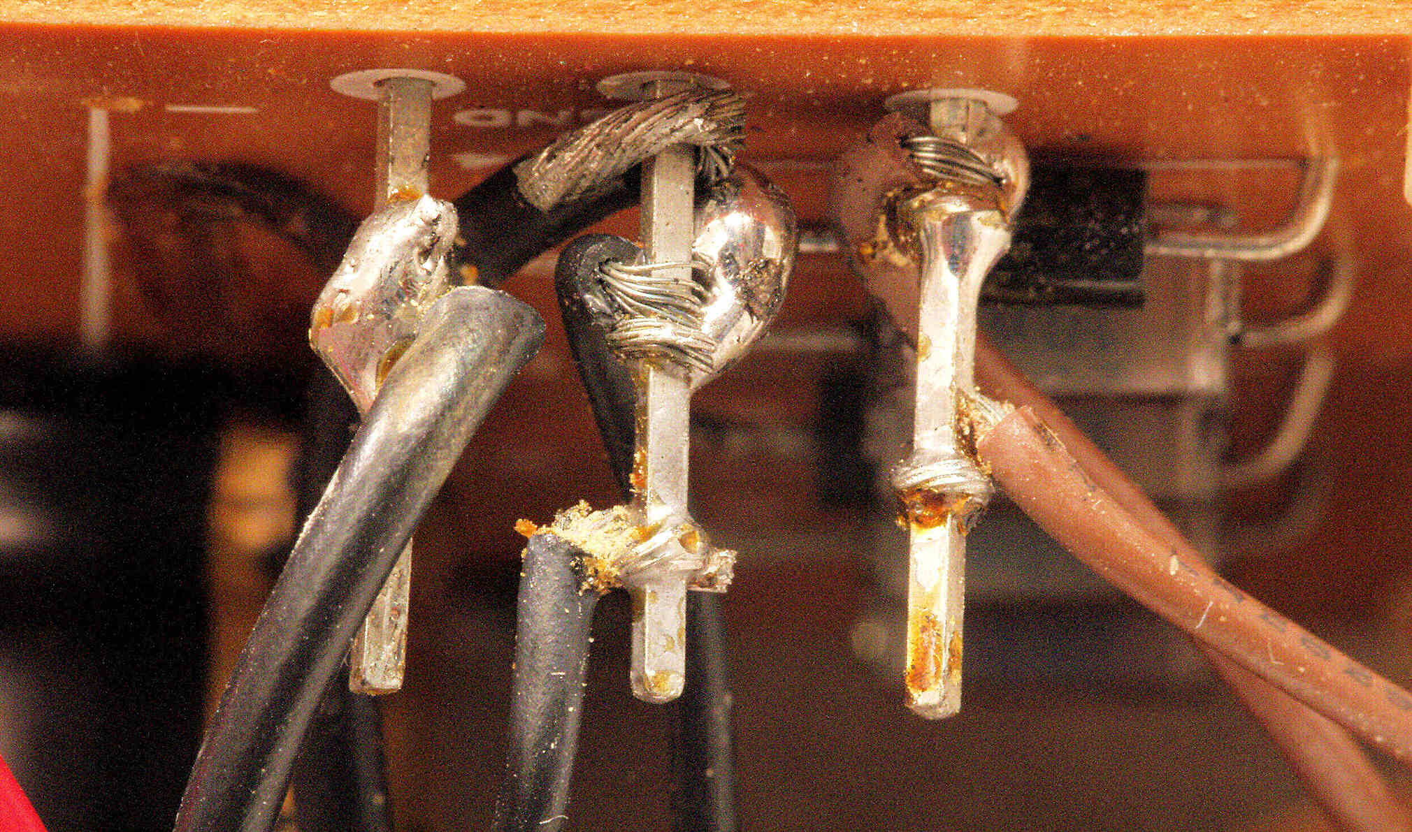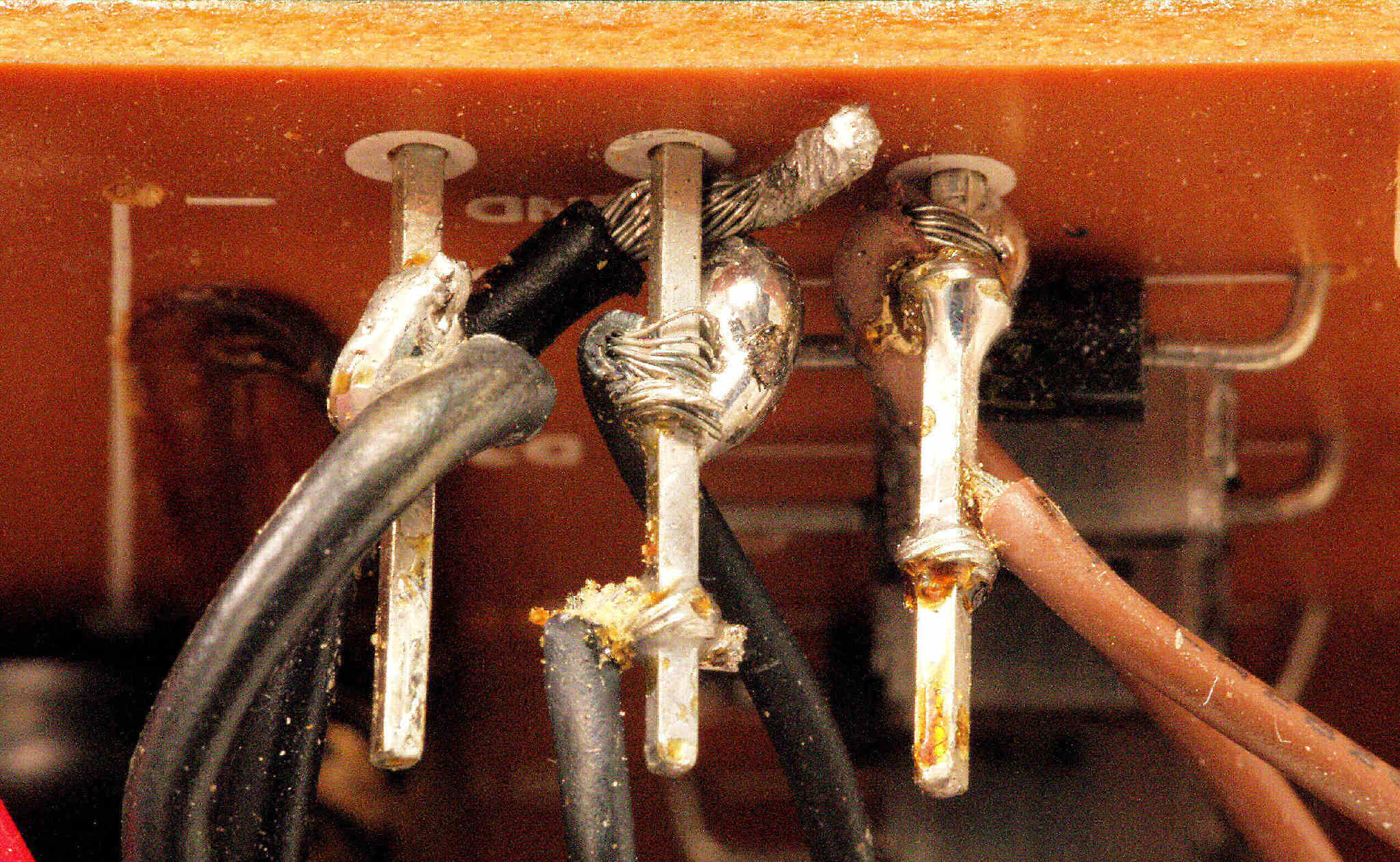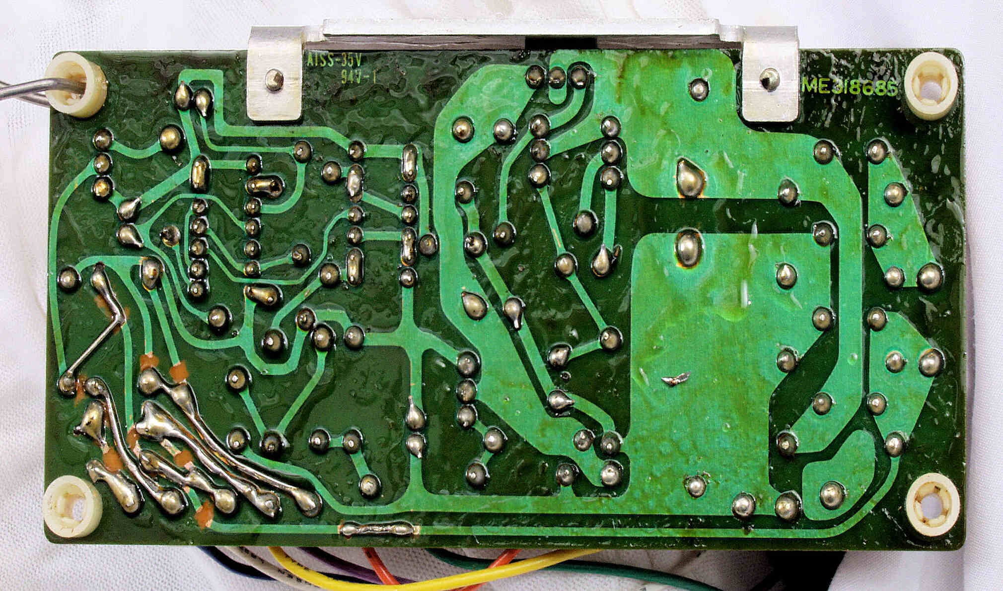 C2A−1. 修理中 電源・33/45切替基板、半田が染み込んでいない引き出し(配線)線。