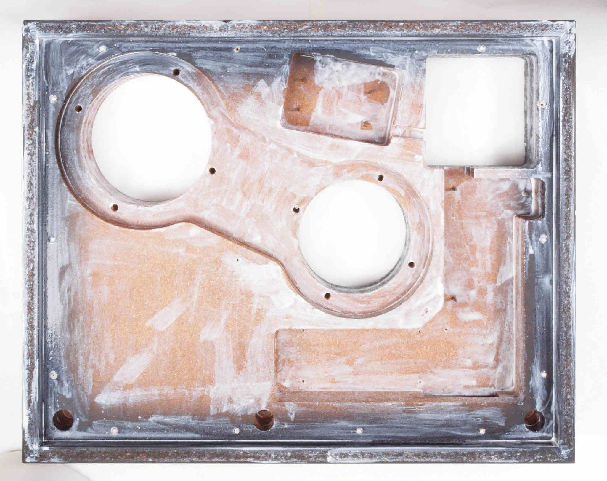 W76. 修理前 電源ソケット、端子板取付け穴、反対側。 乾燥後さらにペンキを塗る。