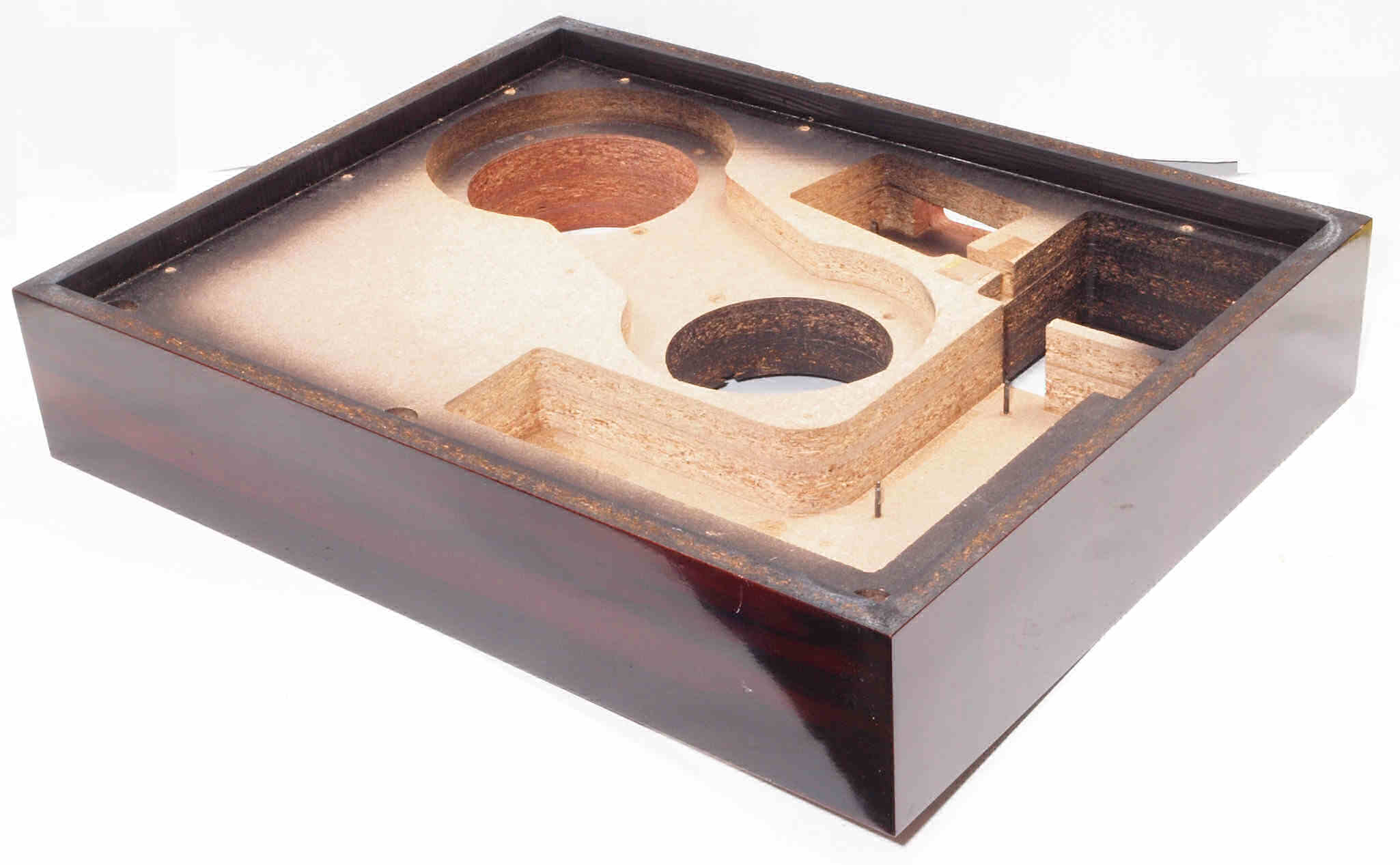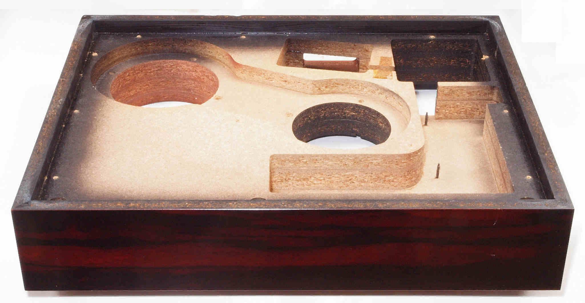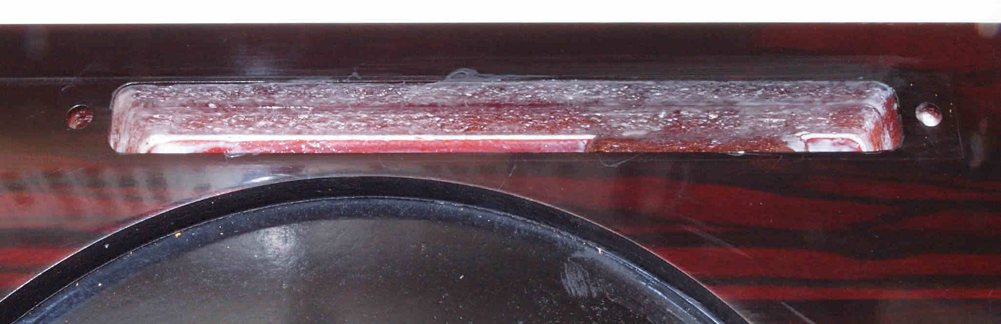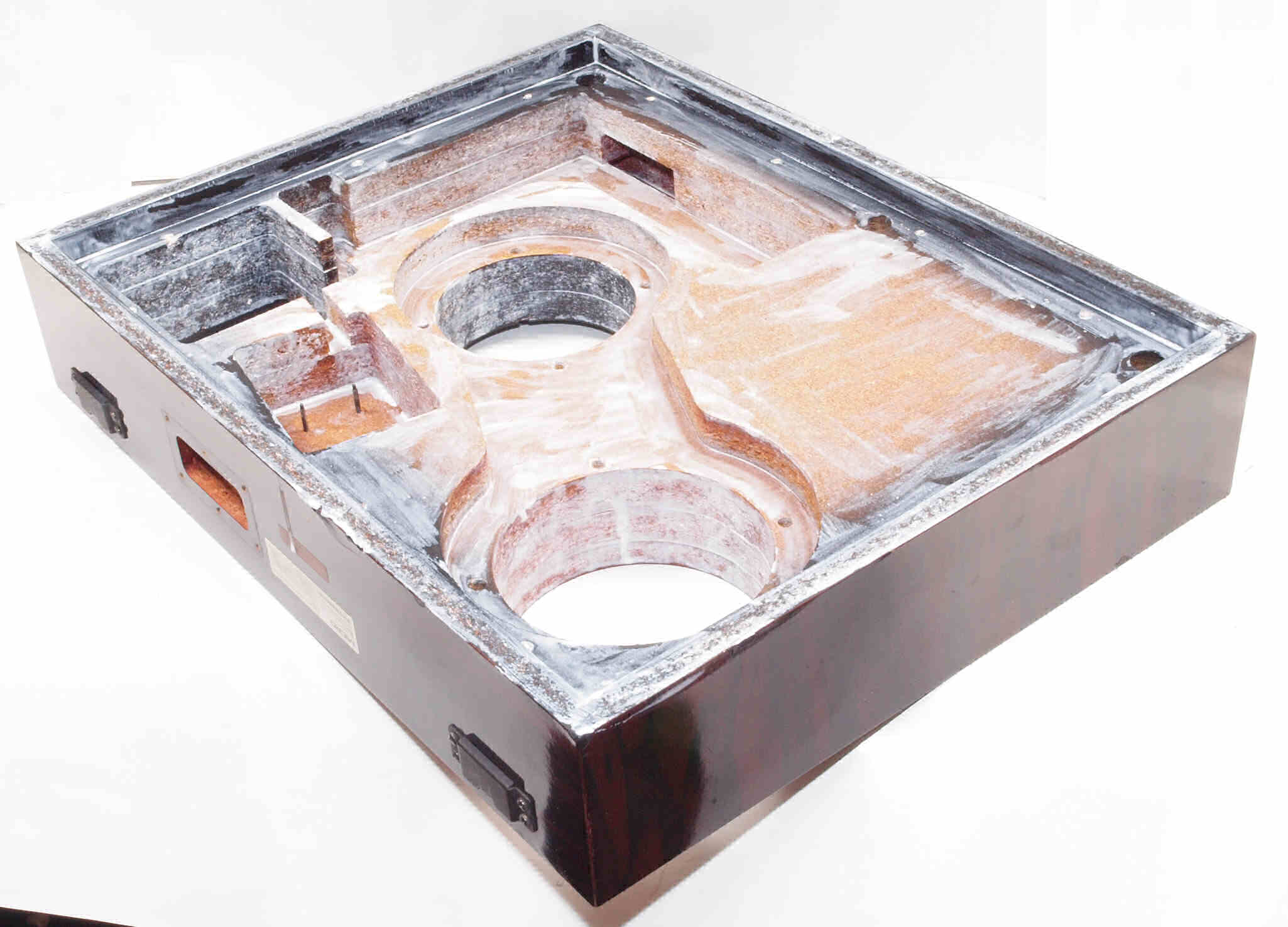 W62. 修理中 本体木枠下前。 圧縮材にボンドを染みこませる、ネジ穴も塗る。