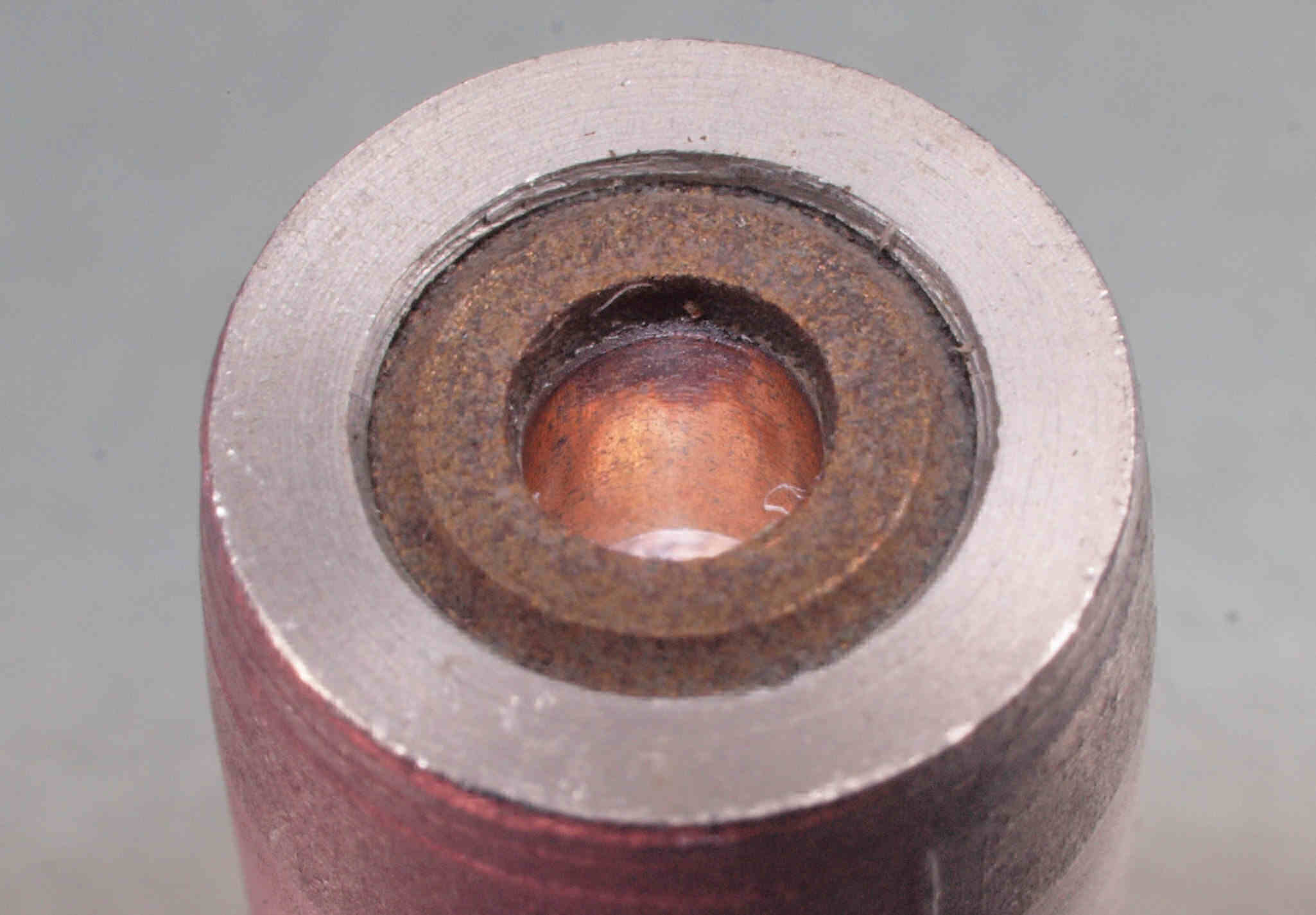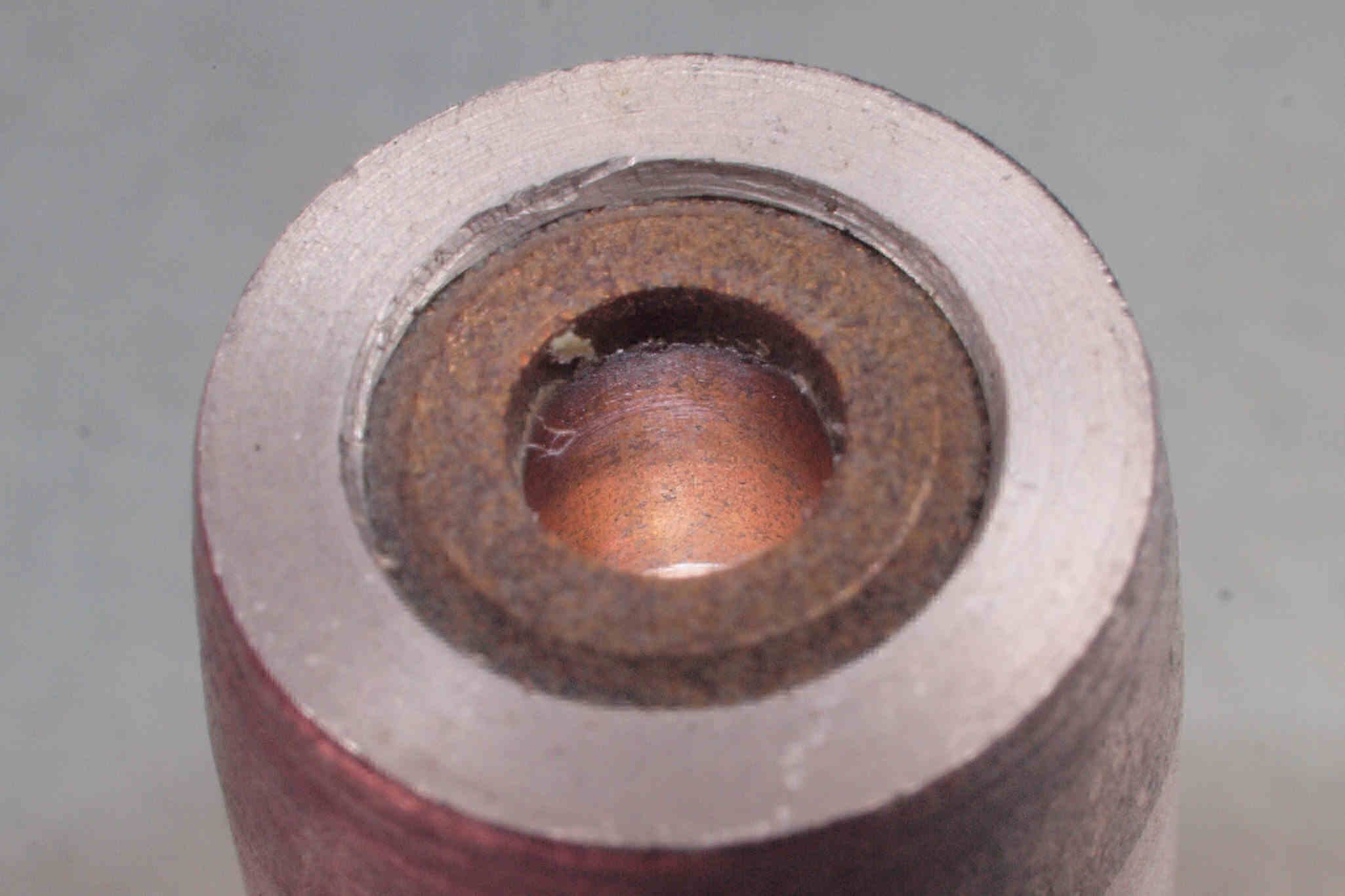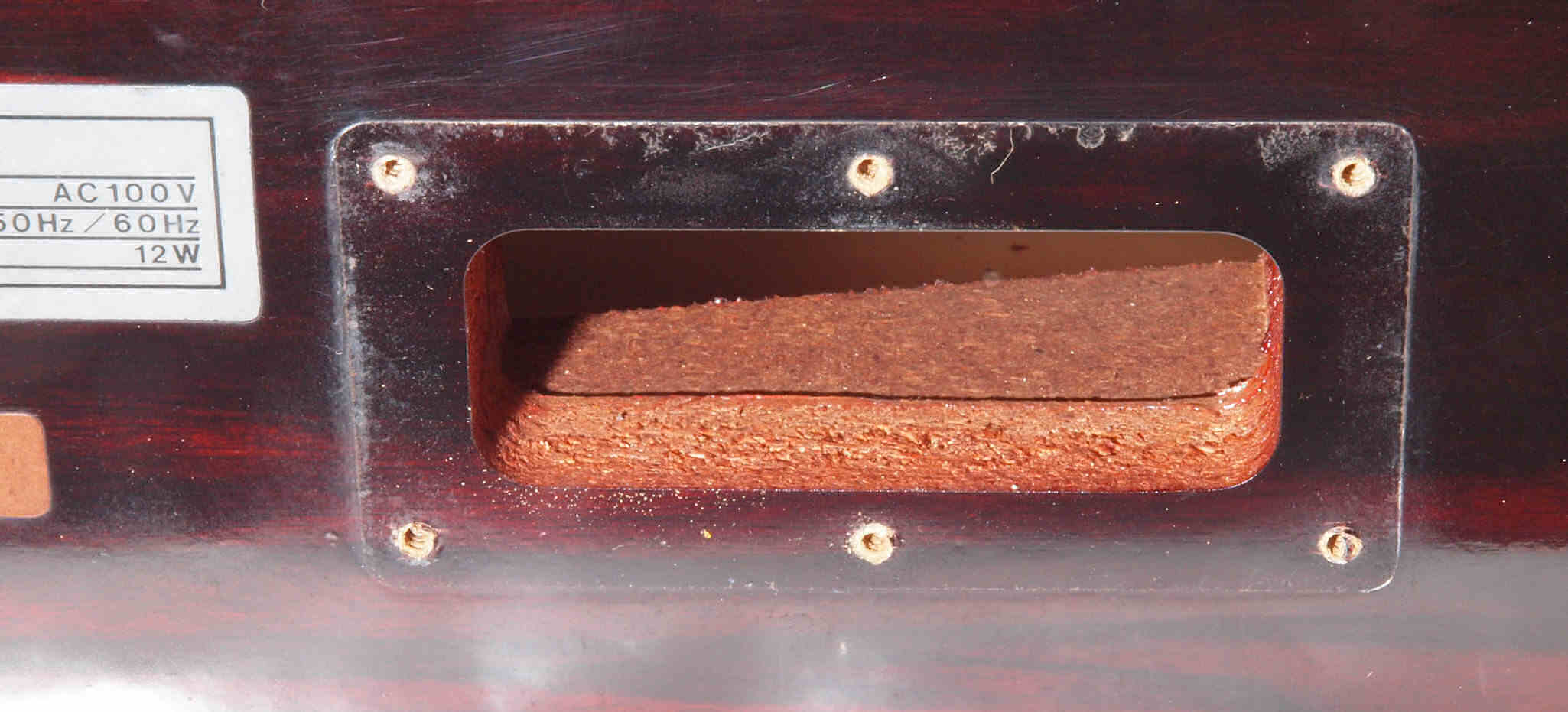 W75. 修理前 電源ソケット、端子板取付け穴、反対側。 圧縮材にボンドを染みこませる、ネジ穴も塗る。