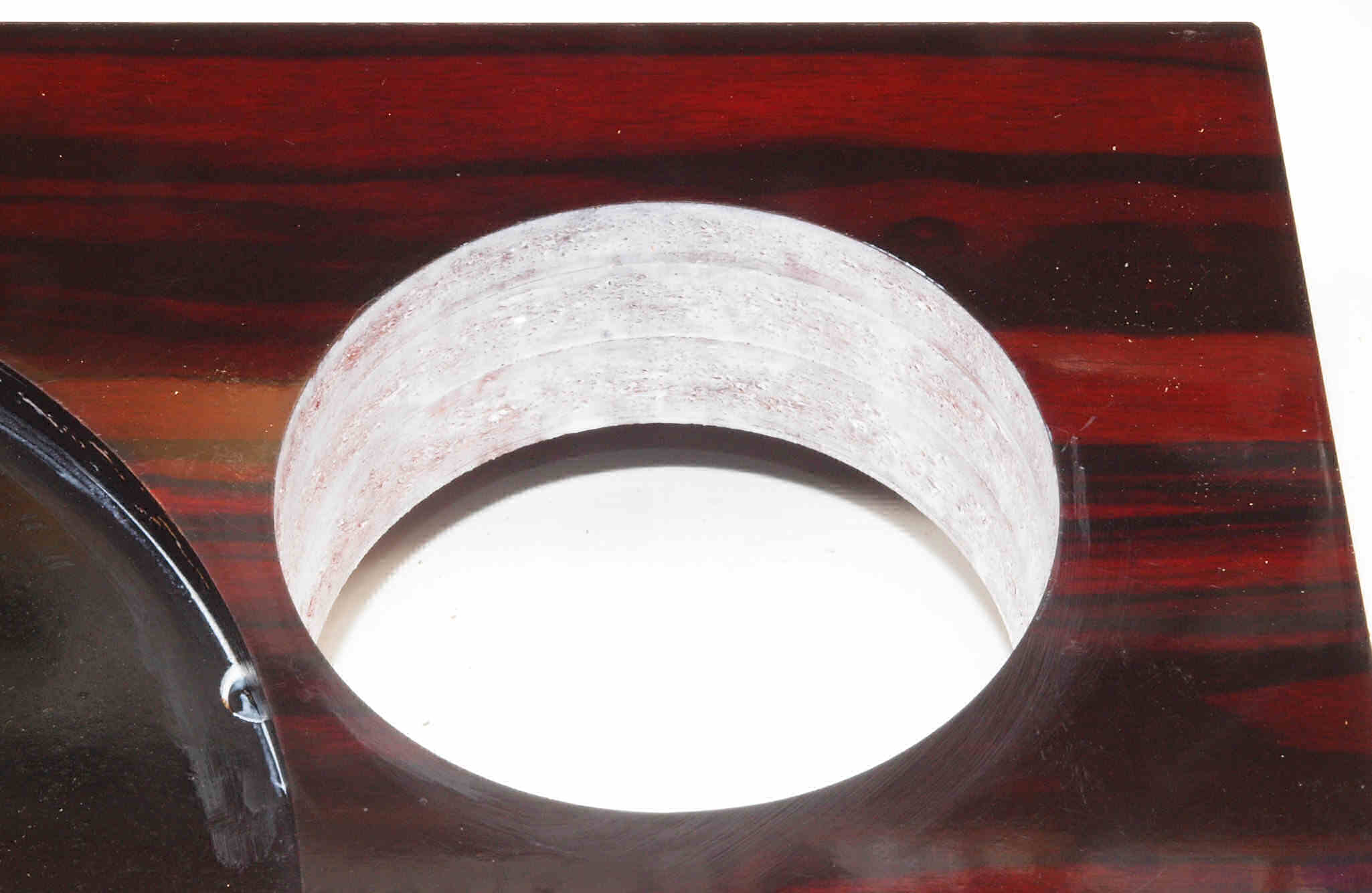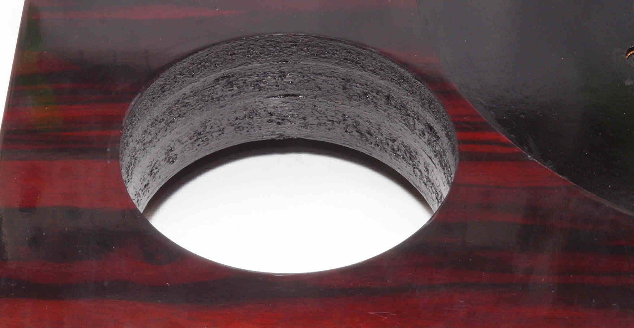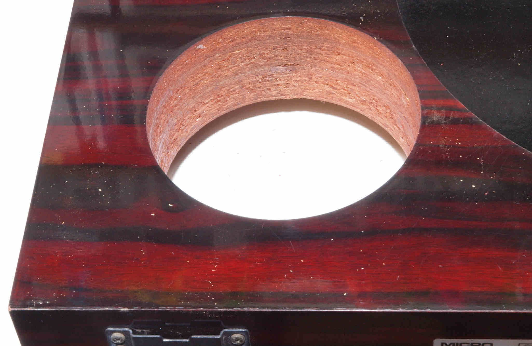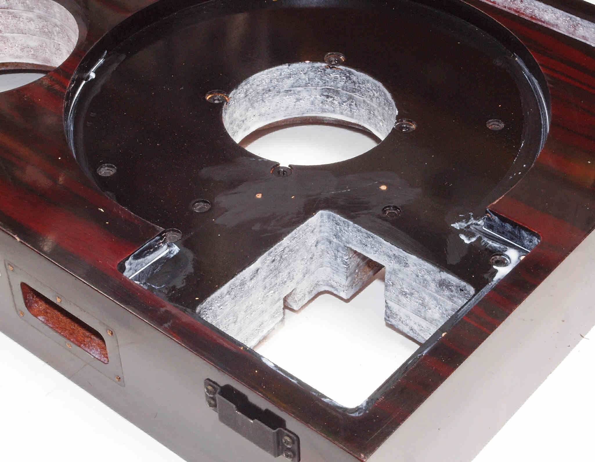 WB2. 修理中 下蓋のアーム取り付穴。ボンドを染みこませる、ネジ穴も塗る。