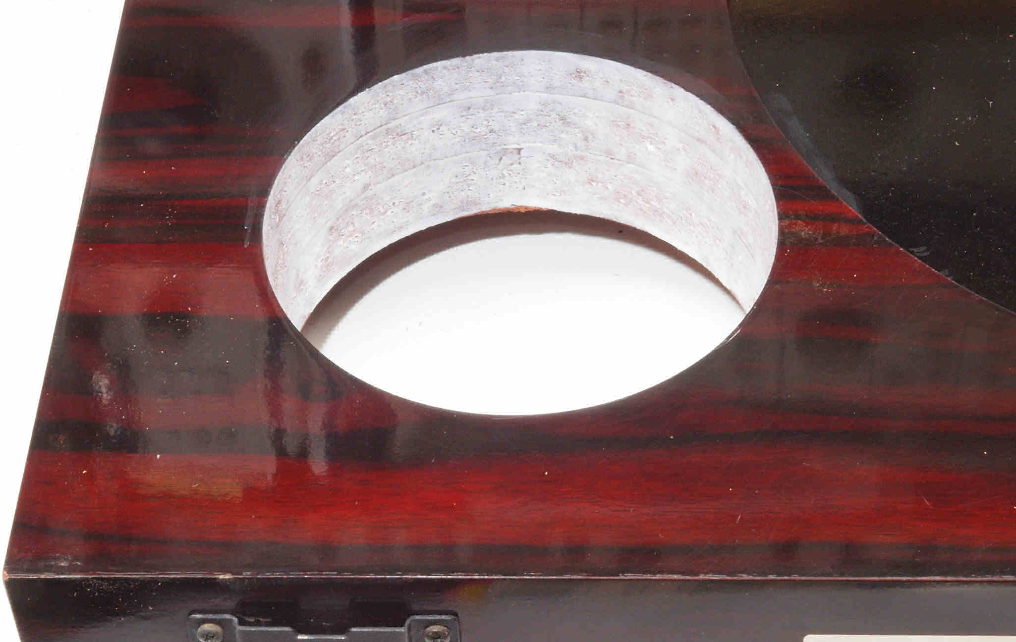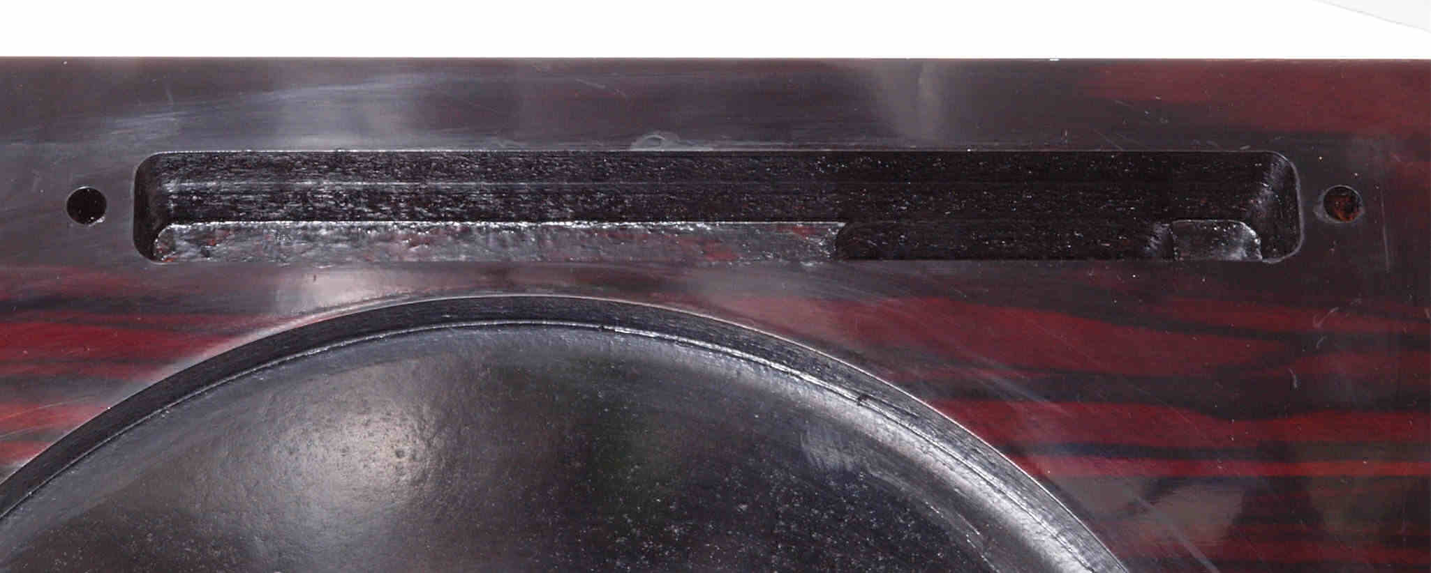 WC43. 修理中 下蓋のトランスカバー取り付穴、反対側。ヒビを接着剤で固定する。