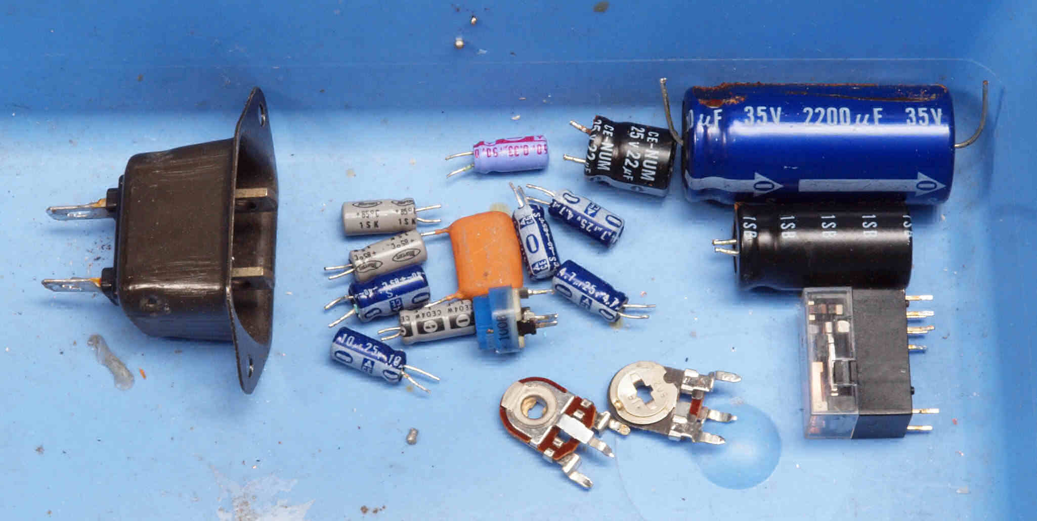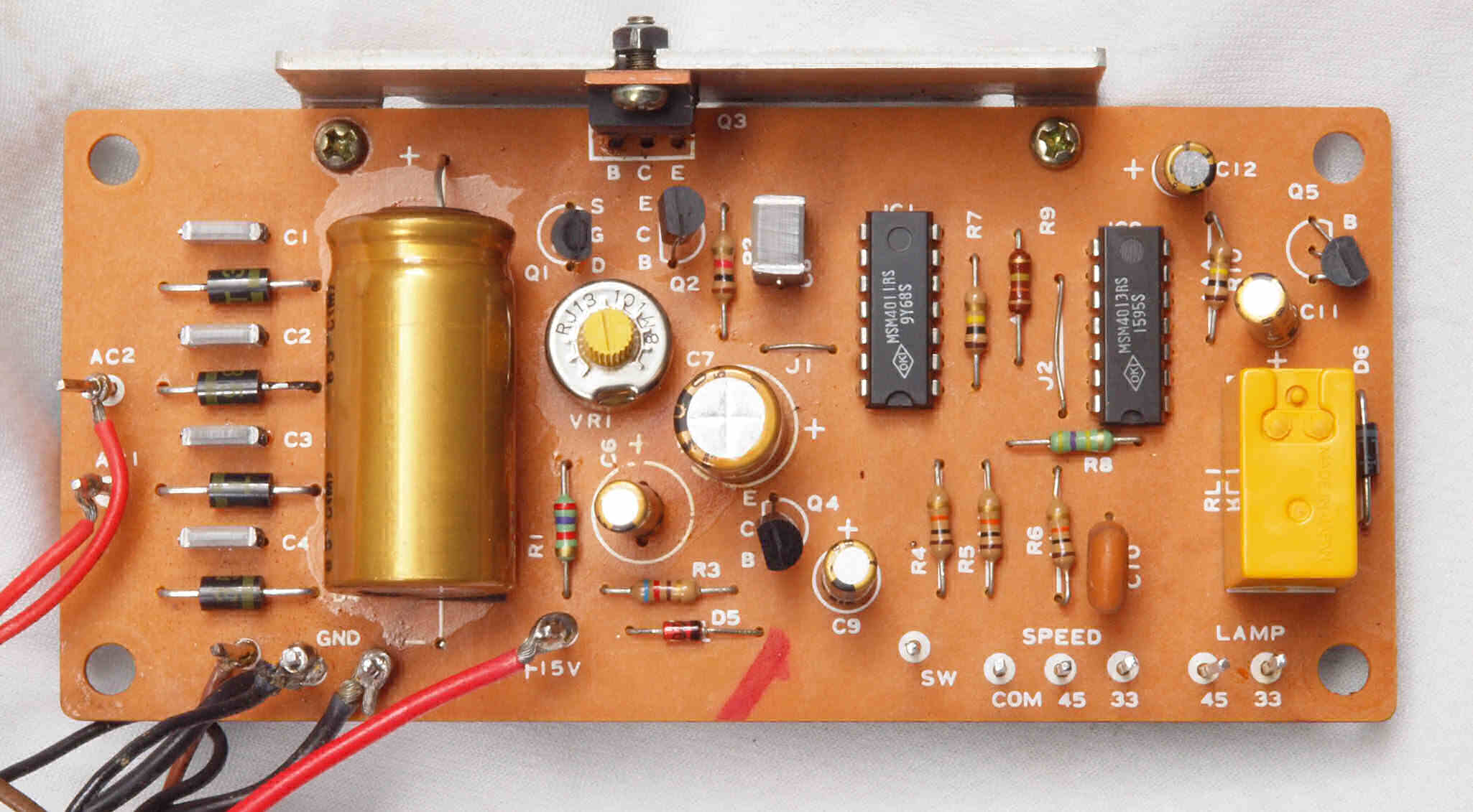 C24. 修理後 電源・33/45切替基板 半固定VR1個、電解コンデンサー6個、製造中止で入手難のリレー1個交換