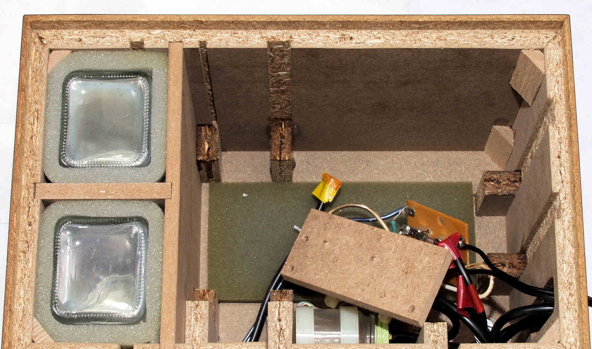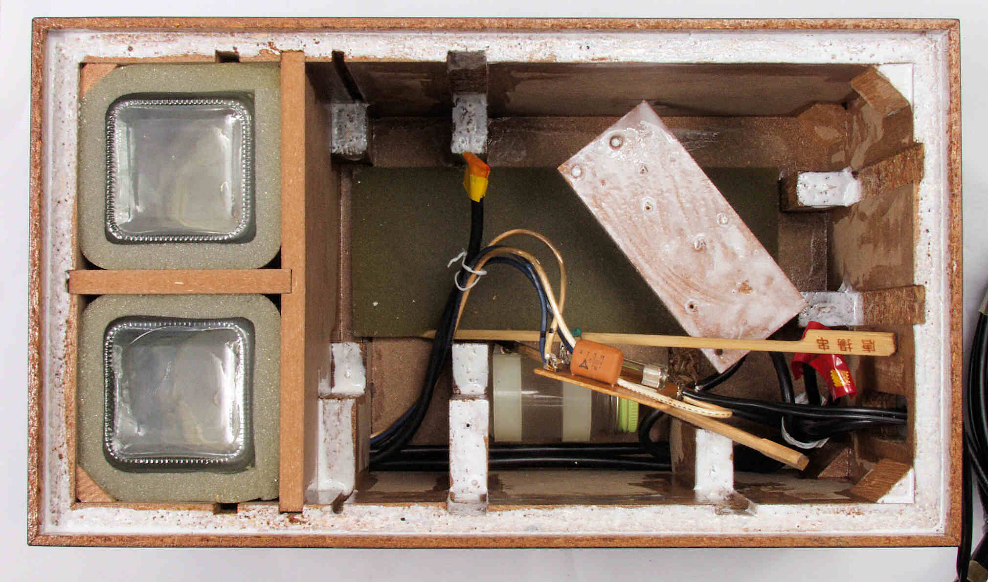 C61. 修理前 接着材が劣化した木箱圧縮板右側。