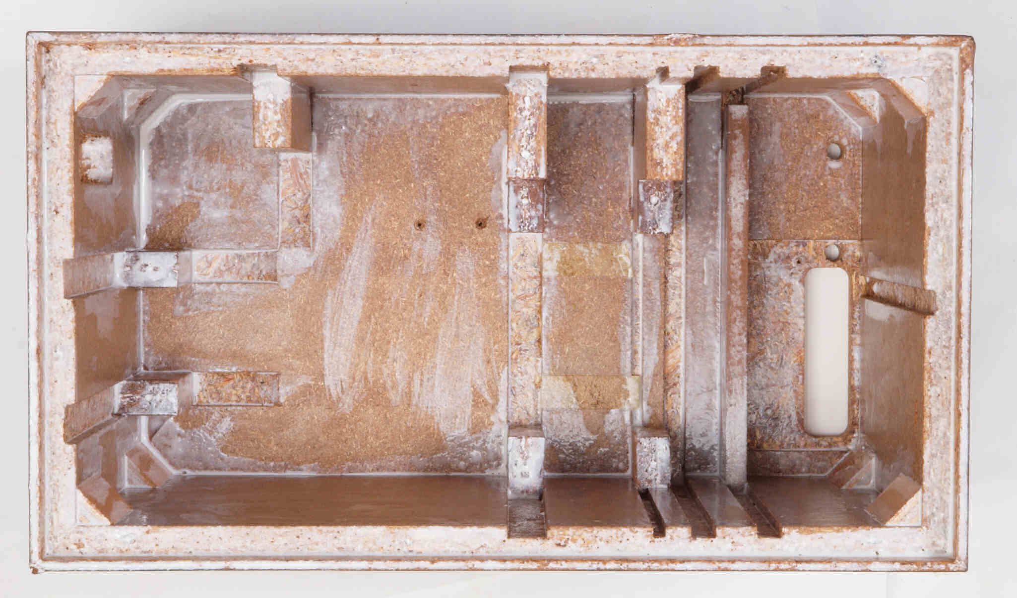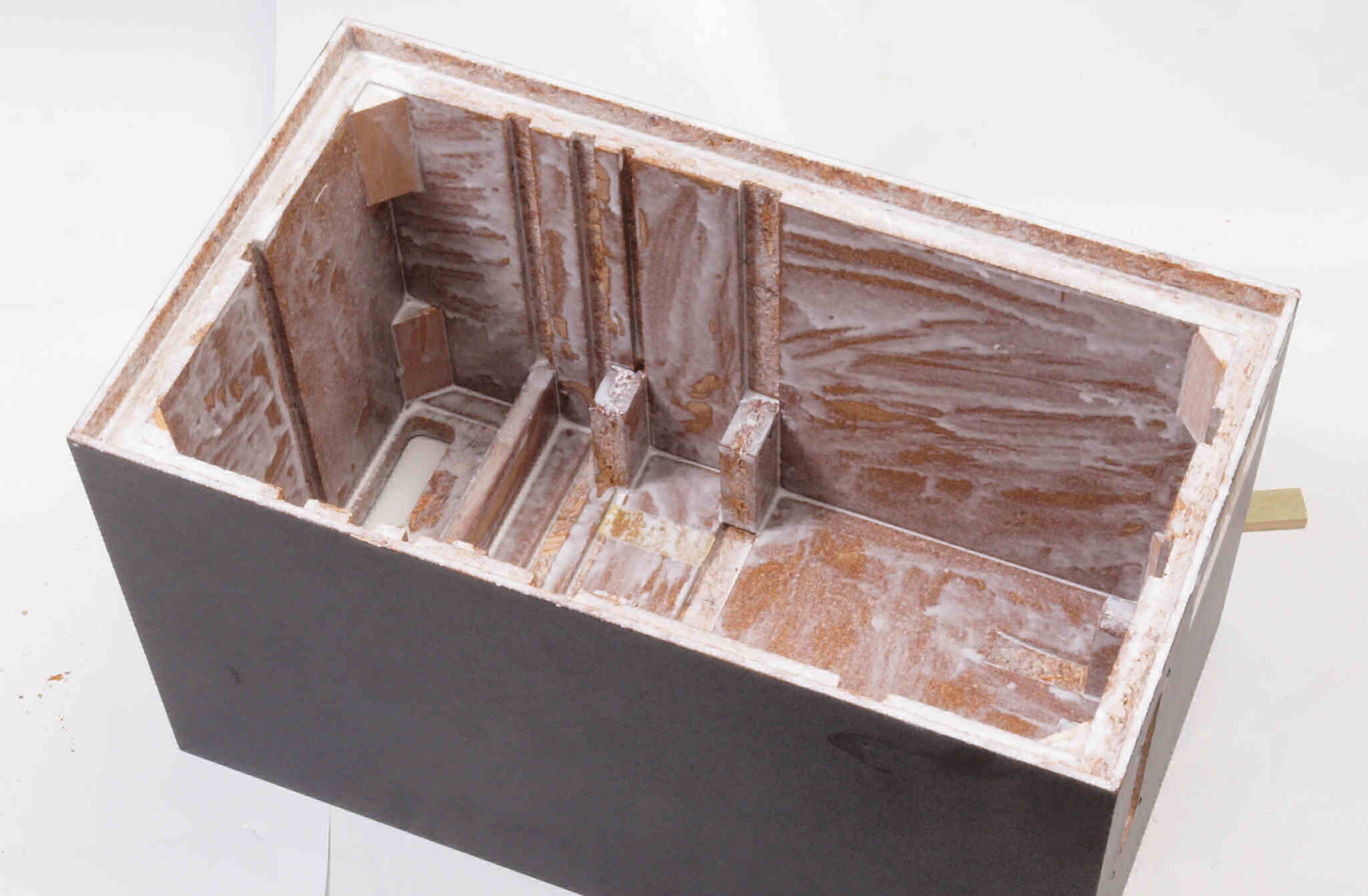 C48. 修理前 接着材が劣化した木箱、下後左から見る。